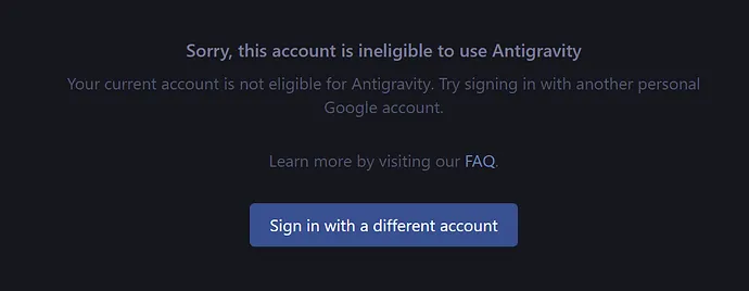 You try to sign in to Antigravity and see “Your current account is not eligible. Try signing in with another.” On one device it worked before, but after signing out you’re blocked everywhere. This points to an account-level eligibility check, not a device issue.