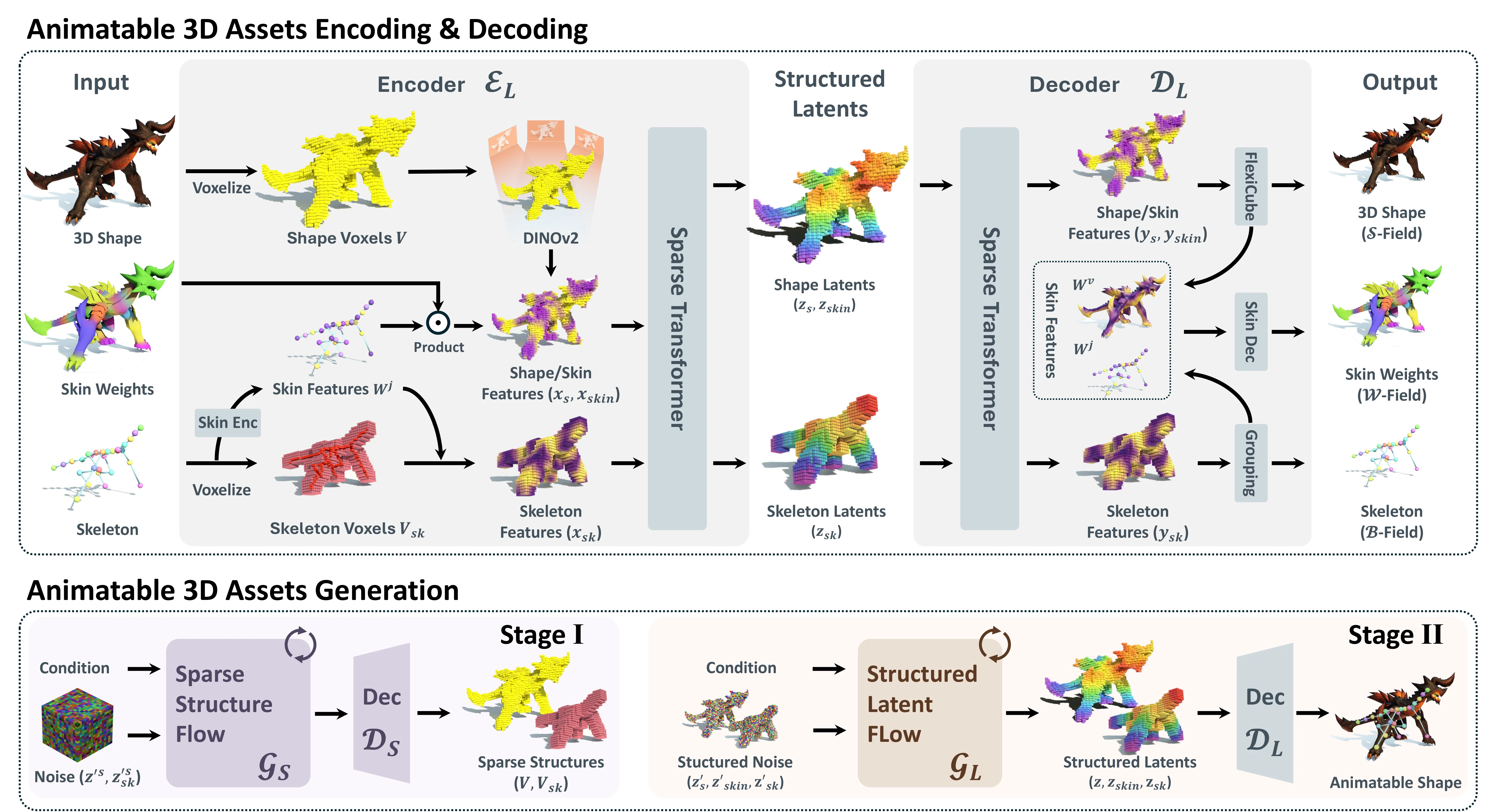 AniGen runs in two stages. First it makes a sparse scaffold that captures the big structure. Then it fills in dense geometry and full articulation.