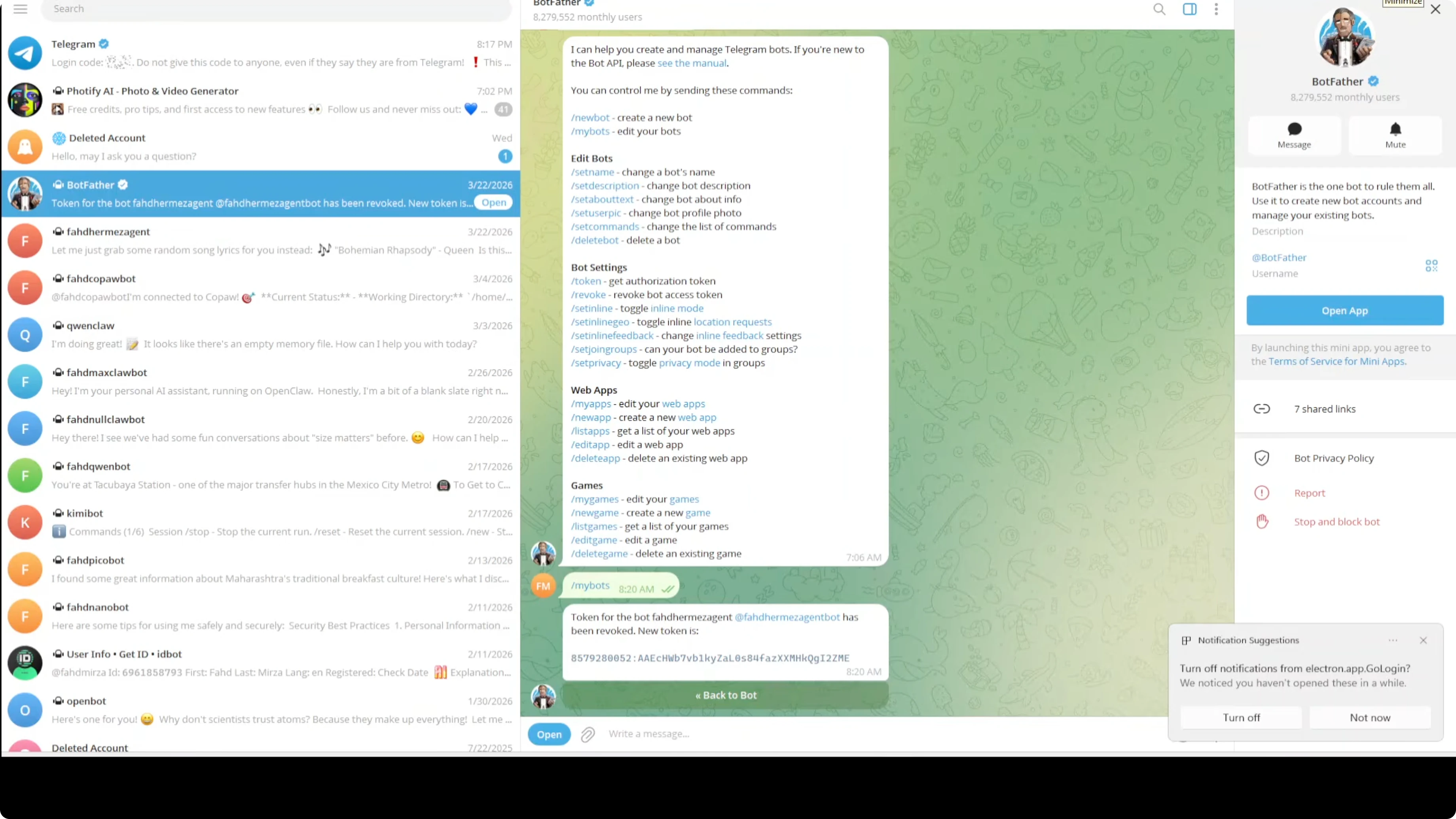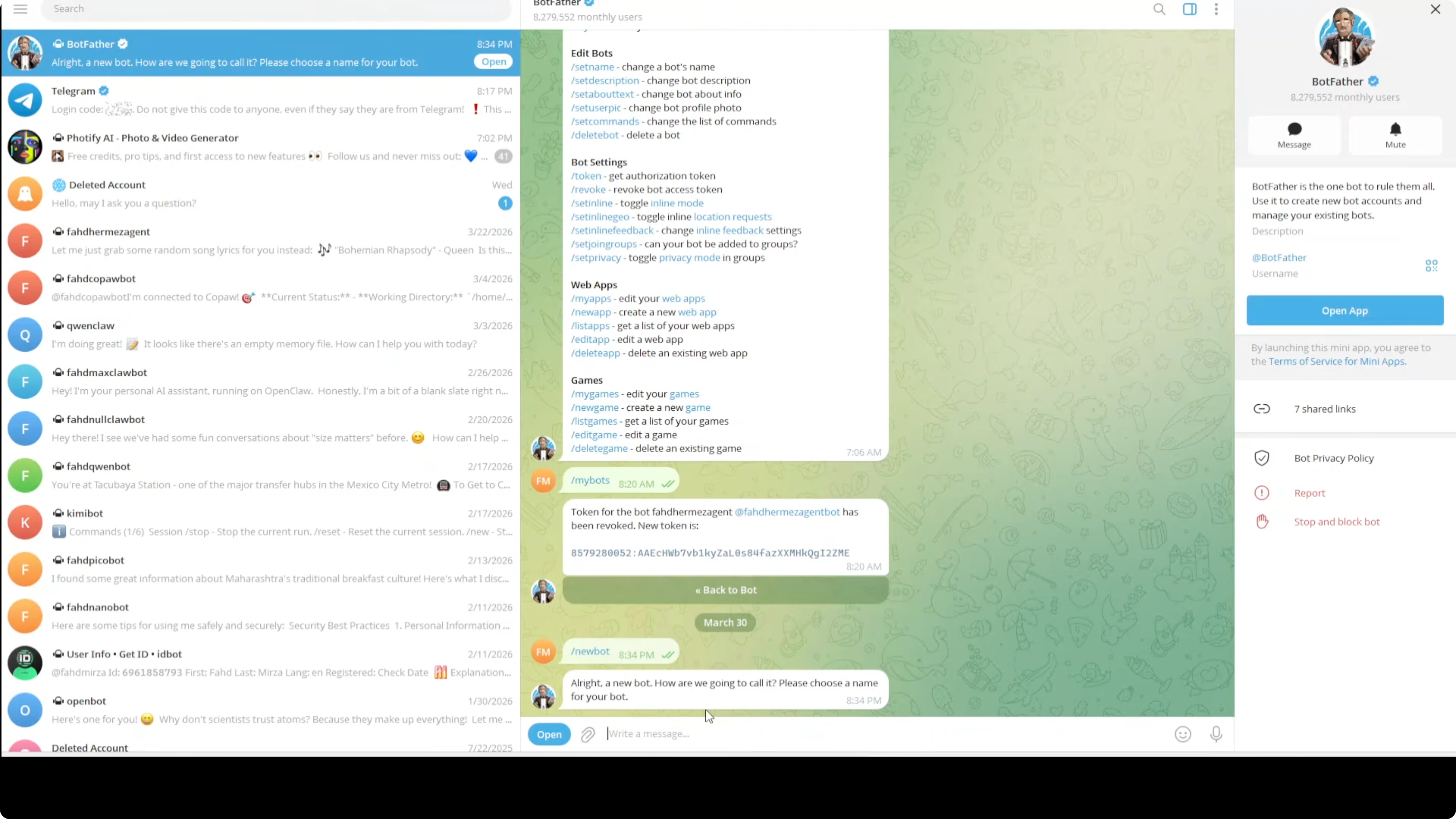 Telegram requires a bot token. In Telegram, open @BotFather and create a new bot by sending the command below.