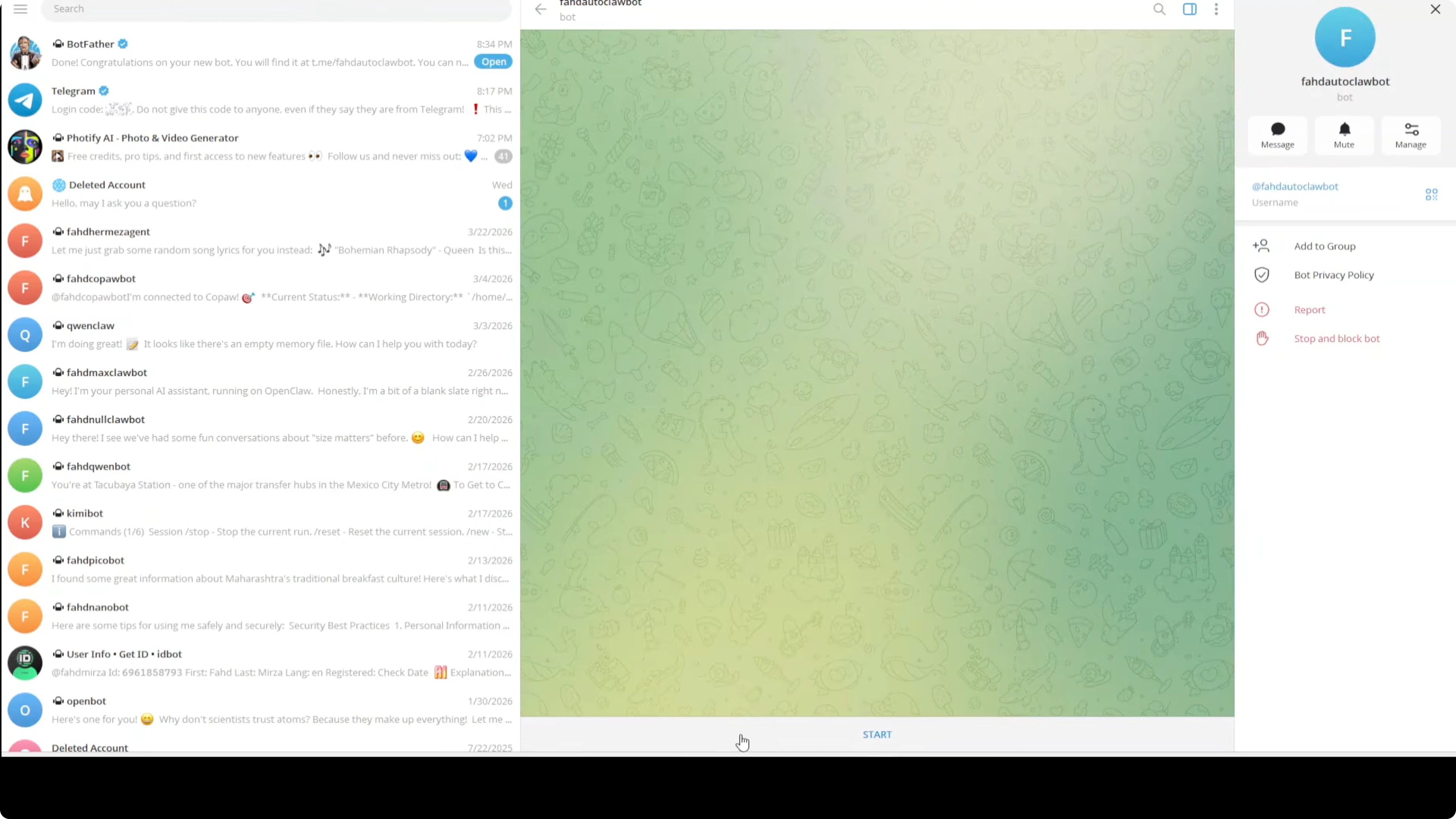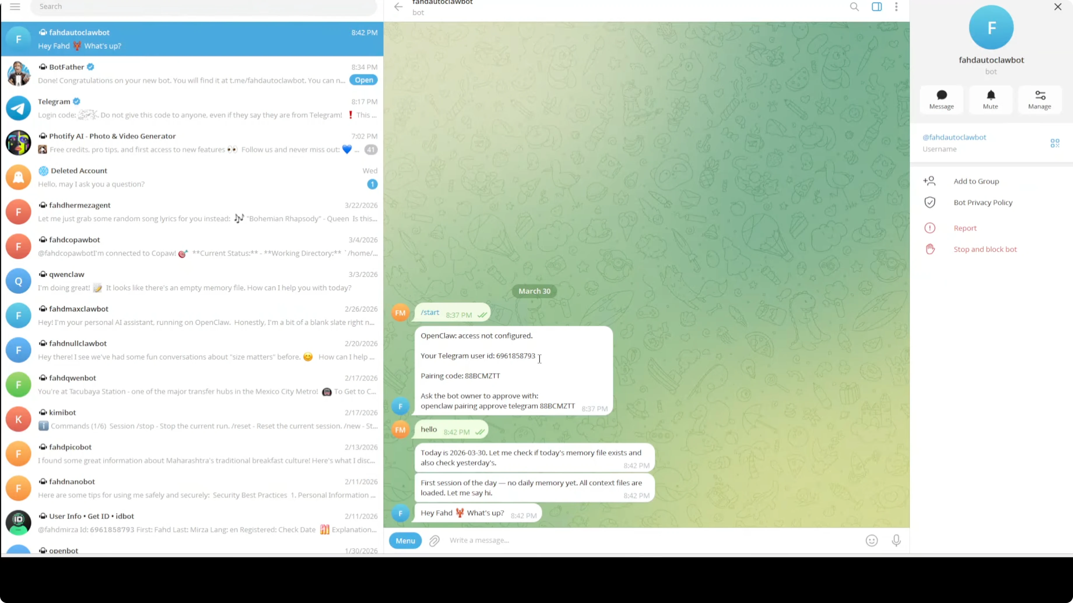 Start the new bot in Telegram by opening it and tapping Start. You will receive a pairing code from the bot.