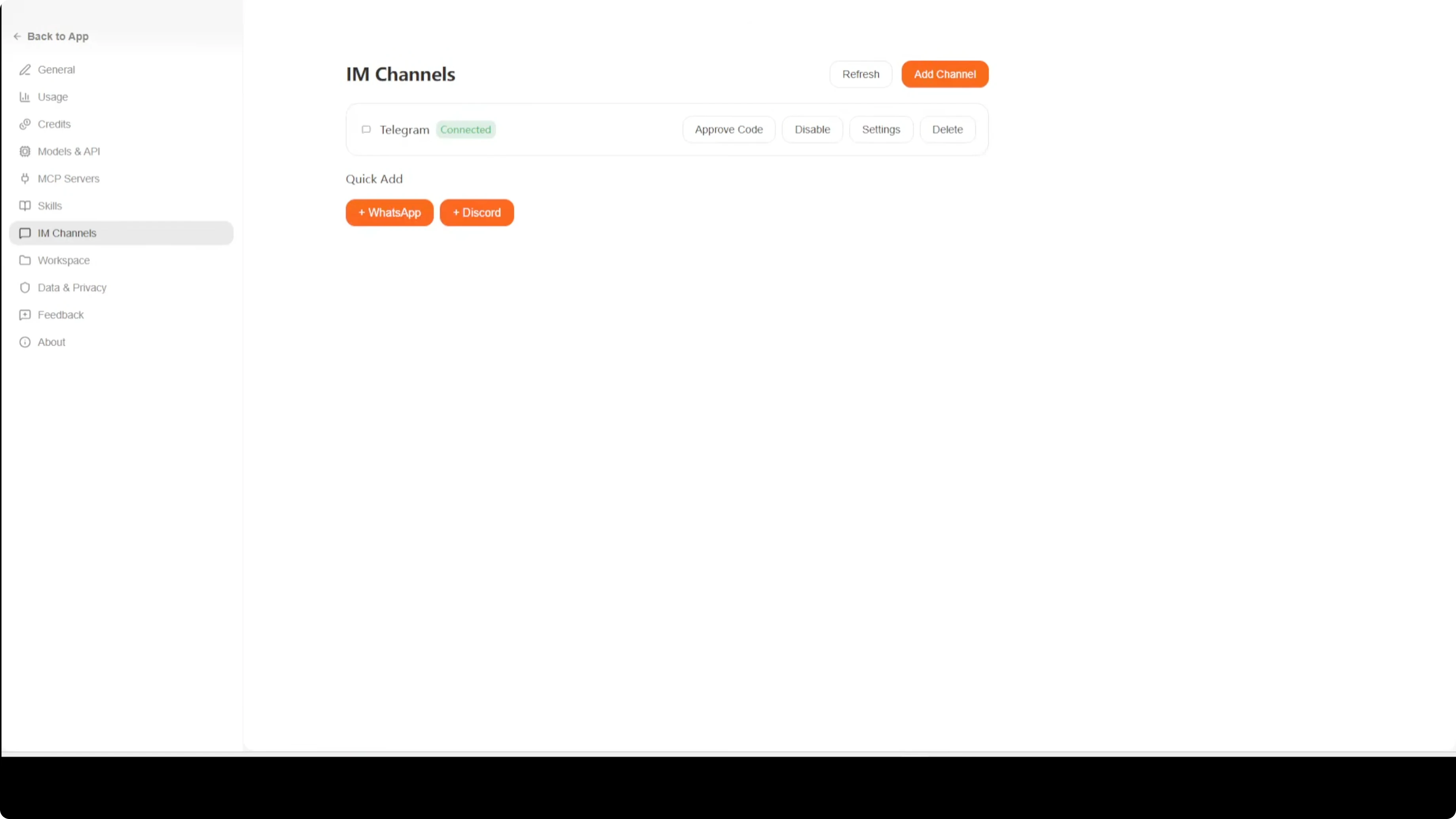 On the left side, you will find multiple built-in agents for different use cases. You can connect IM channels like Telegram and others, and you can set up scheduled jobs.