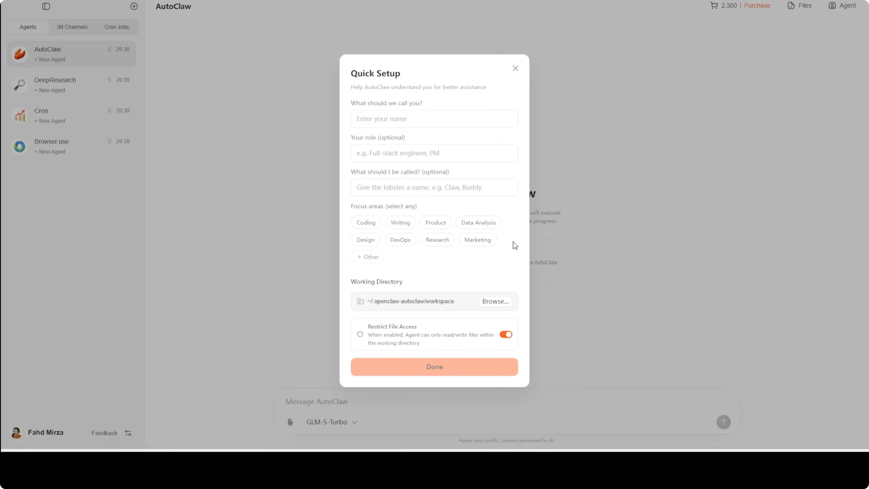 Set a working directory for file operations. AutoClaw includes file access restrictions to reduce risk, but you should still understand the security implications before granting broad access.