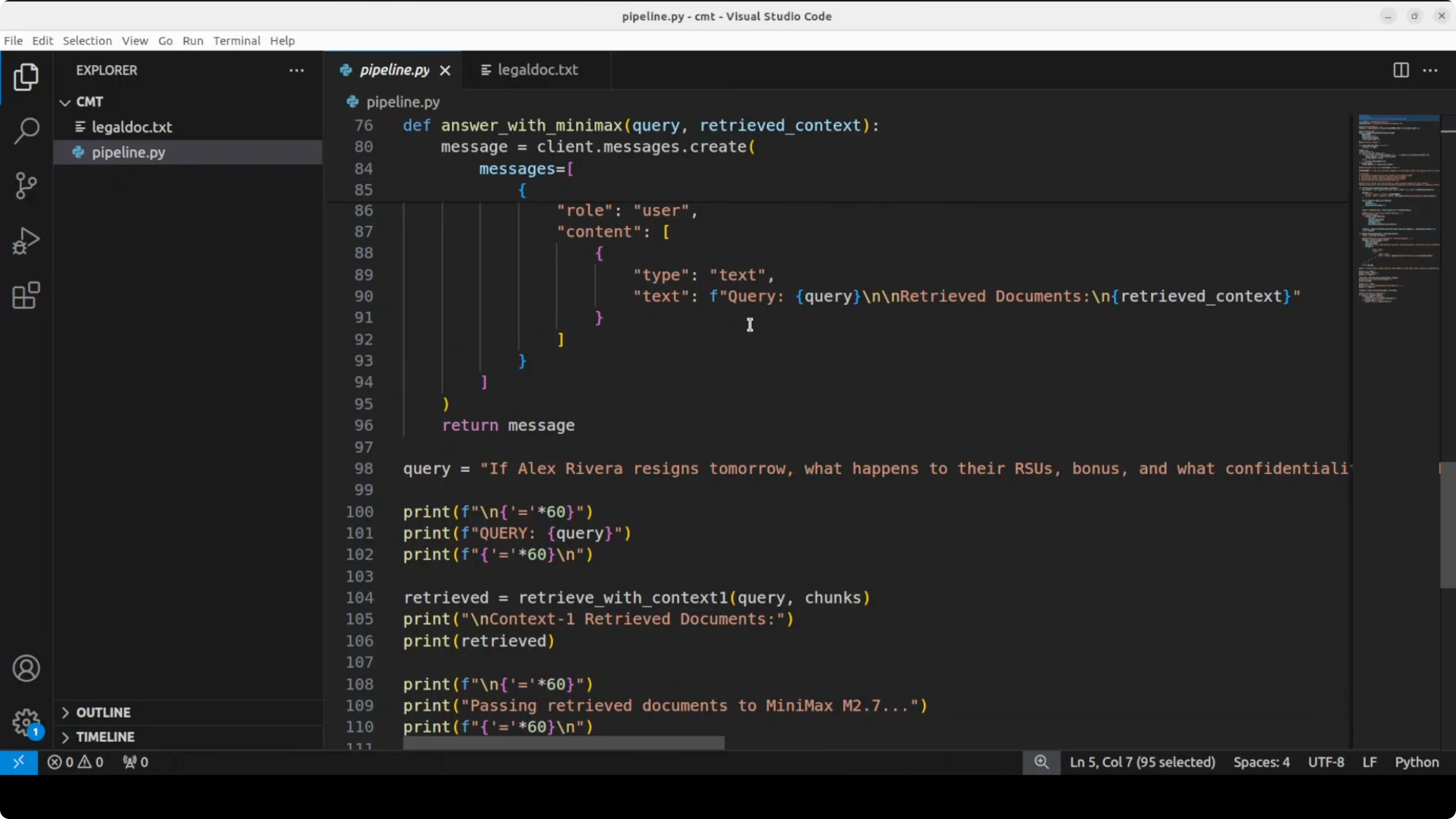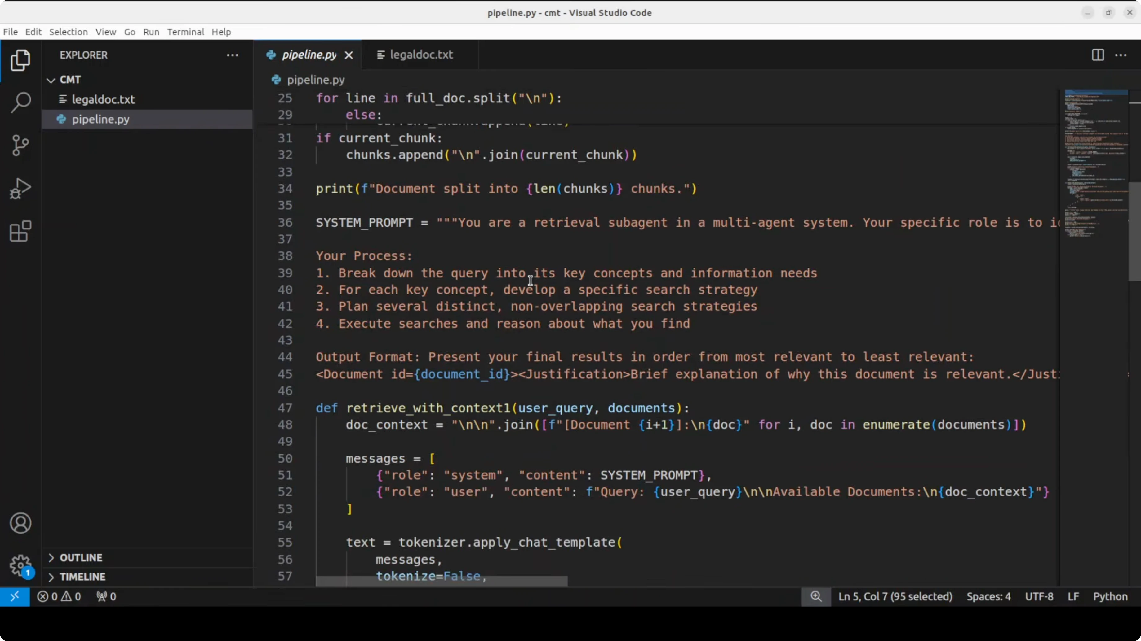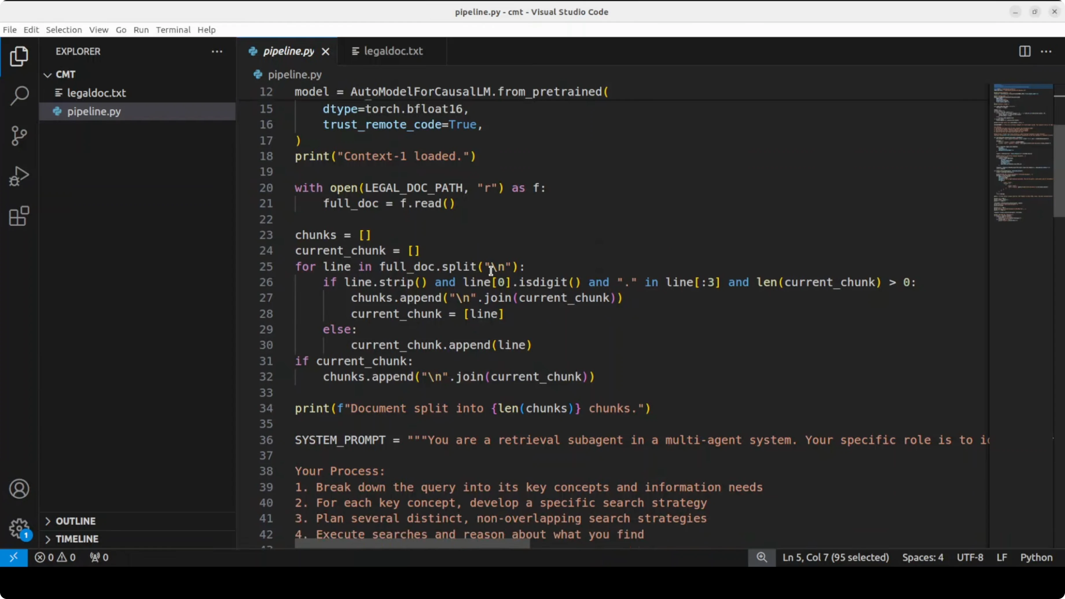 Load your corpus, split into section-level chunks with stable IDs, and prepare a user query. In my legal document test, I passed an employment agreement and split it into section-level chunks along with the query.