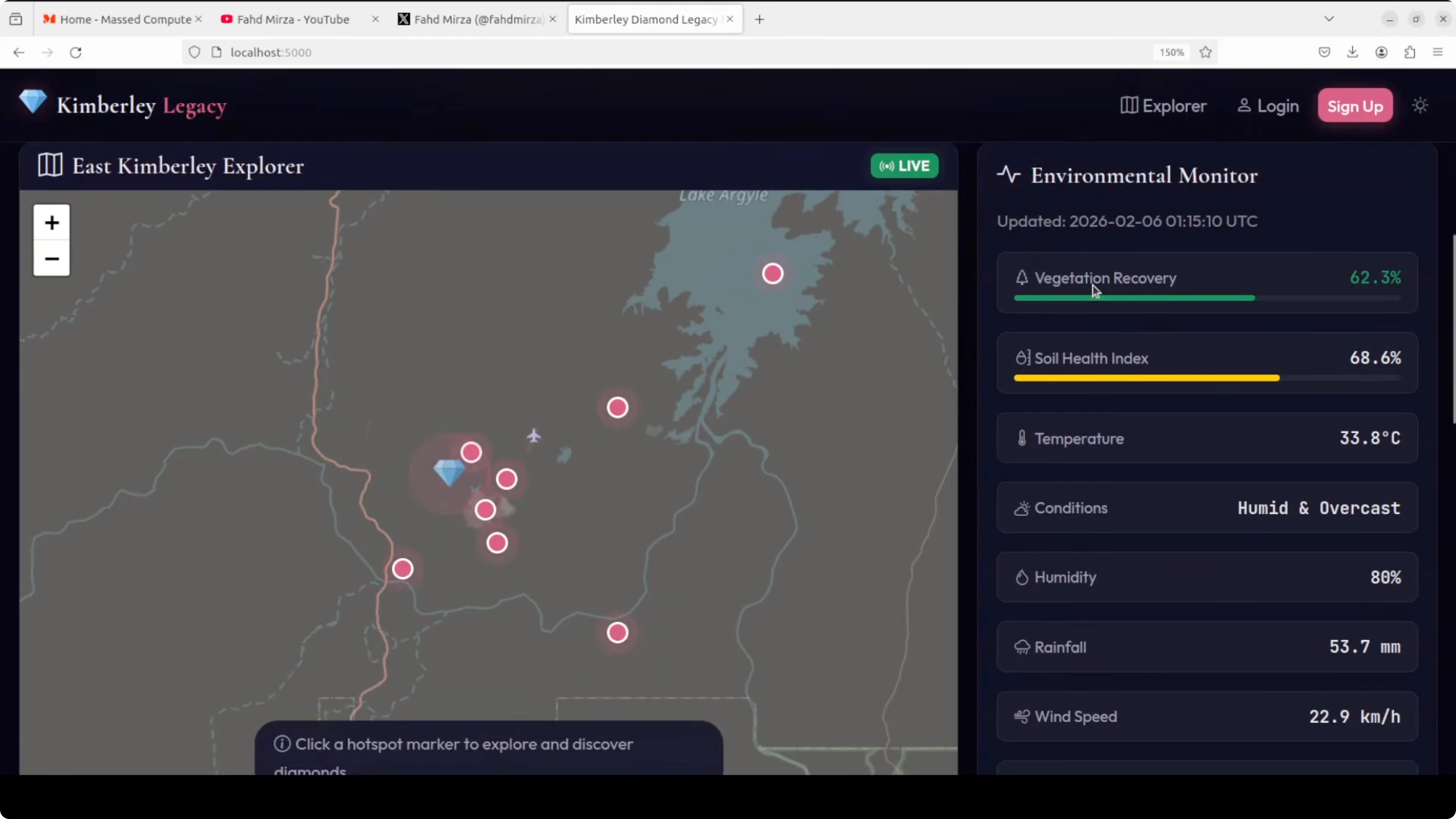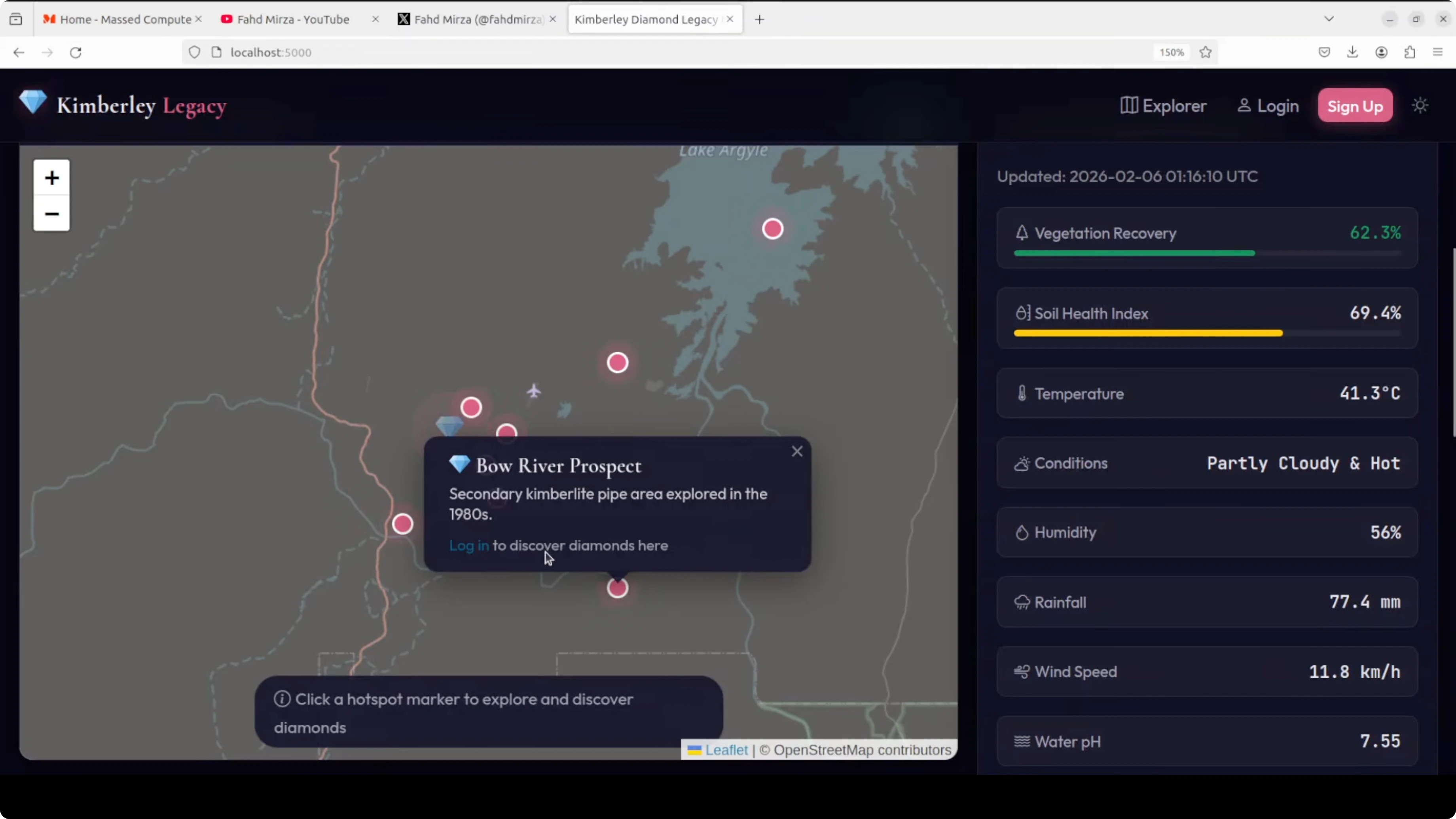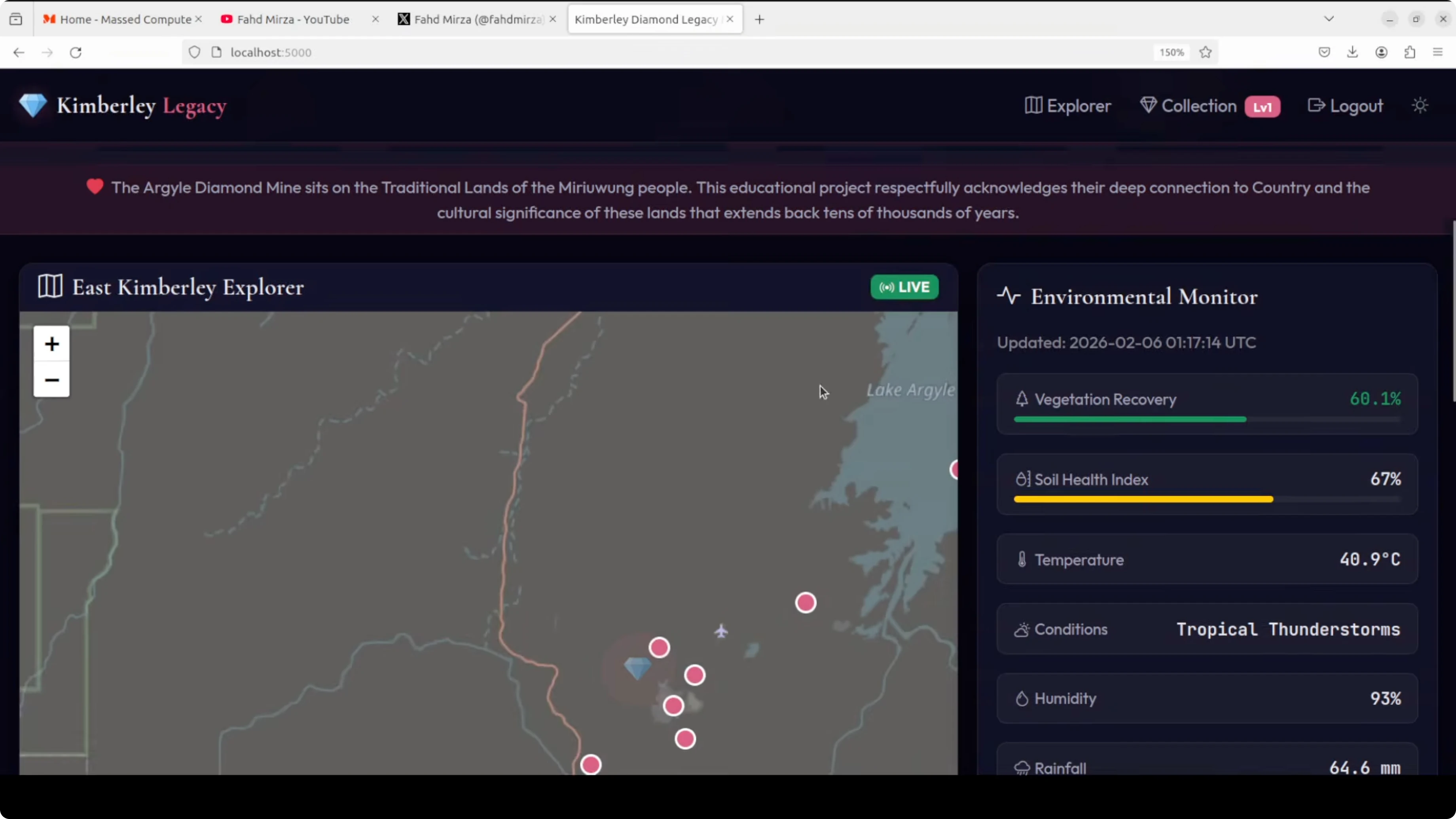 The UI was responsive. It presented a legacy monitor with an environmental monitor showing vegetation recovery and locations. The map used OpenStreetMap with legacy data, and it surfaced details about the Argyle diamond mine in Western Australia. It displayed conditions like temperature and a soil health index.
