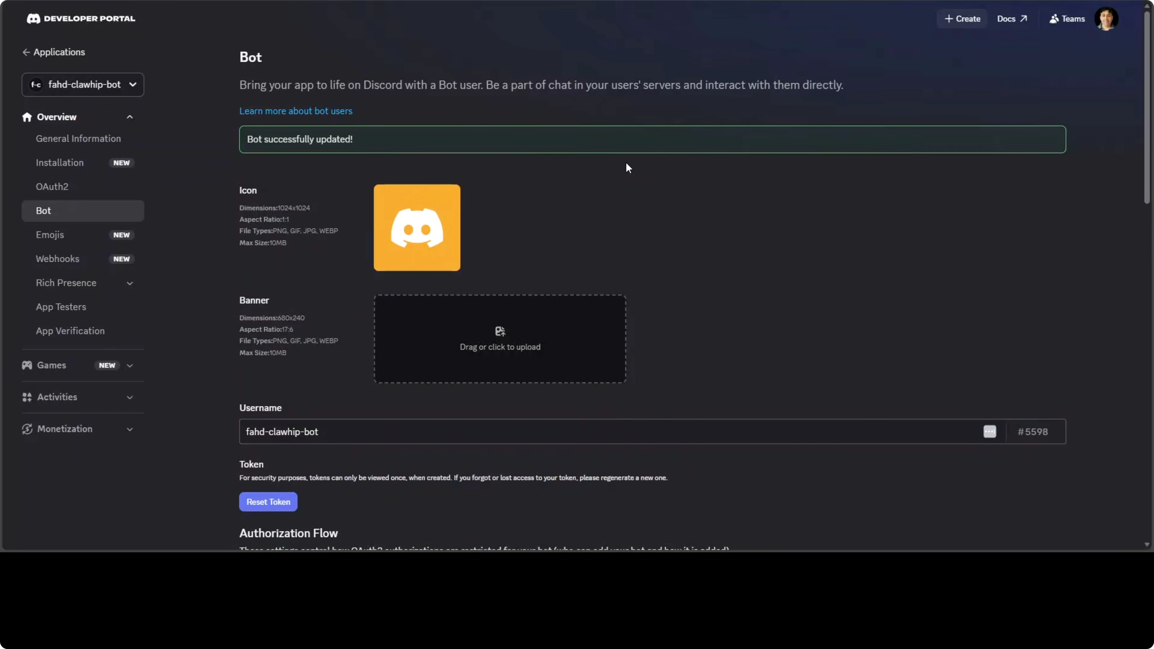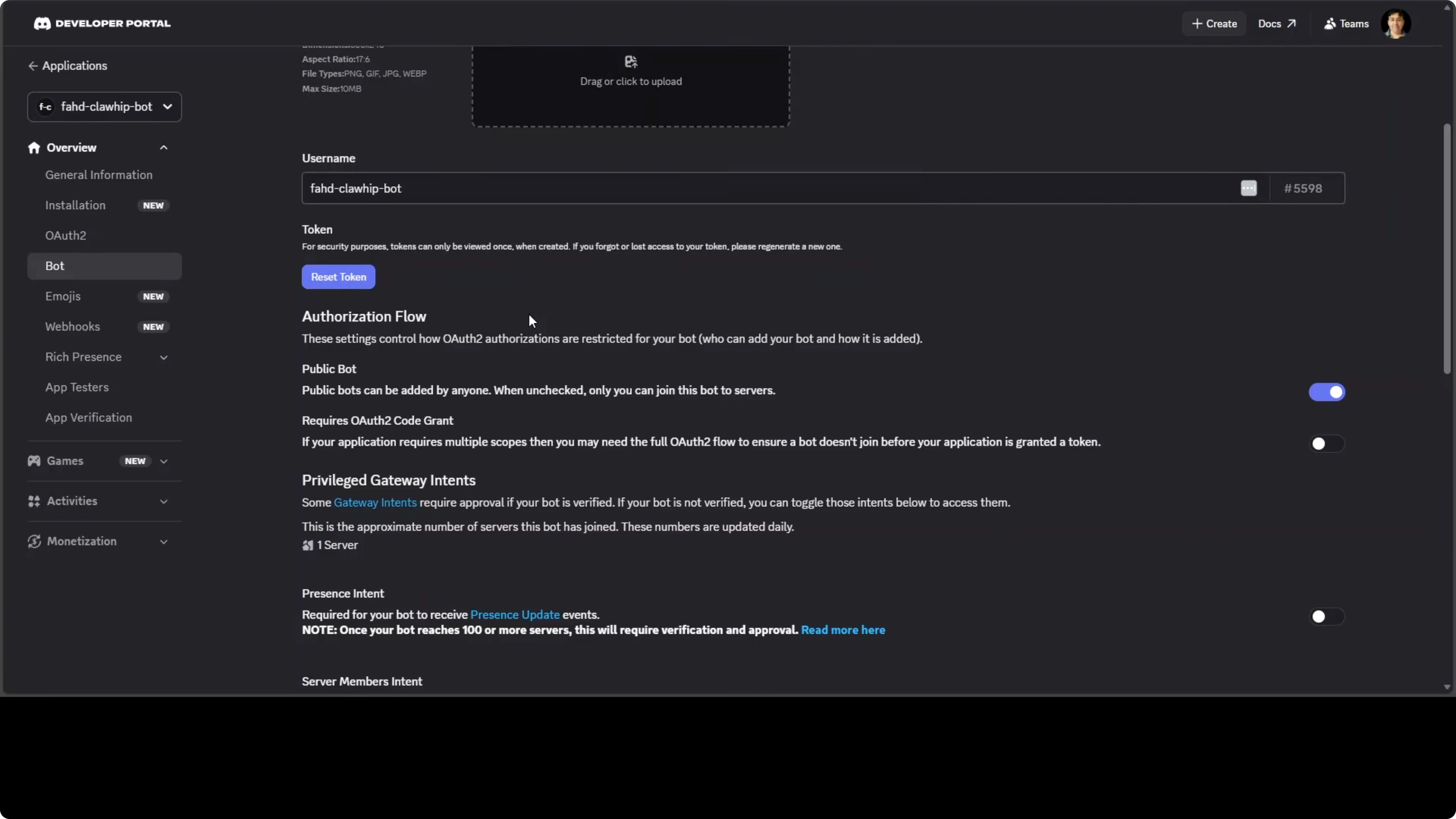 Click Reset Token to generate a bot token and save it securely. Enable the Message Content Intent. Under Bot Permissions, grant View Channel and Send Messages only.