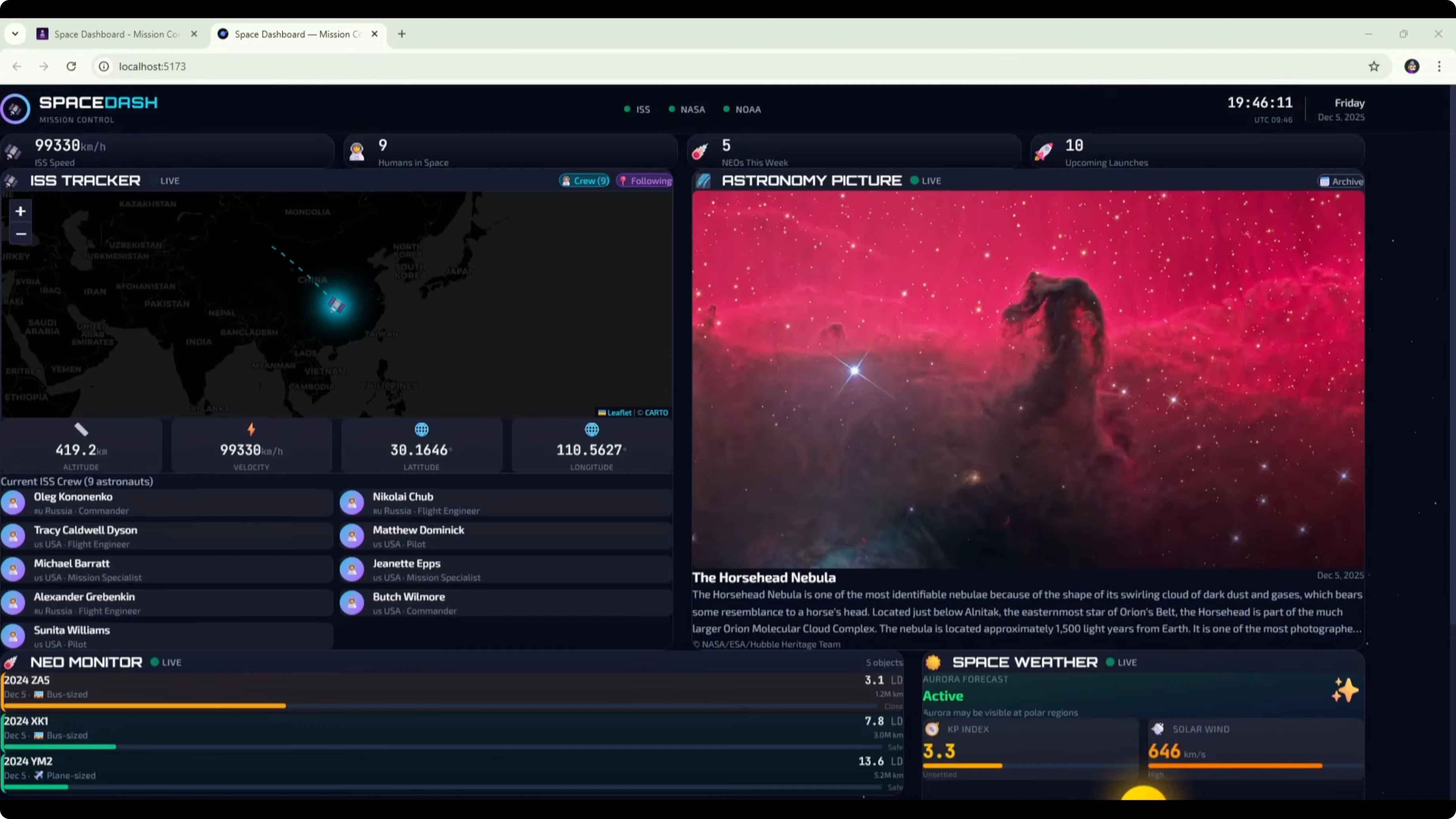 Test the ISS tracker, APOD, events, NEO, and space weather widgets.