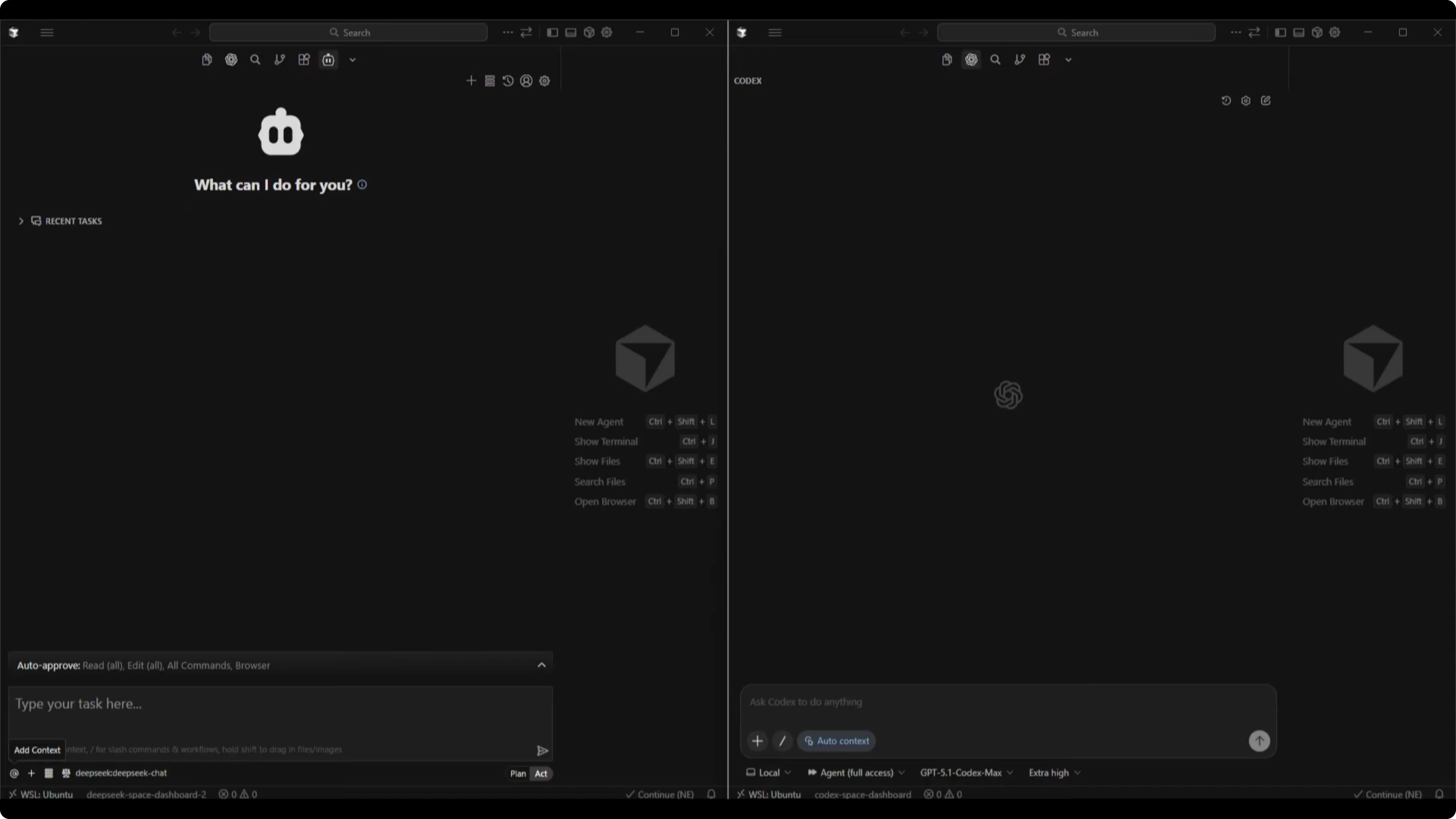 I worked in Cursor with a split-screen setup. On the left, I connected a client to the DeepSeek v3.2 API. On the right, I used the Codex extension with GPT-5.1 Codex Max and set reasoning to extra high.