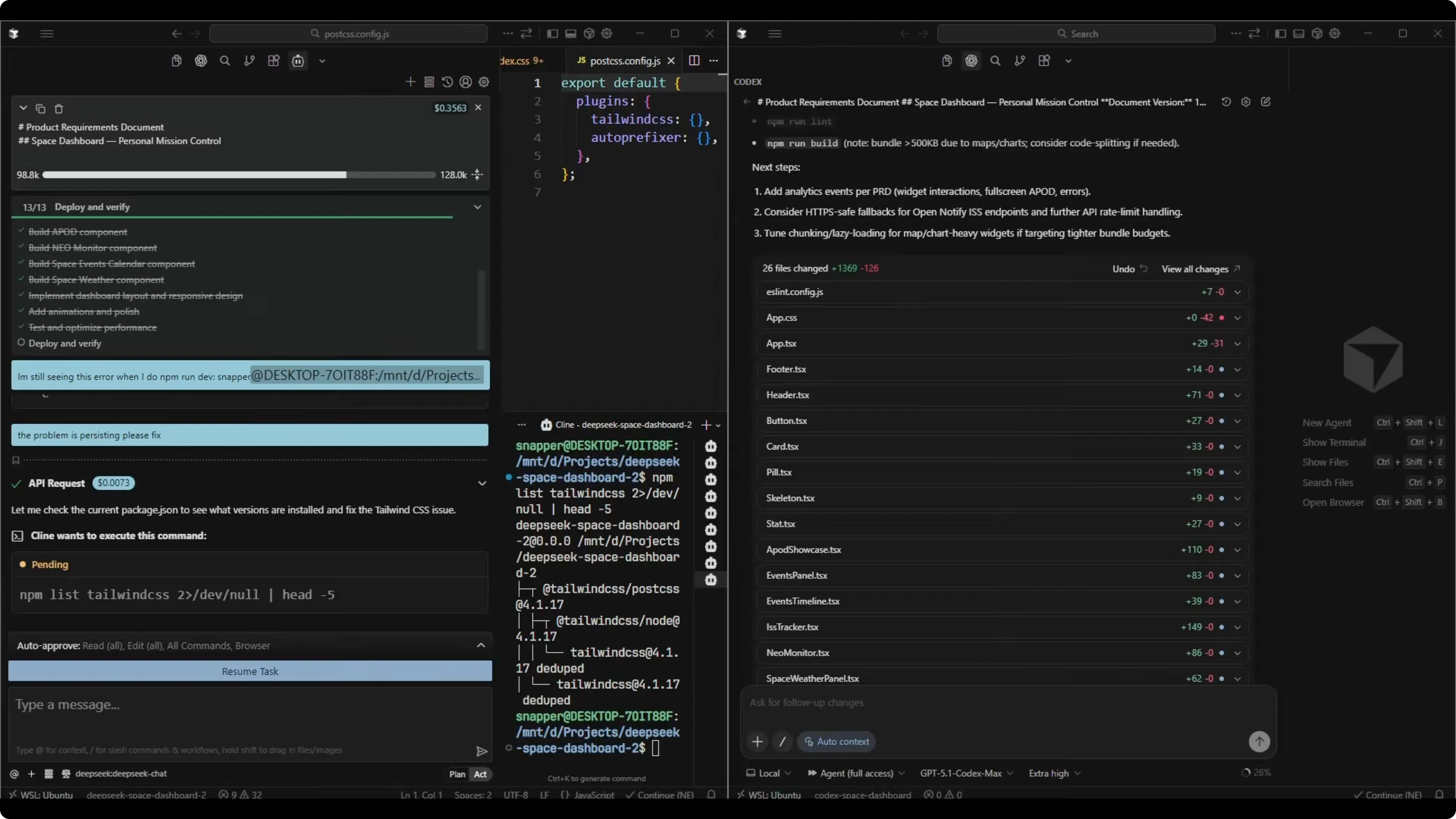 I pasted the full Opus PRD into both workspaces. I let each model handle the build process. I then ran both dashboards in dev mode for testing.