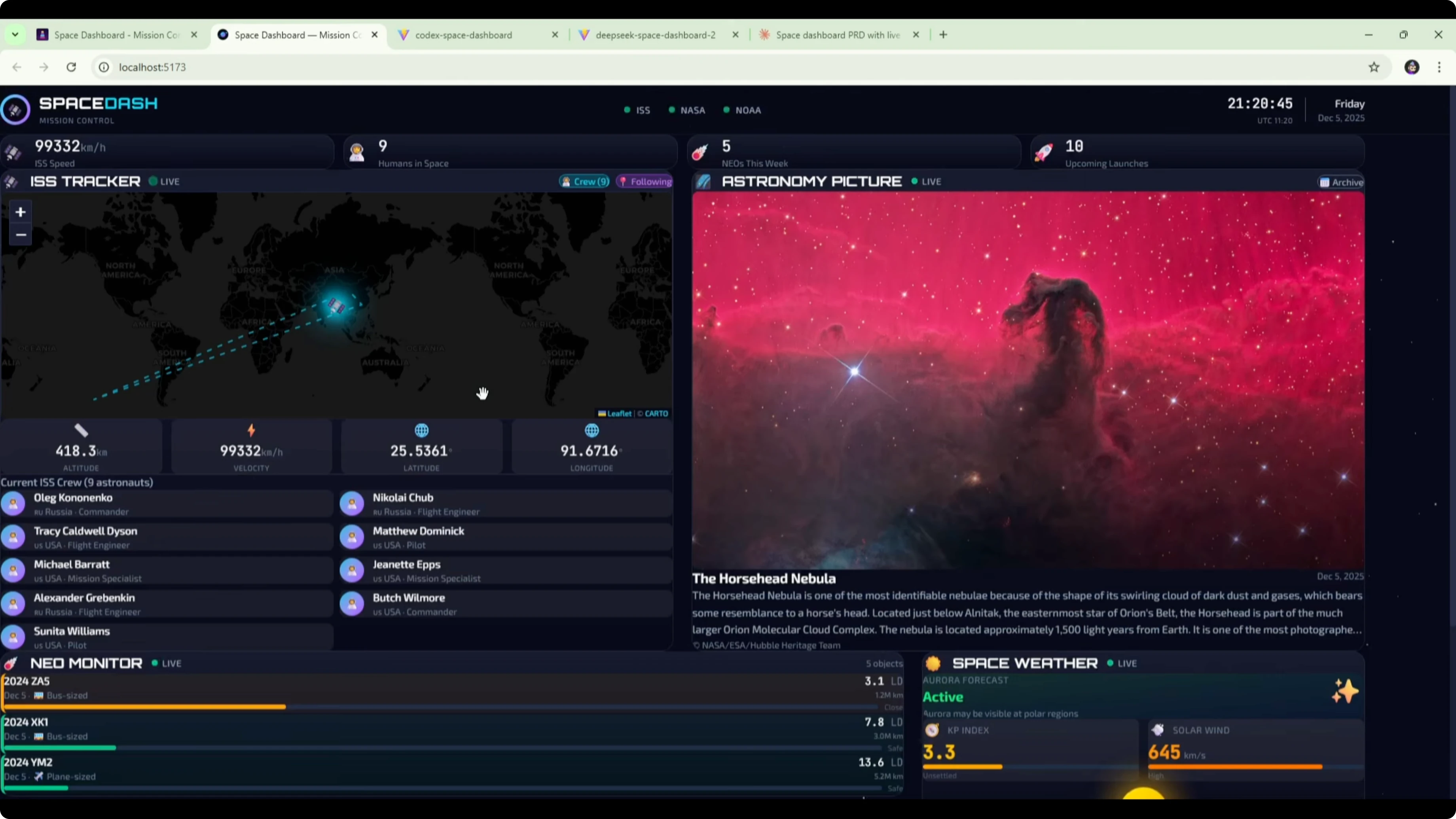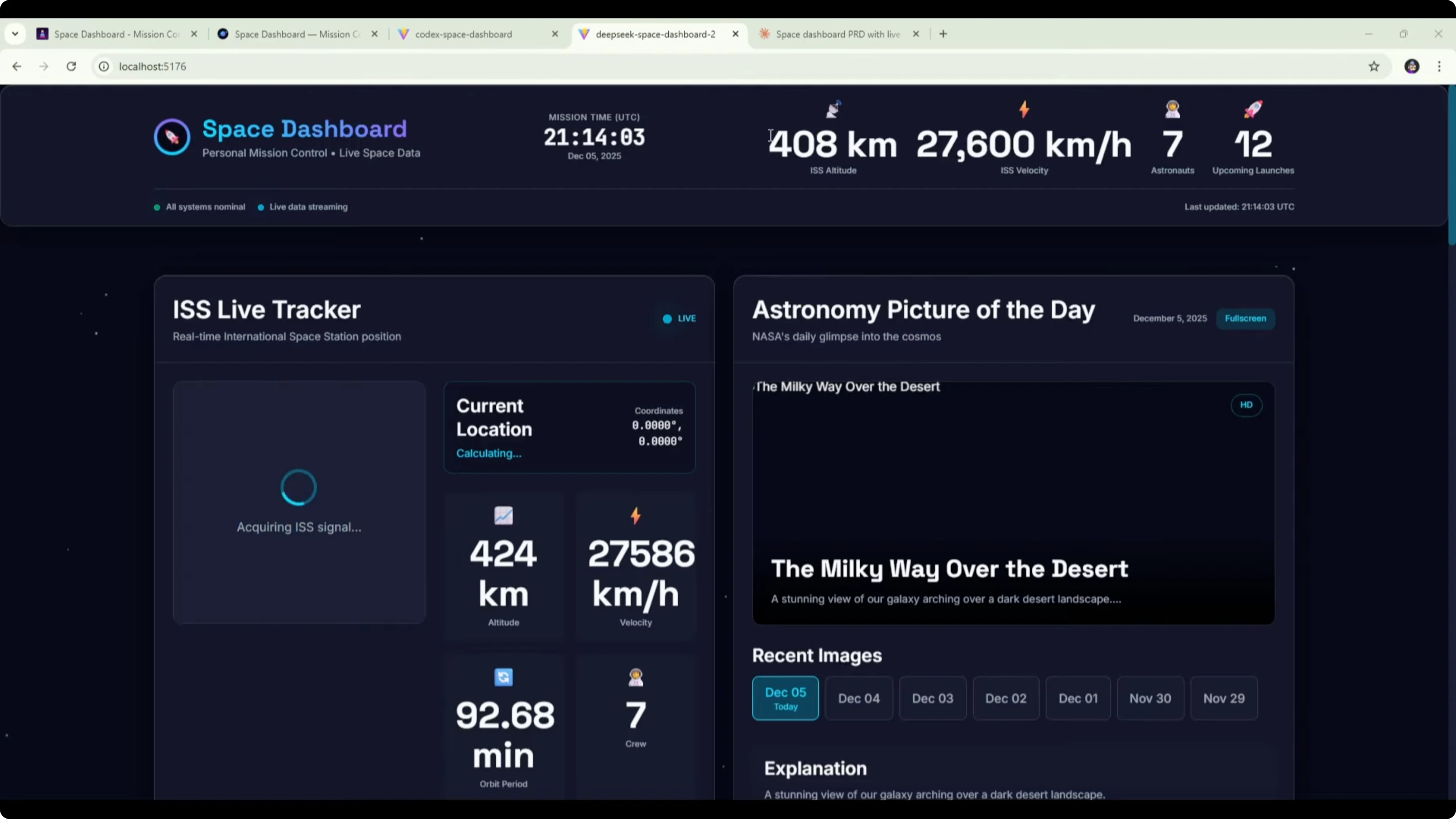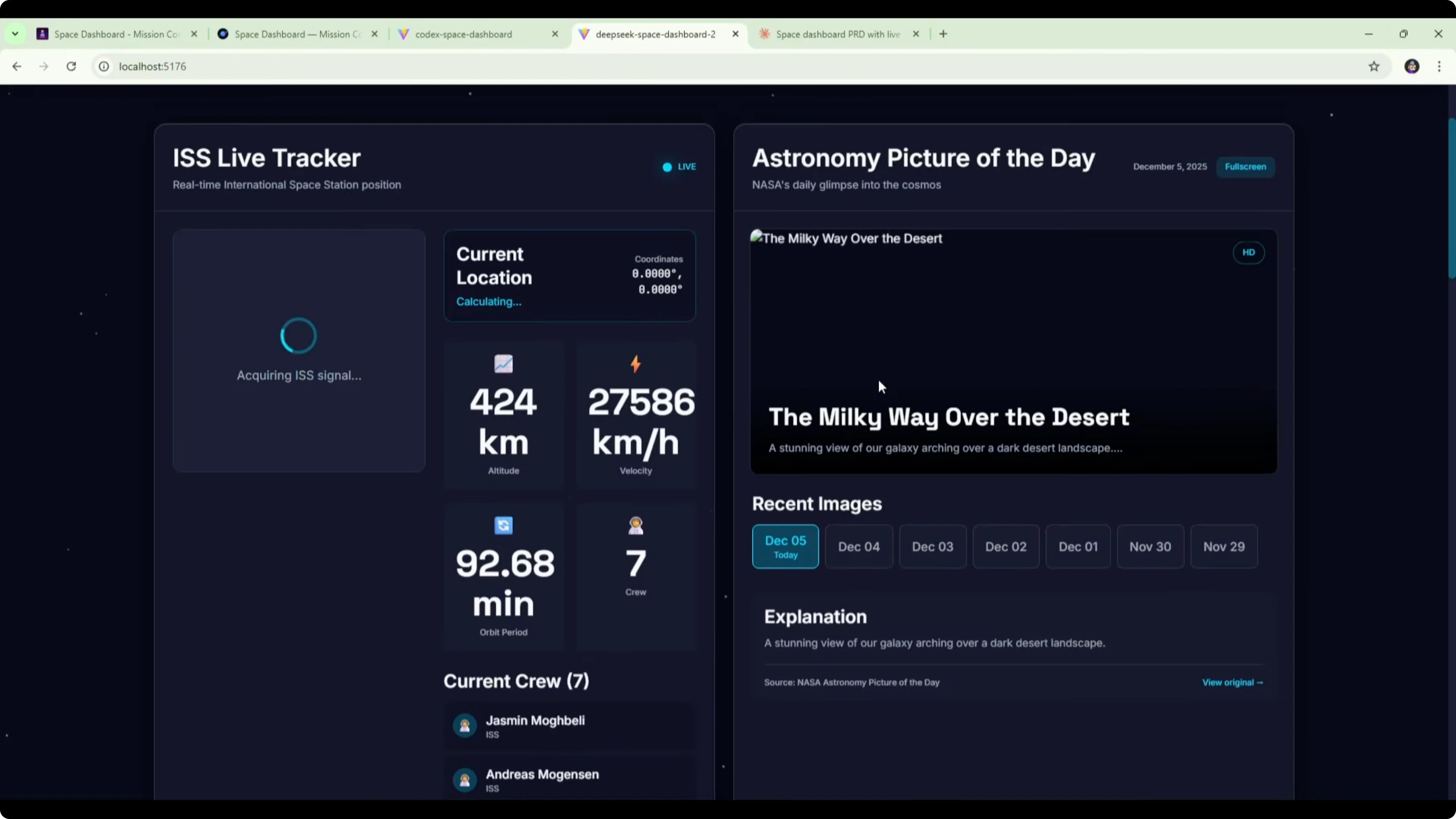 Here is the Codex version of the space dashboard. It included a mission control section at the top showing the time, information about the crew, and the next launch. It also had the ISS live tracker with an interactive map, coordinates, and crew on board.The astronomy picture of the day widget appeared to have broken images. That could be an API or CORS issue to fix. The widget itself looked clean from a UI perspective.
