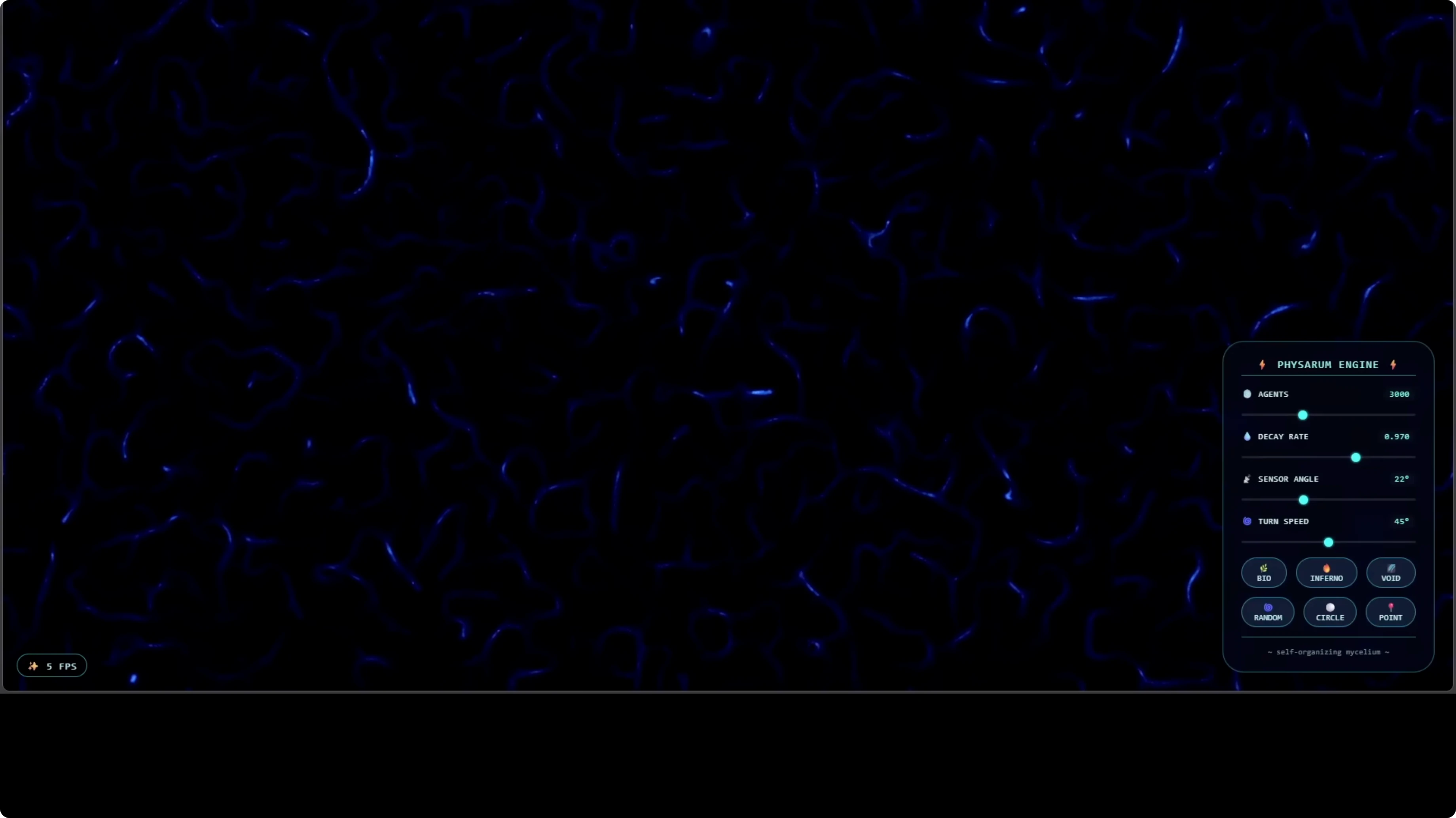 This is a real biological style simulation of Physarum, a single celled organism that builds networks mirroring structures like the Tokyo rail system. I adjusted parameters live such as decay rate, sensor angle, and turn speed, and every control worked. Palettes like inferno, void, point, random, and circle all responded as expected and the network grew more granular as I increased agents.
