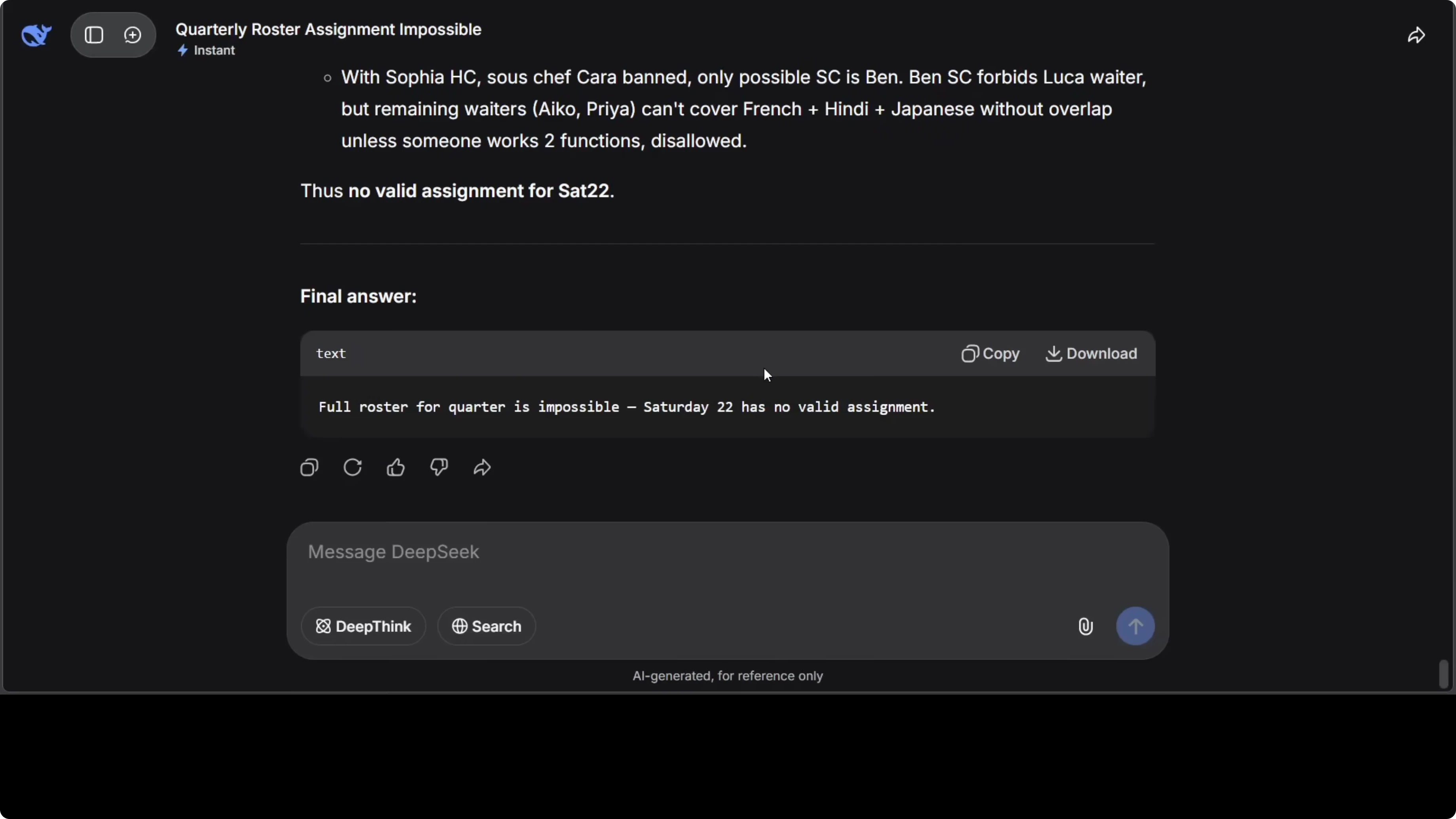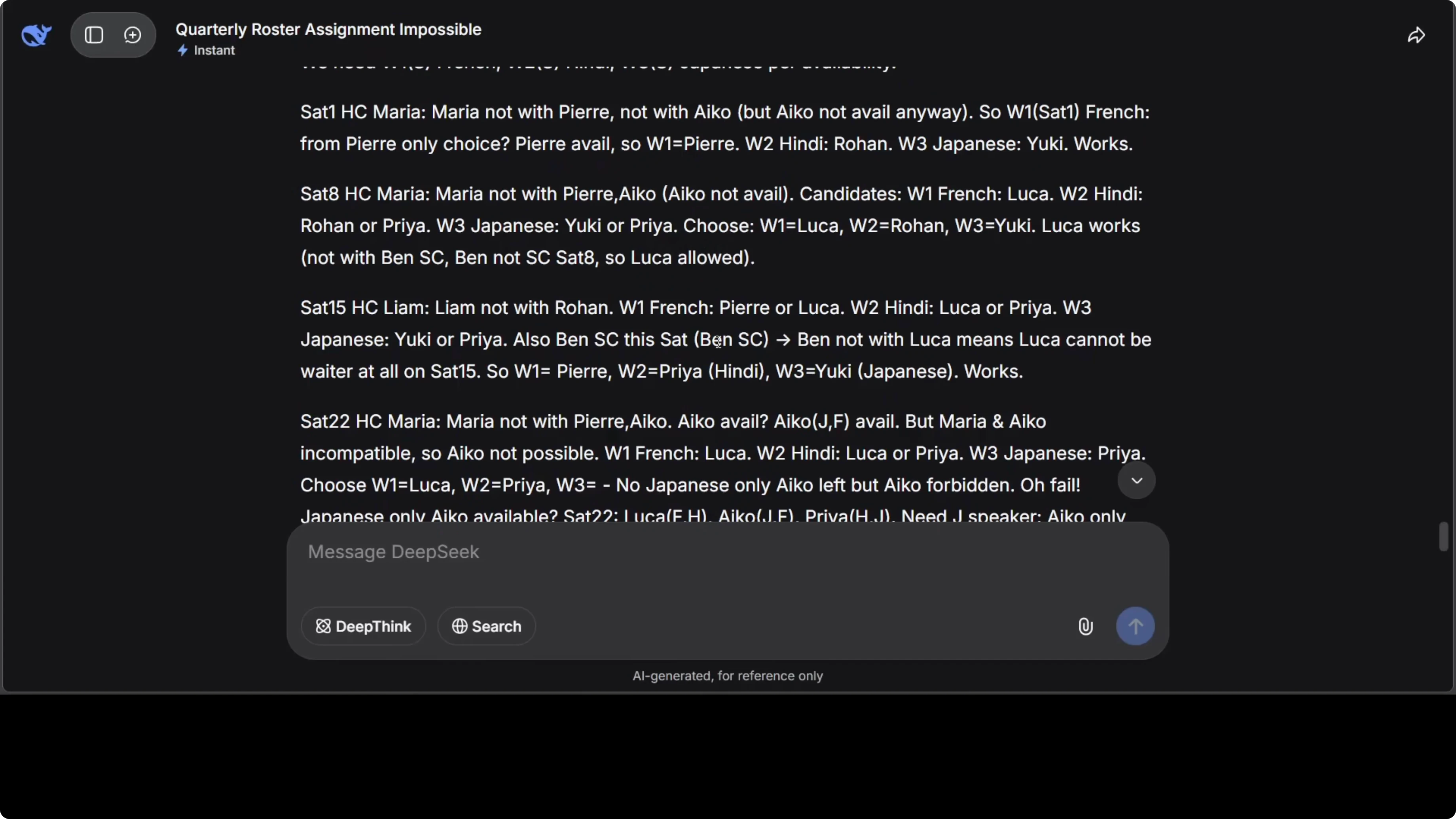 It solved all dependencies and produced a clean roster for all solvable Saturdays, then documented the dead end for the unsatisfiable date. Here is the prompt template that captures the constraint logic.