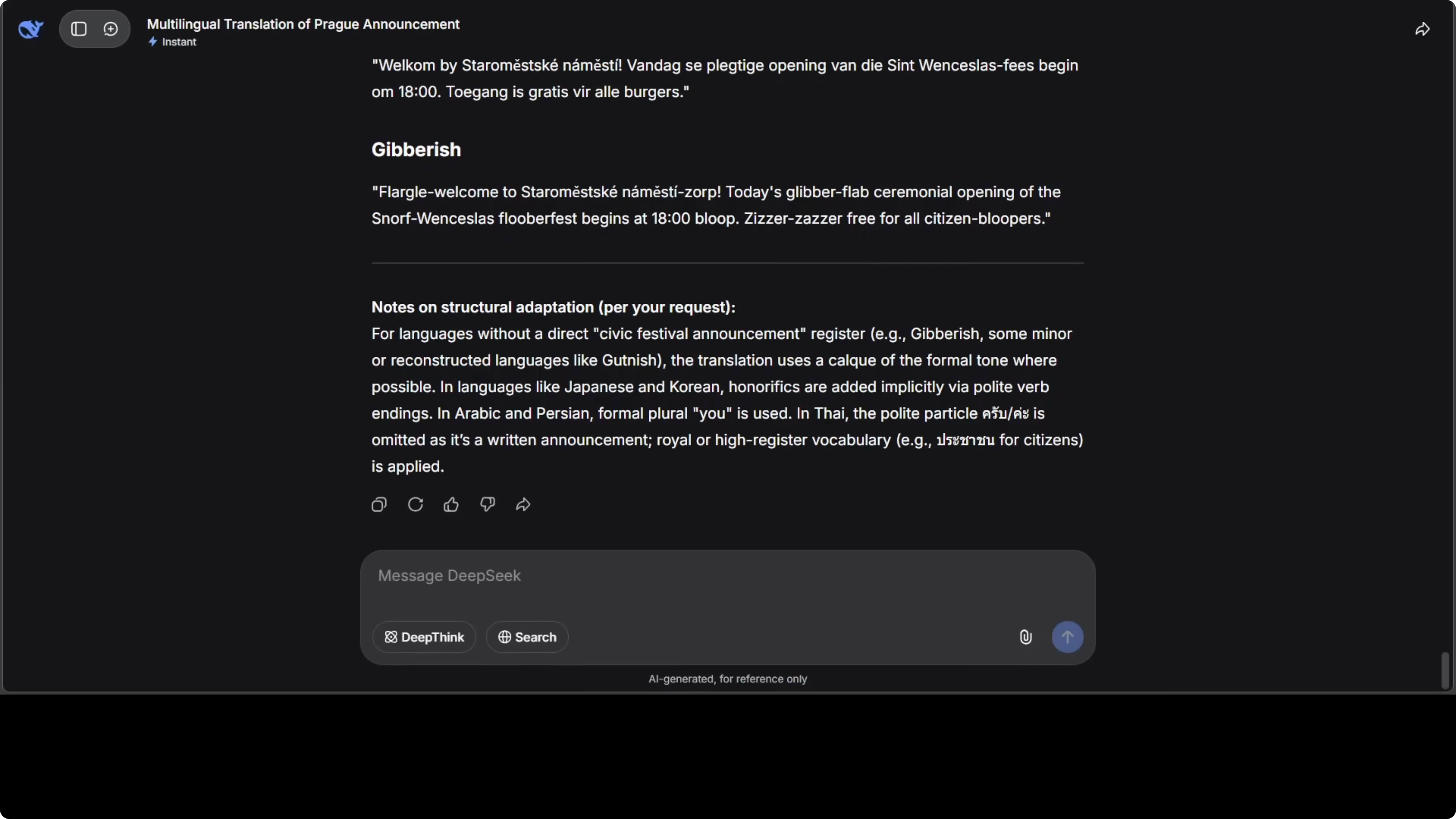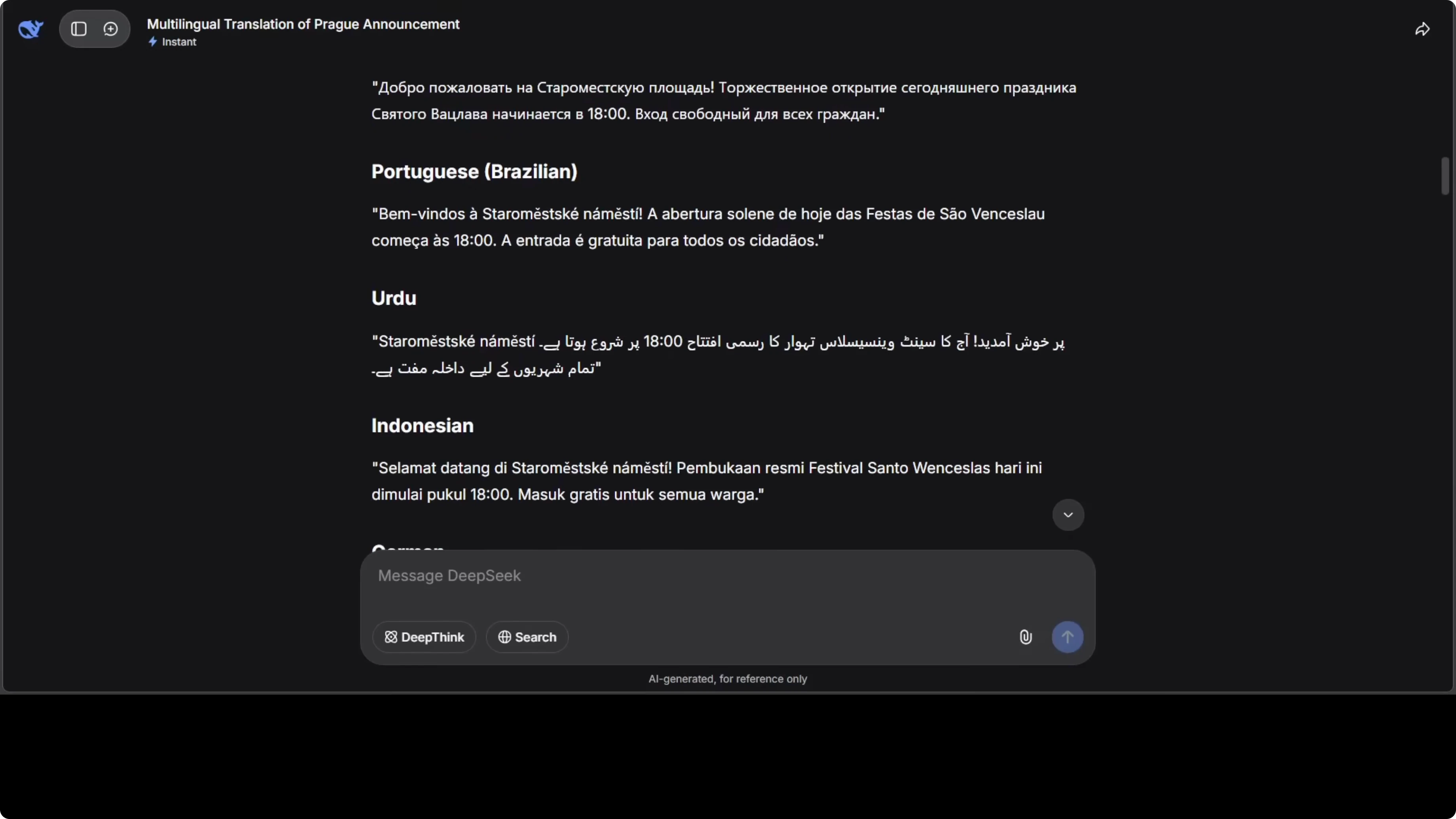 I asked for a multilingual translation of an official city announcement with formal tone and accurate diacritics. The source text started with this line: “Welcome to Old Town Square for today’s ceremonial opening of the Saint Wenceslas Festival.” I requested translations across a wide range of languages.