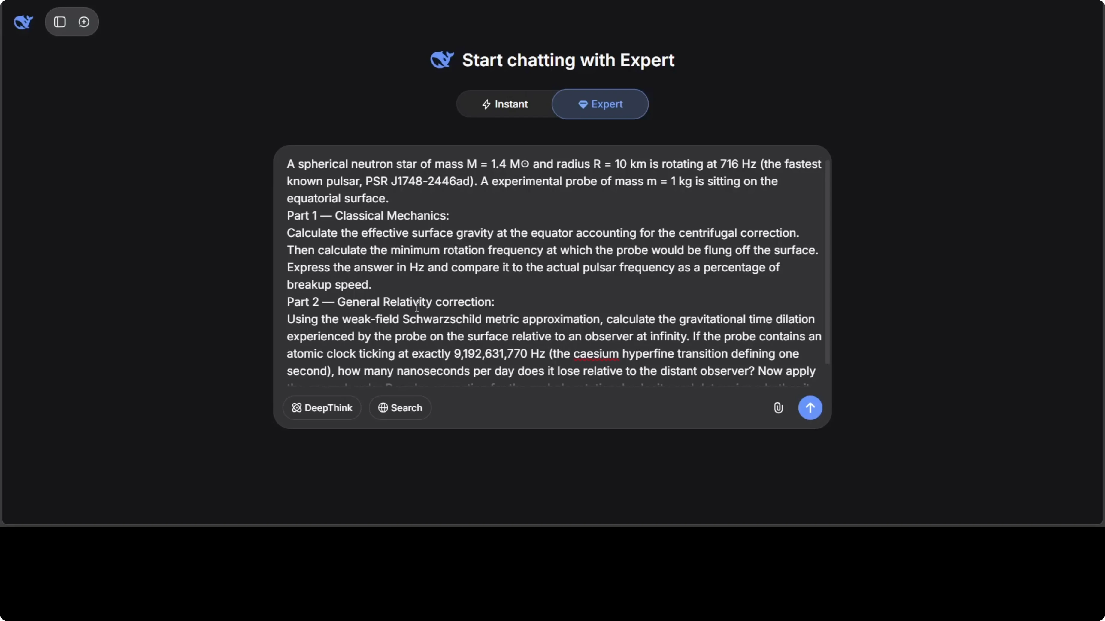 I ran an expert mode prompt with two parts. Part one covered classical mechanics and part two added a general relativity correction. The model produced a long derivation with equations and explained the physical meaning clearly.