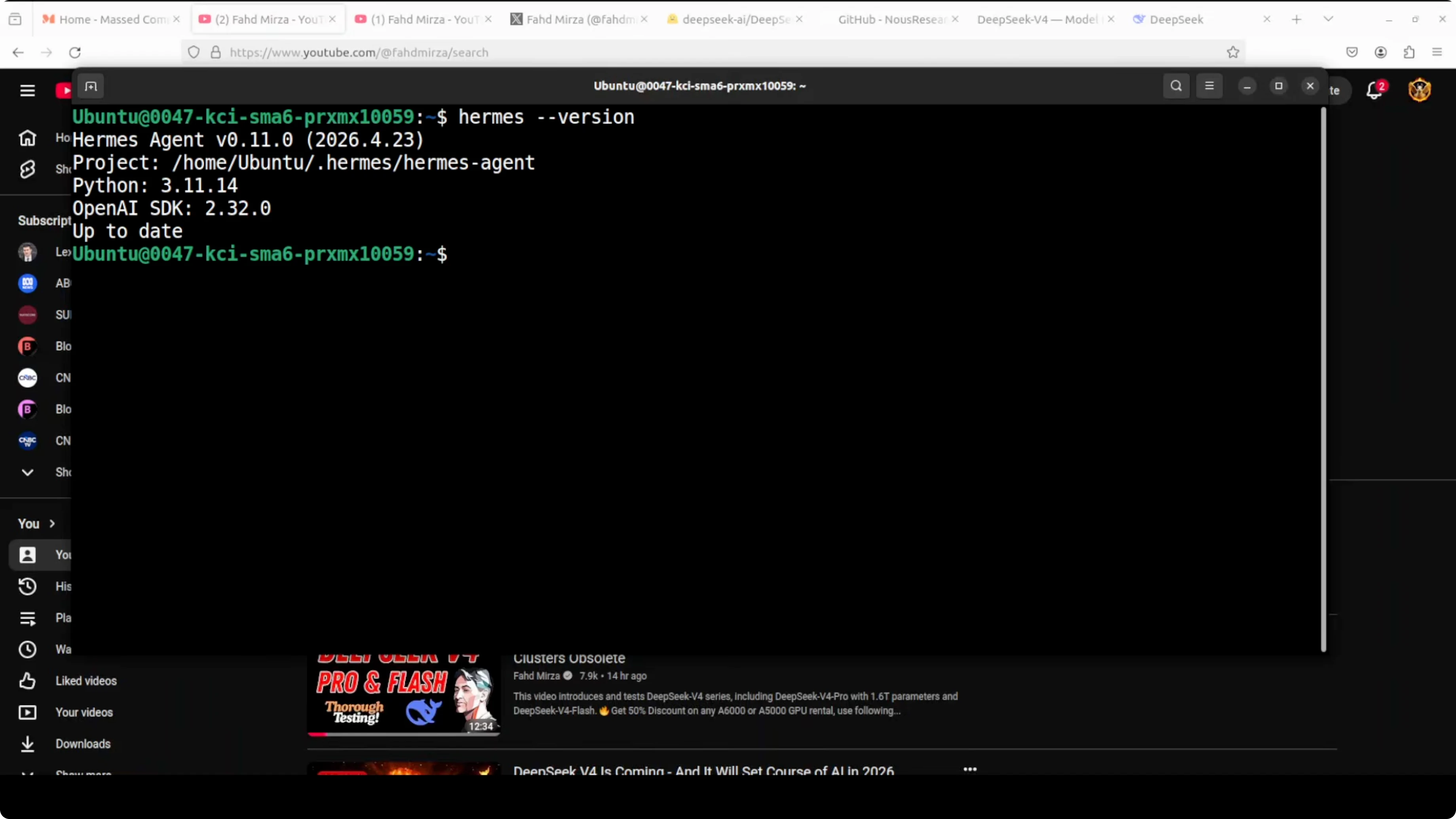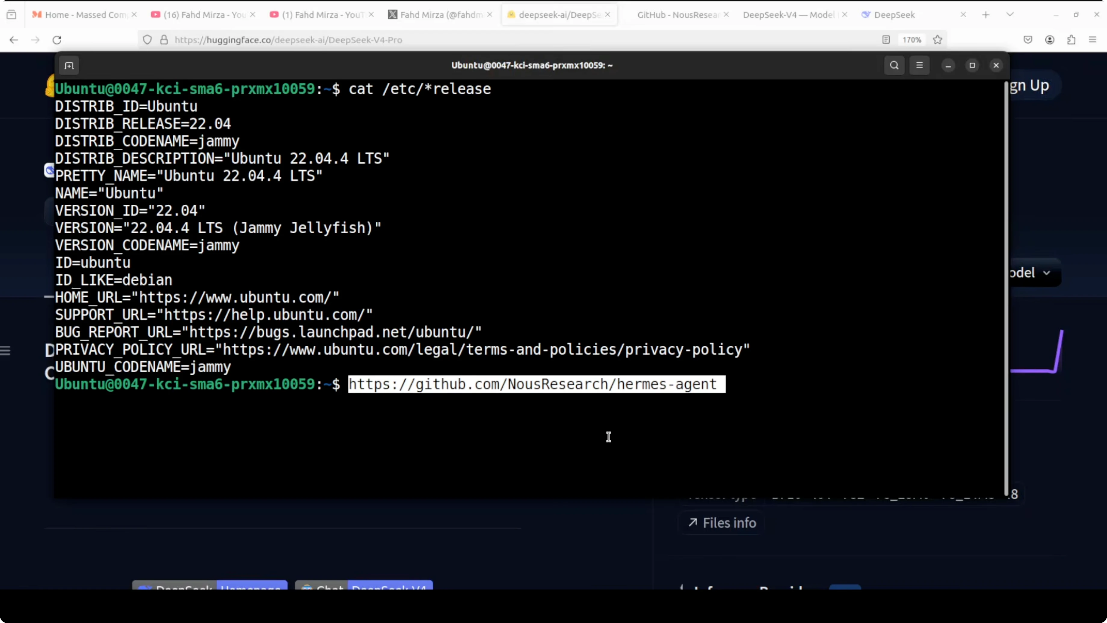 I am on Ubuntu for this run. DeepSeek V4 Pro is a 1.66 trillion parameter model with 49 billion activated, built for long horizon agent work. I am using the API because this machine does not have enough GPU.