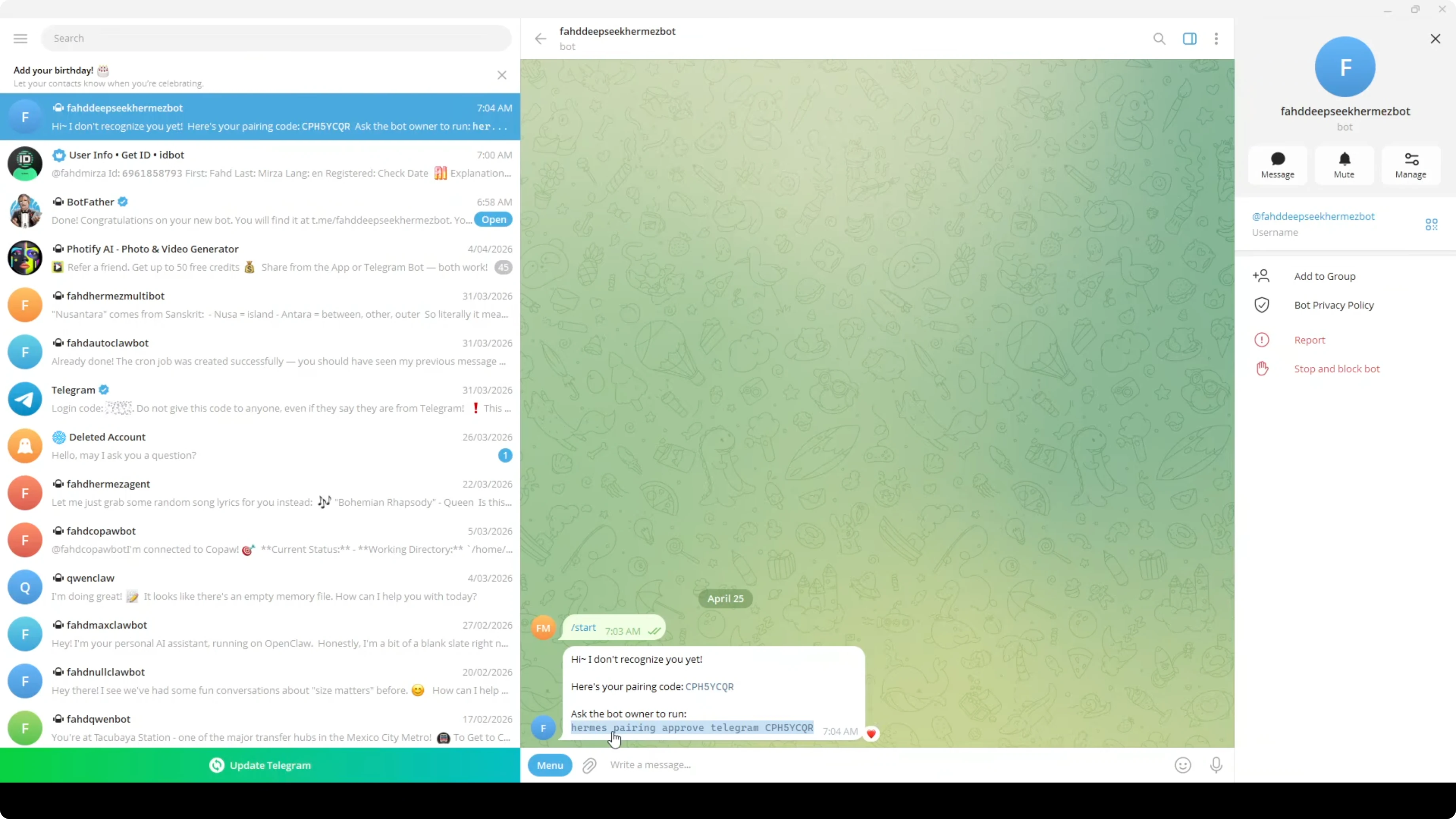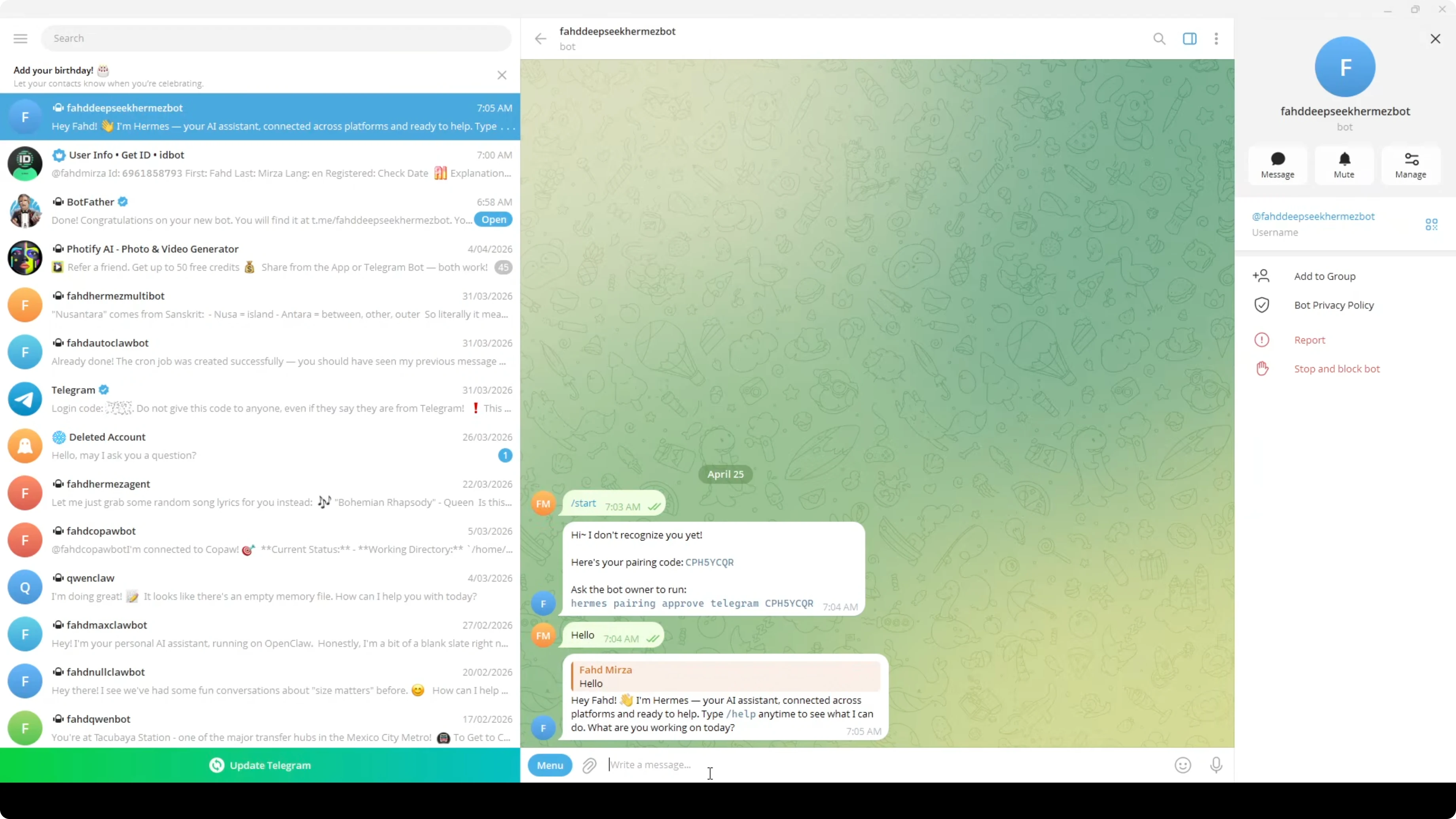 export TELEGRAM_BOT_TOKEN="123456:ABCDEF..."If Hermes prompts for the token in its setup, paste it there and confirm. Start a chat with your bot in Telegram and press Start to initiate the session.