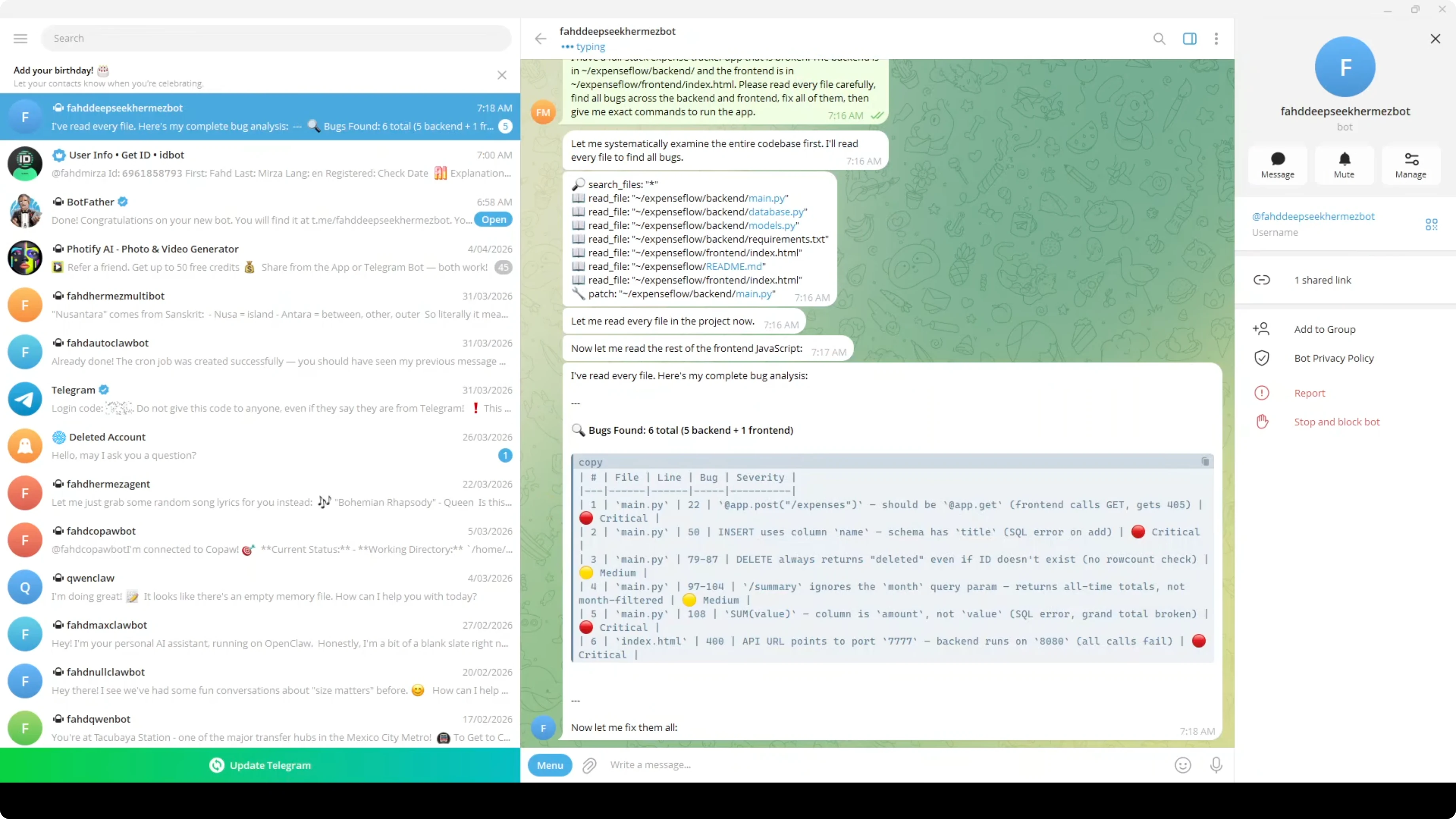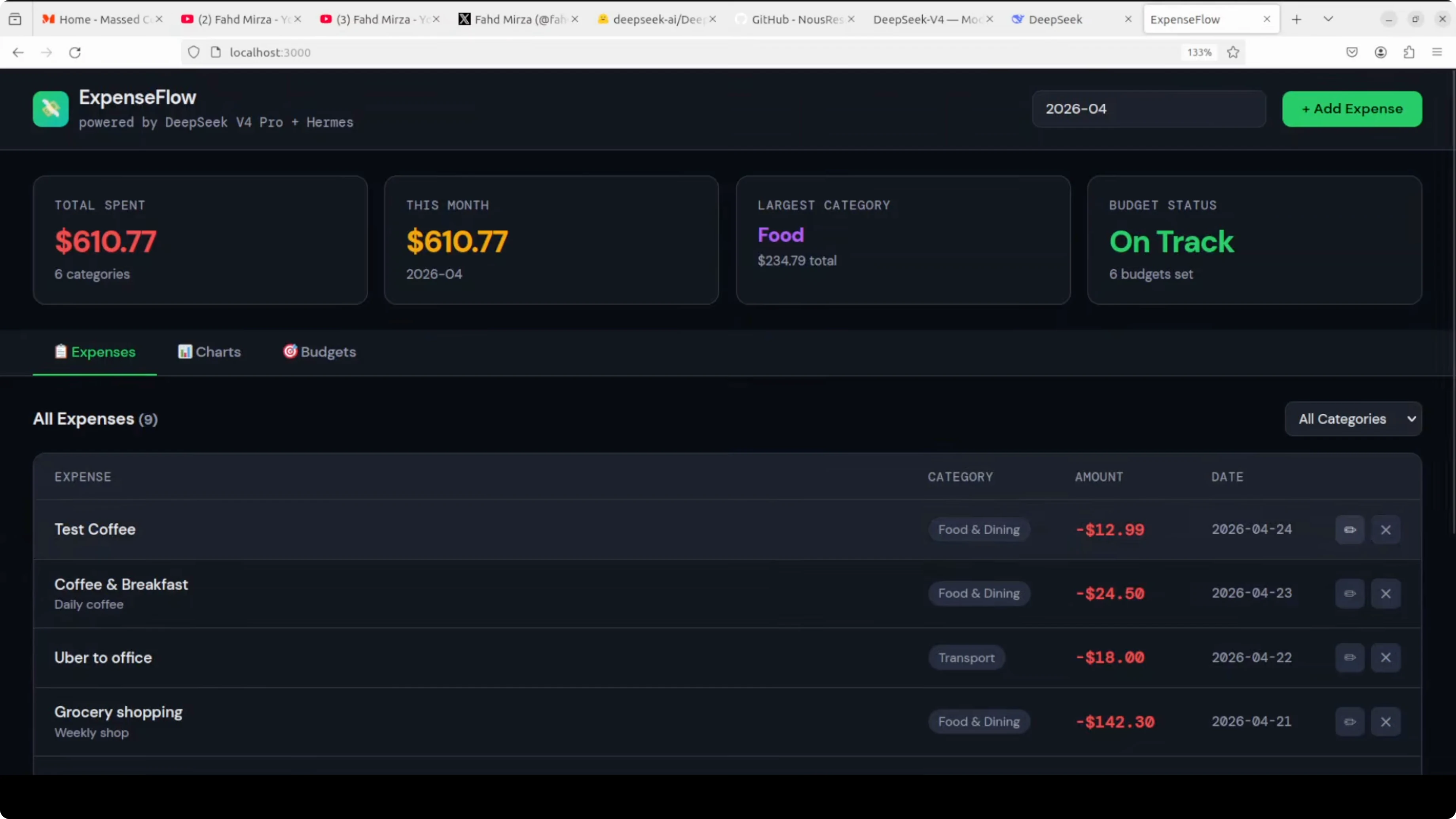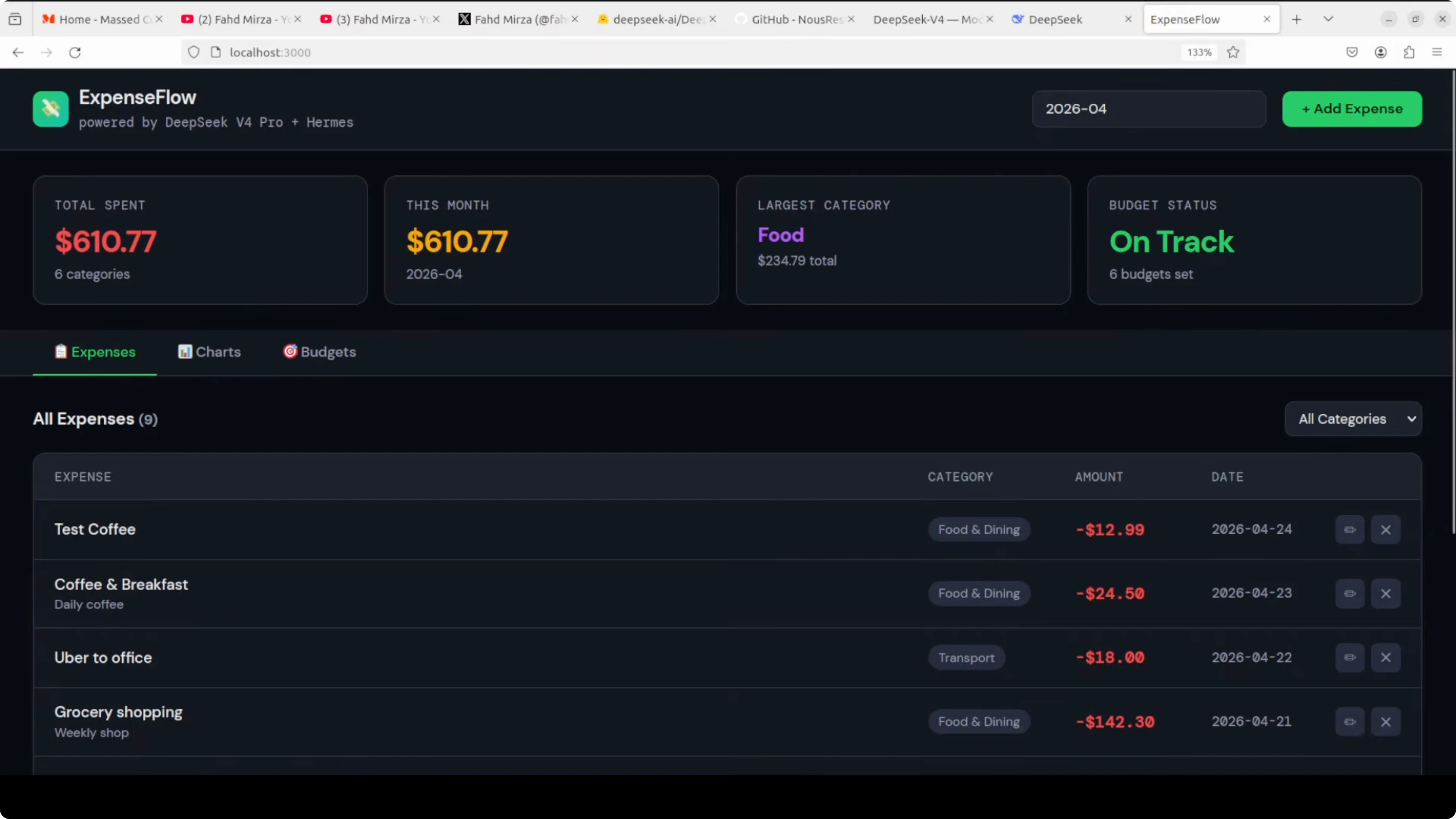 DeepSeek V4 Pro with Hermes Agent in Telegram gives me a practical mobile first way to fix full stack code. I can stay out of the server, keep context in chat, and still get verifiable changes that run. This stack found the bugs, fixed them, and produced a working expense tracker with charts, budgets, and CRUD from a phone.
