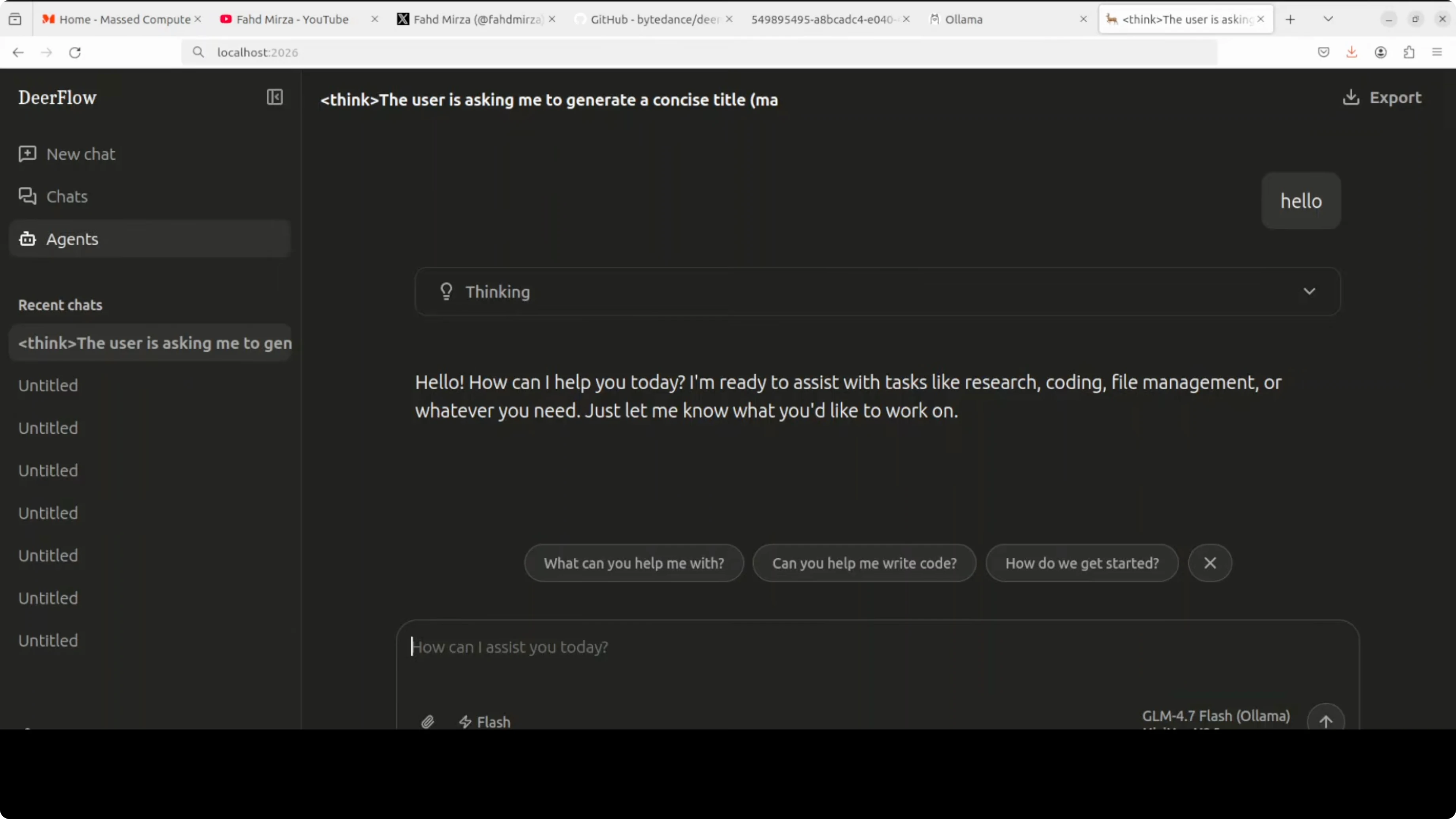 Open the UI at http://localhost:2026. You will see the model selector with your local GLM 4.7 Flash already chosen if configured.