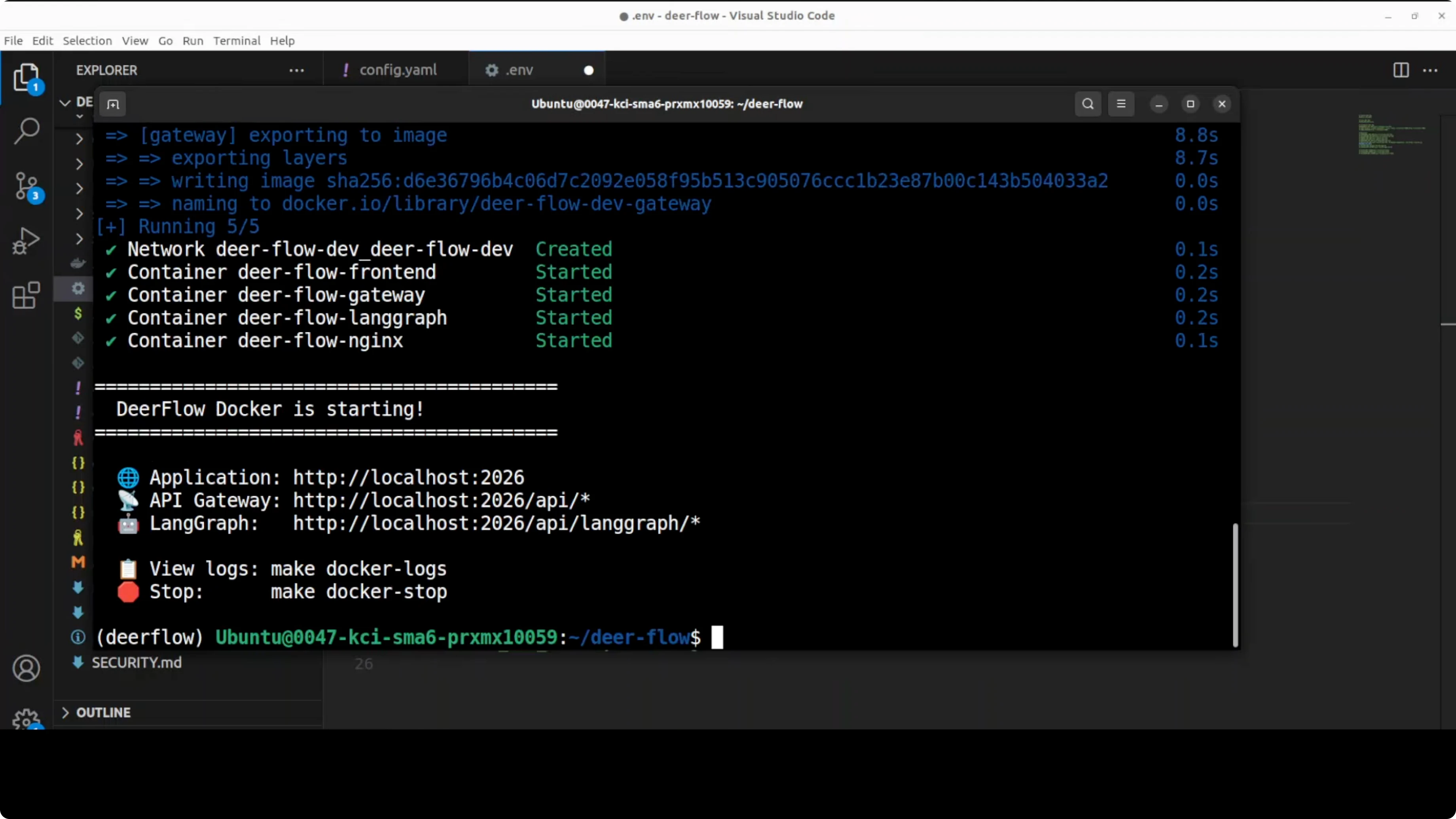make docker-startOnce up, you should see four containers started cleanly: frontend, langgraph, gateway, and nginx. Access the UI at http://localhost:2026.