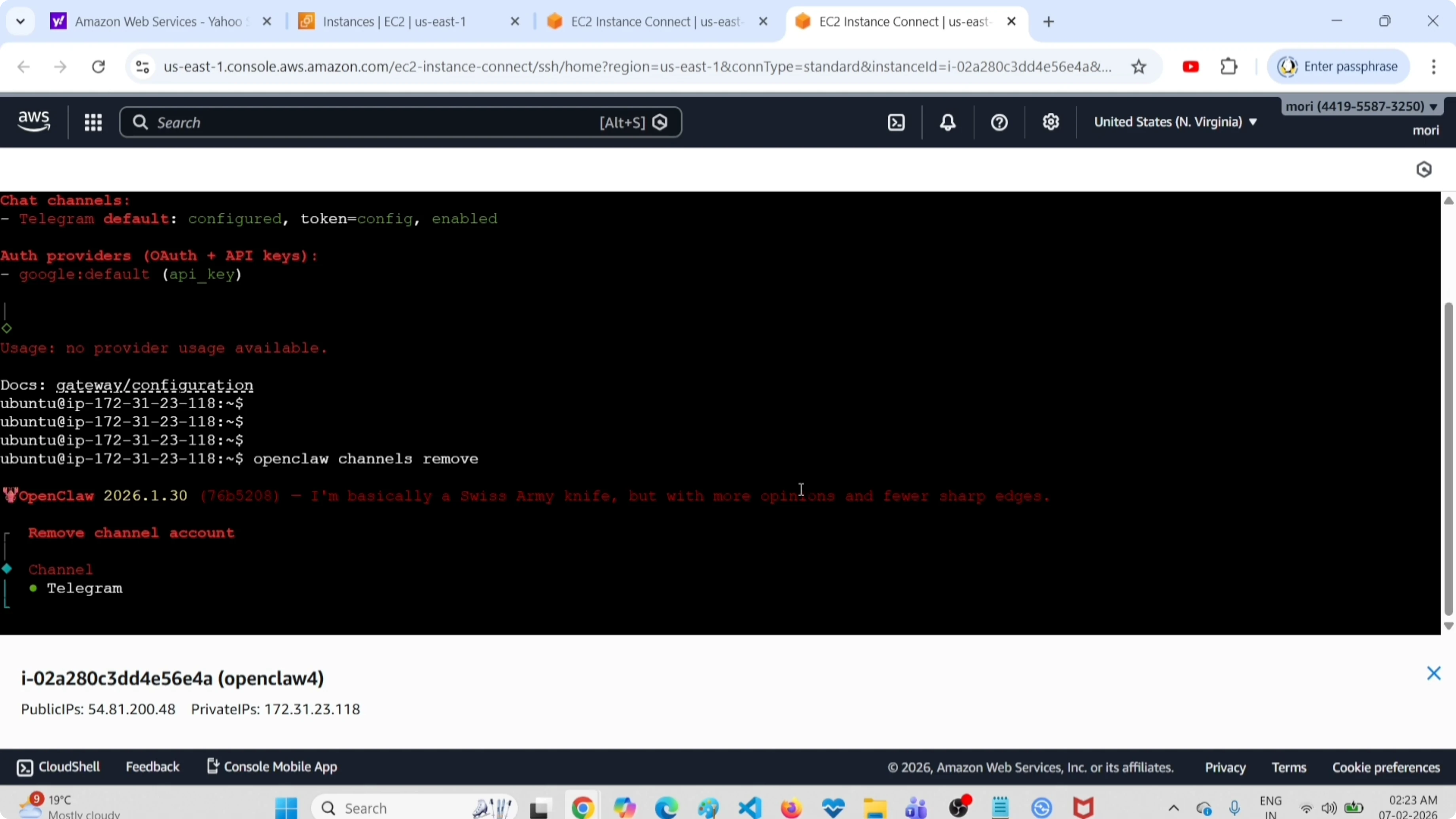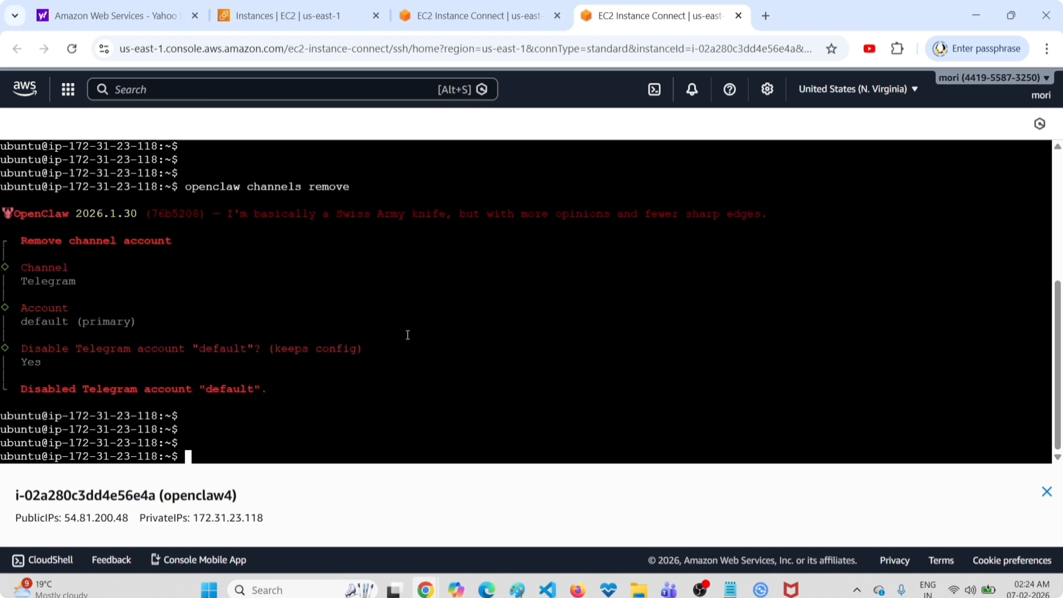 Listing channels first makes it clear which one is set as default before you remove it. Using the remove command here disables the Telegram account and keeps it visible for reference. If you need a full cleanup or want to start over with Telegram, follow these clean reinstall steps.