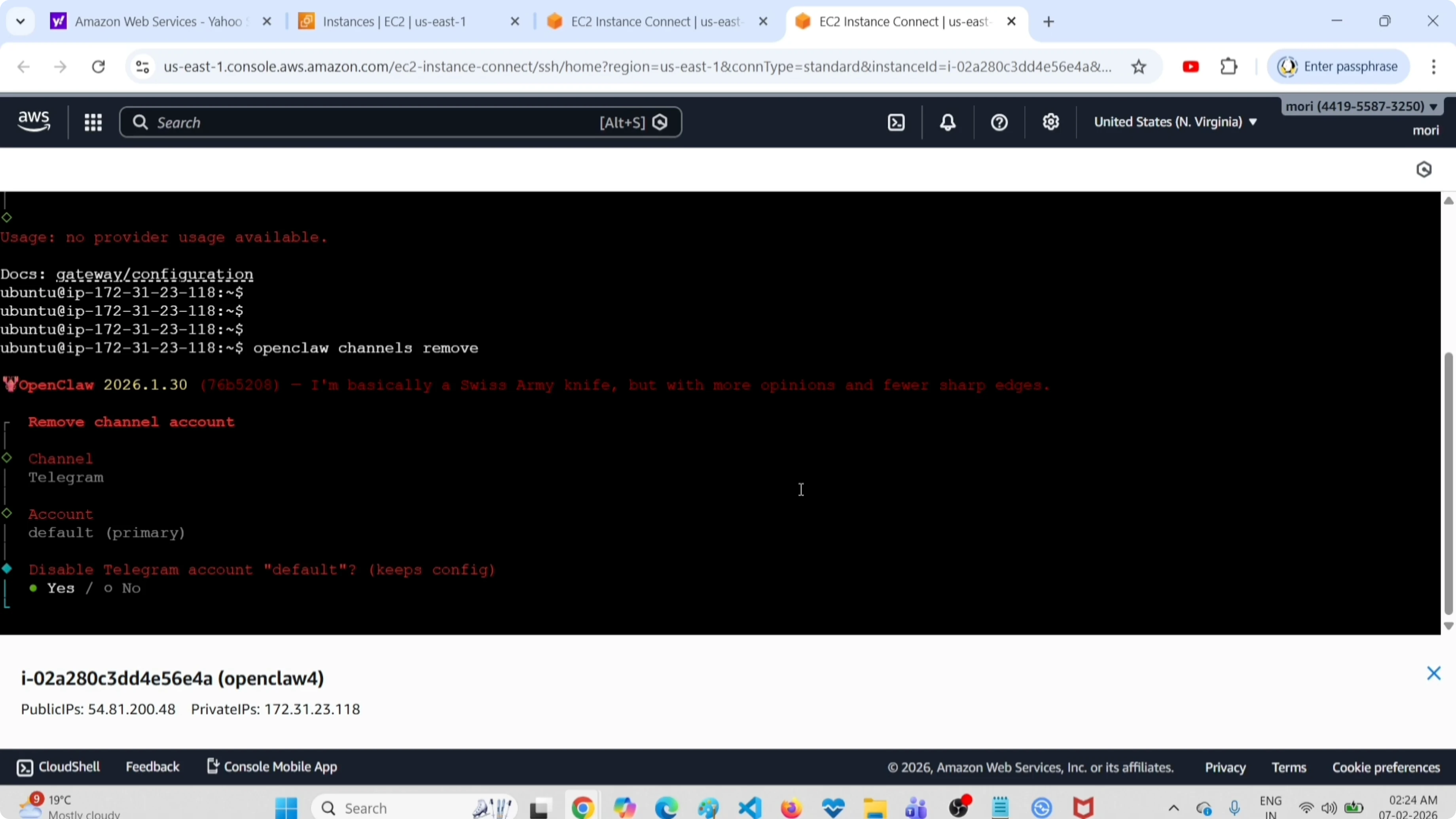 I am going to show how I remove a single channel from my OpenClaw setup. I will first list all configured channels, then disable the Telegram channel that is set as the default. If you are still setting up Telegram with OpenClaw, see this setup guide.