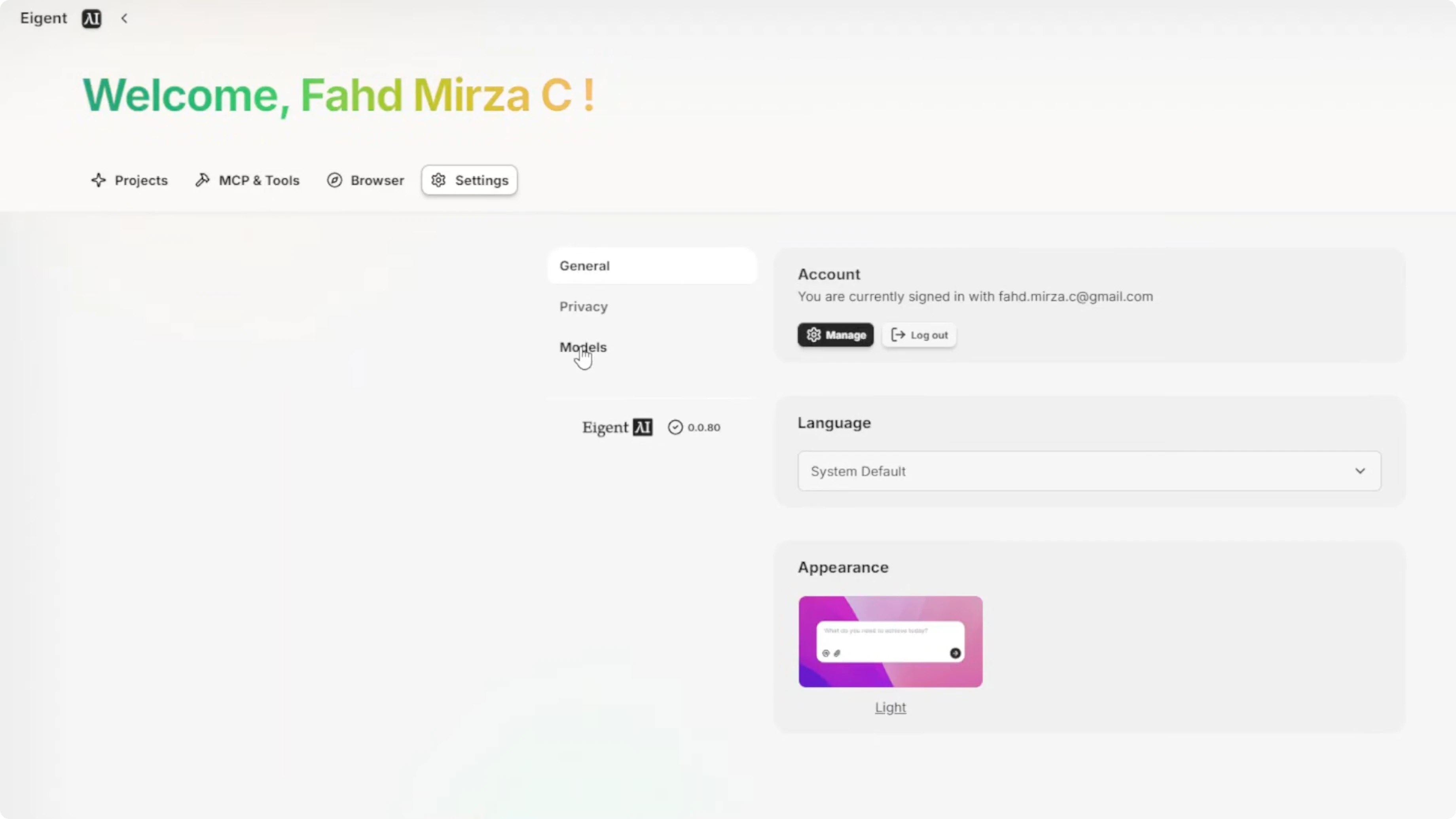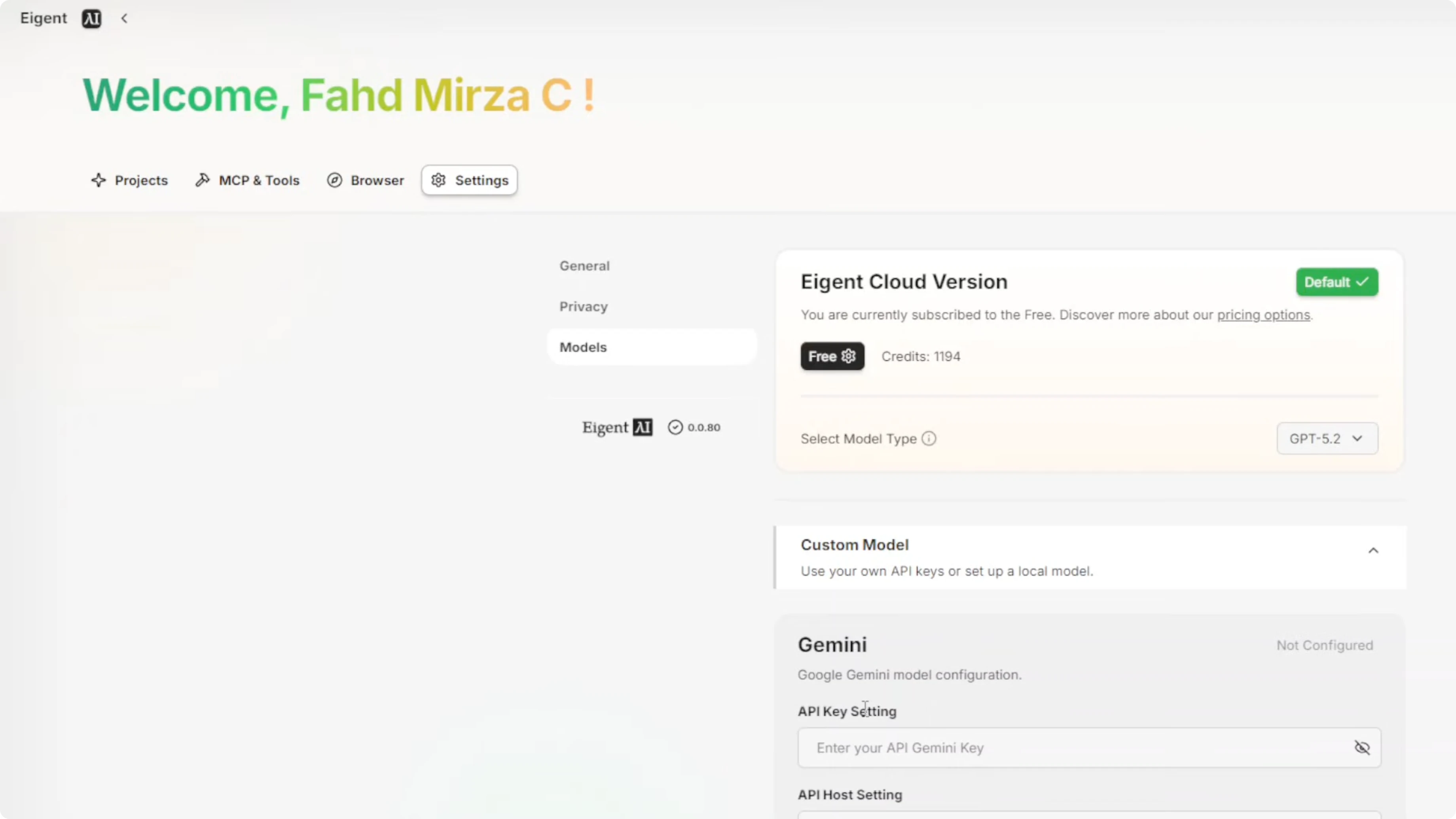 Eigent uses specialized agents like developer, browser, document, and multimodel, working in true parallel execution. It is 100% open source. You can run it fully local. It supports AI models including Ollama based ones, Gemini Pro, and various others, and it handles complex workflows that would break simpler clones. I am using an Ubuntu system and the Gemini Pro model below.