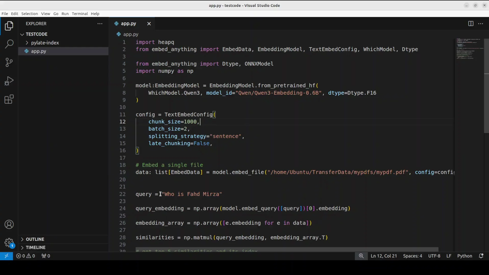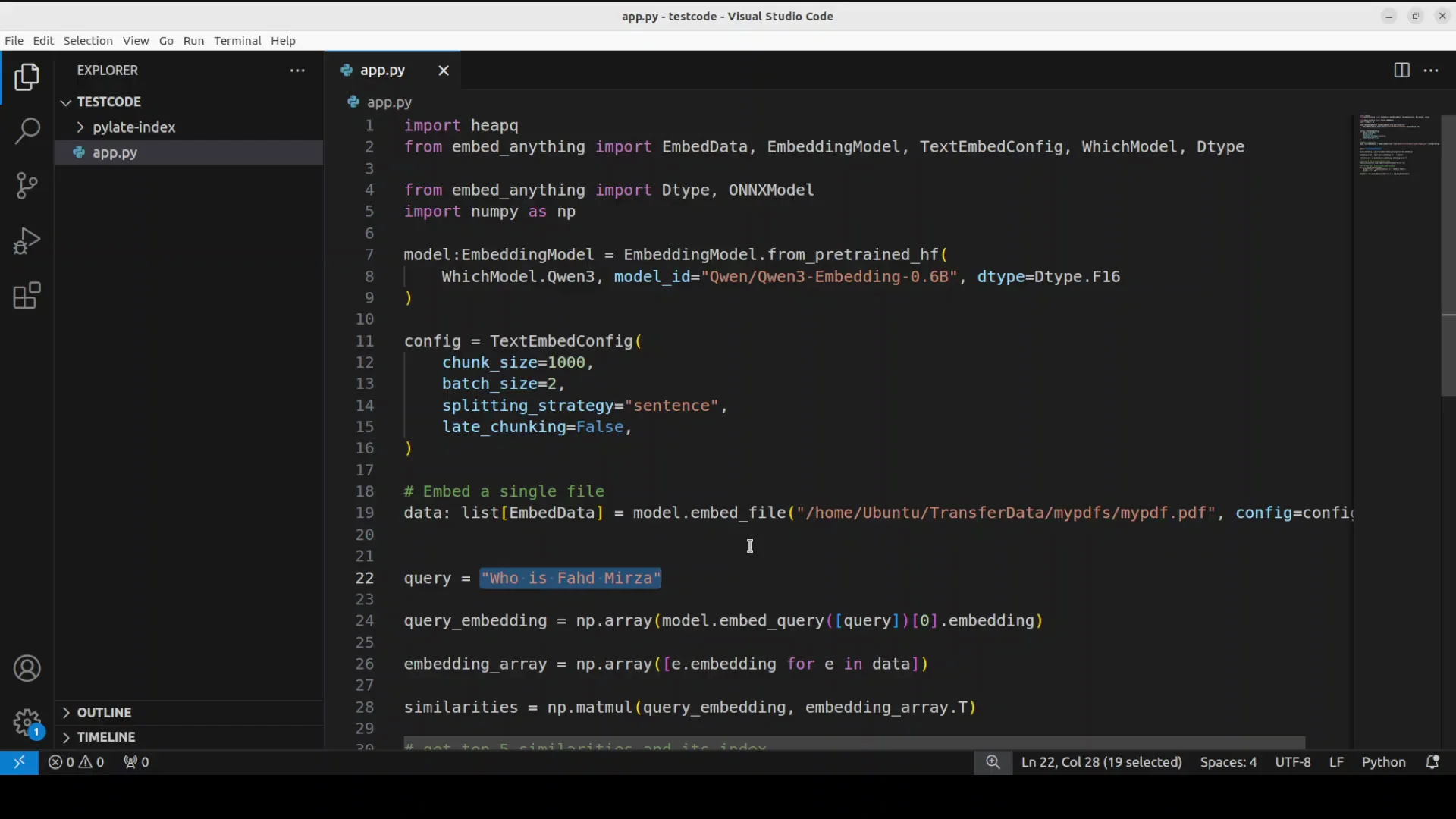 This code shows a basic retrieval augmented generation pipeline with the help of embed anything. I'm using qwen 3 embedding model just a6 billion one from hugging face. The first time I run the code it downloads the model and then I use this model to convert a PDF document from my local system.