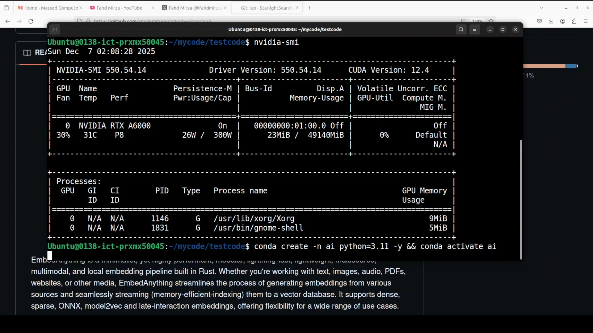 I installed it on my local Ubuntu system. I have one GPU card and VDRTX 6000 with 48 GB of VRAM. You don't need a GPU or VRAM for embed anything. You can install it on CPU.