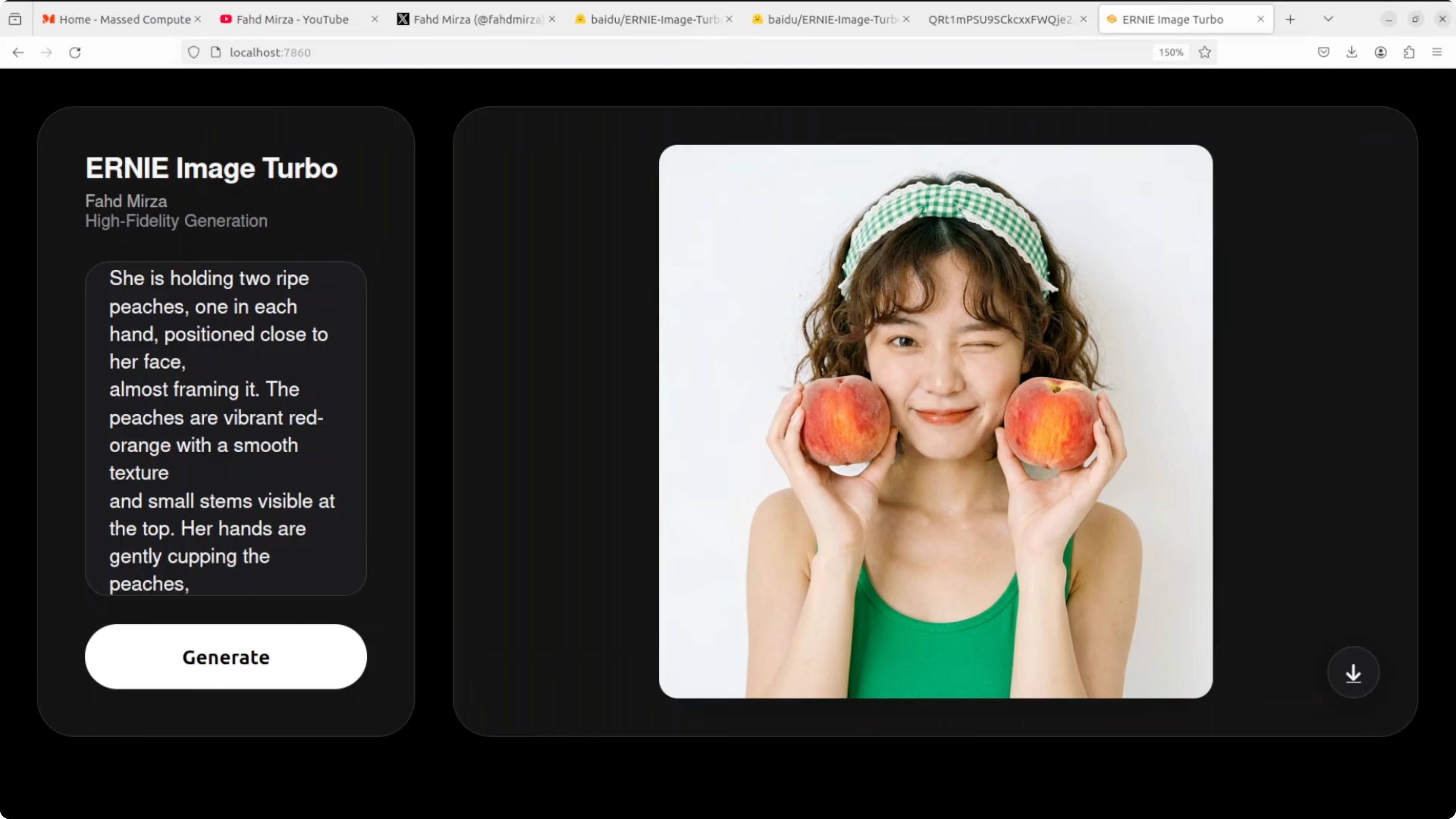 Prompt defined a young woman with short wavy brown hair and a slightly messy look holding two ripe peaches near her face. Skin texture is photorealistic and clean with a natural wink. Peach color, texture, and stems are accurate while hair and a headband accessory are well rendered.