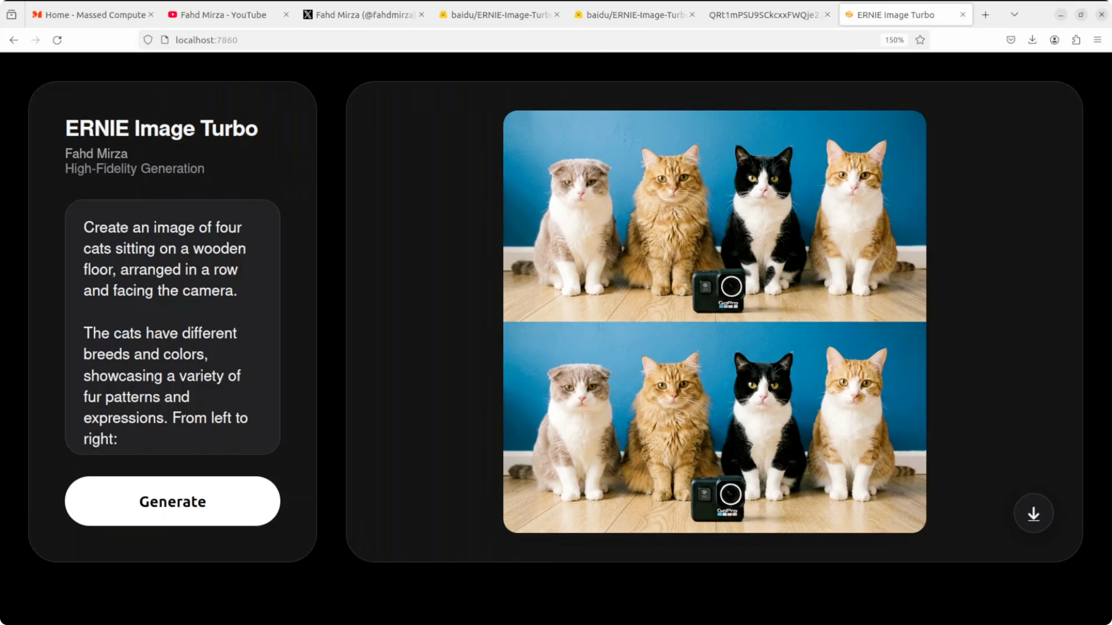 The prompt specified four cats with a specific breed per position and included a GoPro camera with a visible logo. The model nailed all four breeds in the correct order with accurate object inclusion and background detail. The GoPro placement and logo are accurate and lighting matches well.