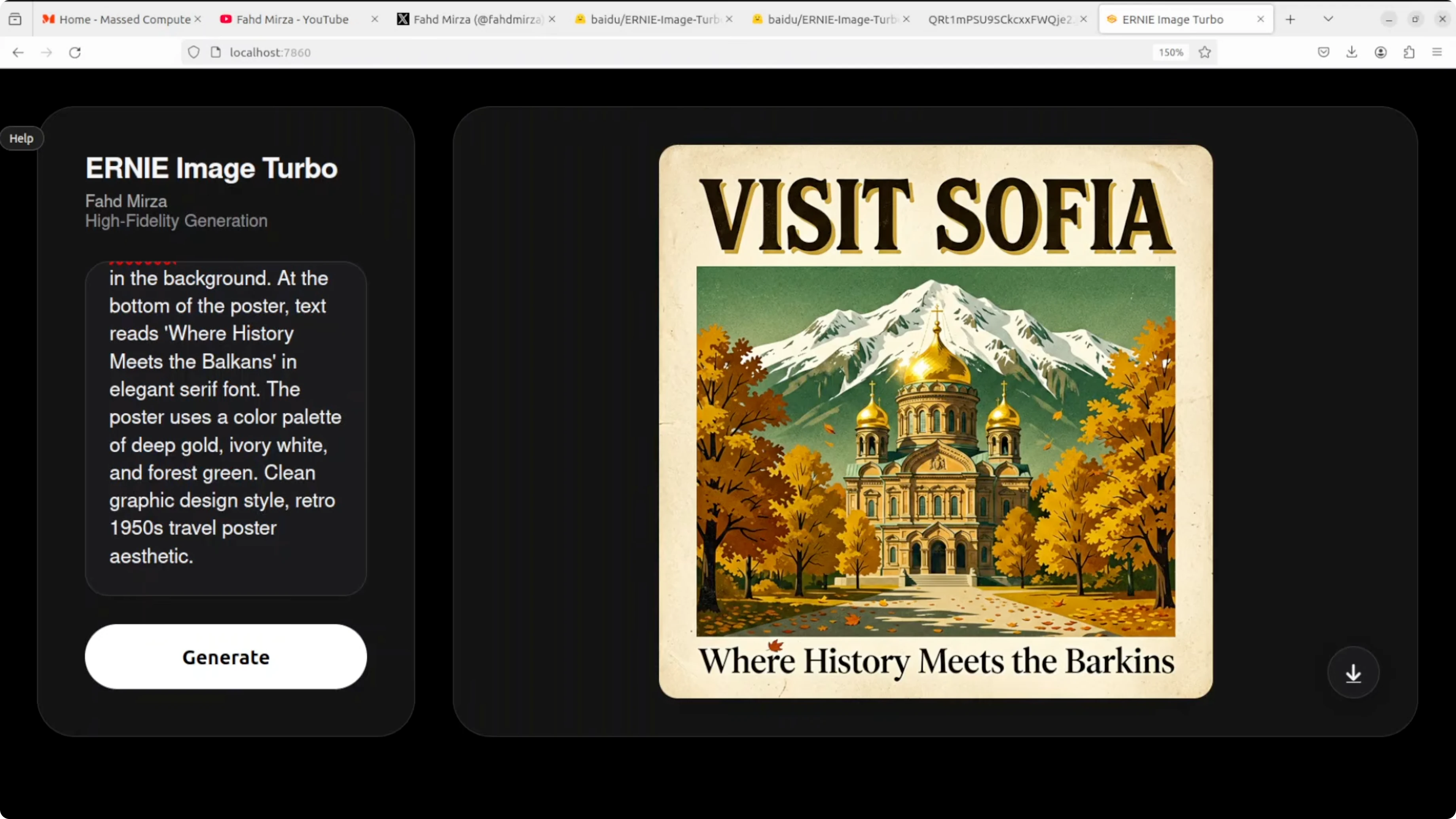 The prompt requested a vintage style travel poster for Sofia, Bulgaria with top text Visit Sofia, the Alexander Nevsky Cathedral with gold domes, Vitosha Mountain in the background, autumn trees, and a retro palette. Visual composition and layout are outstanding. Visit Sofia at the top is bold, clean, and correctly spelled.