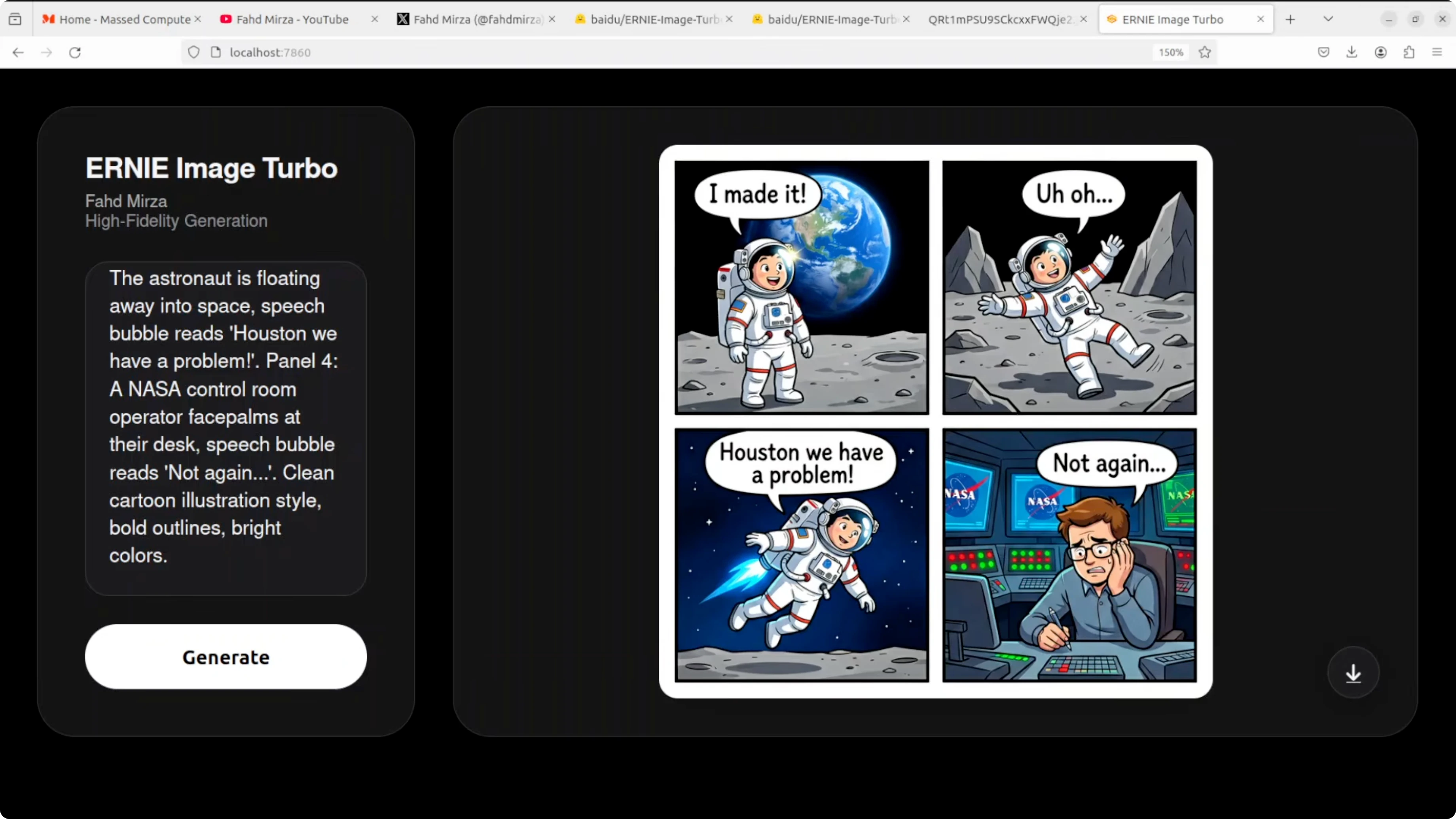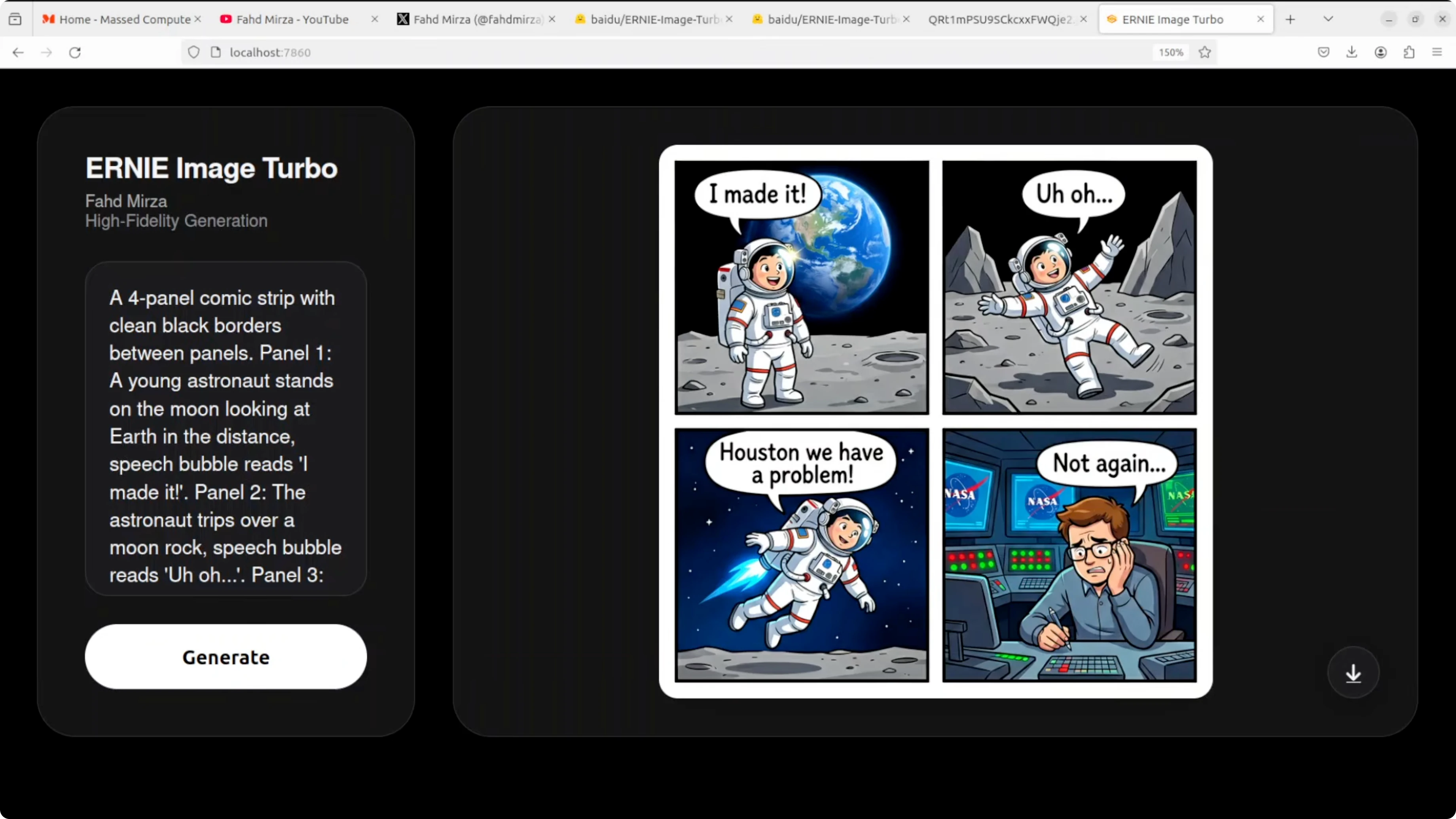 This test targeted a four panel comic with clean black borders, a sequential narrative, speech bubbles, and text accuracy. All four speech bubbles are perfectly spelled and correctly placed. The narrative flows logically panel to panel and character consistency is impressive.