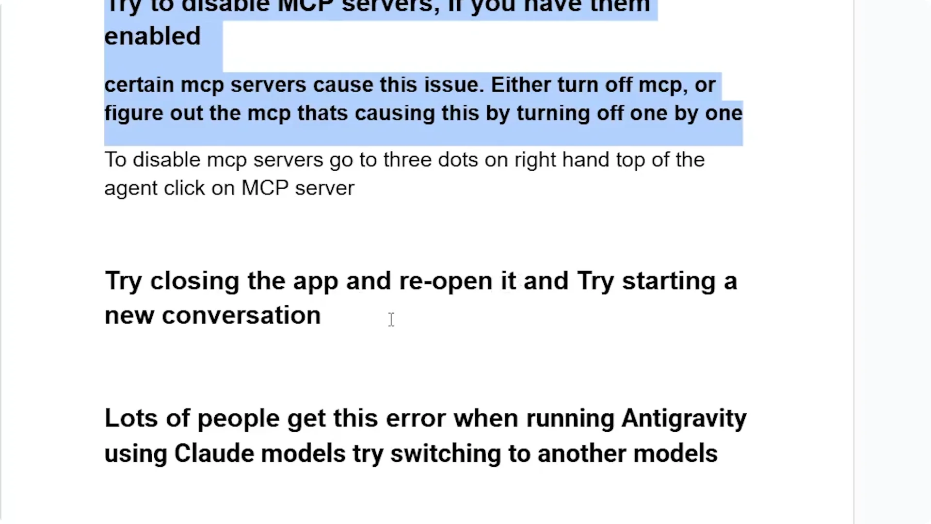 Disabling MCP servers resolves this for many users. If not, restart the app, start a new conversation, switch away from cloud models, and, if necessary, switch Google accounts in case you hit a quota. Follow the steps carefully and confirm the fix by running a fresh session.