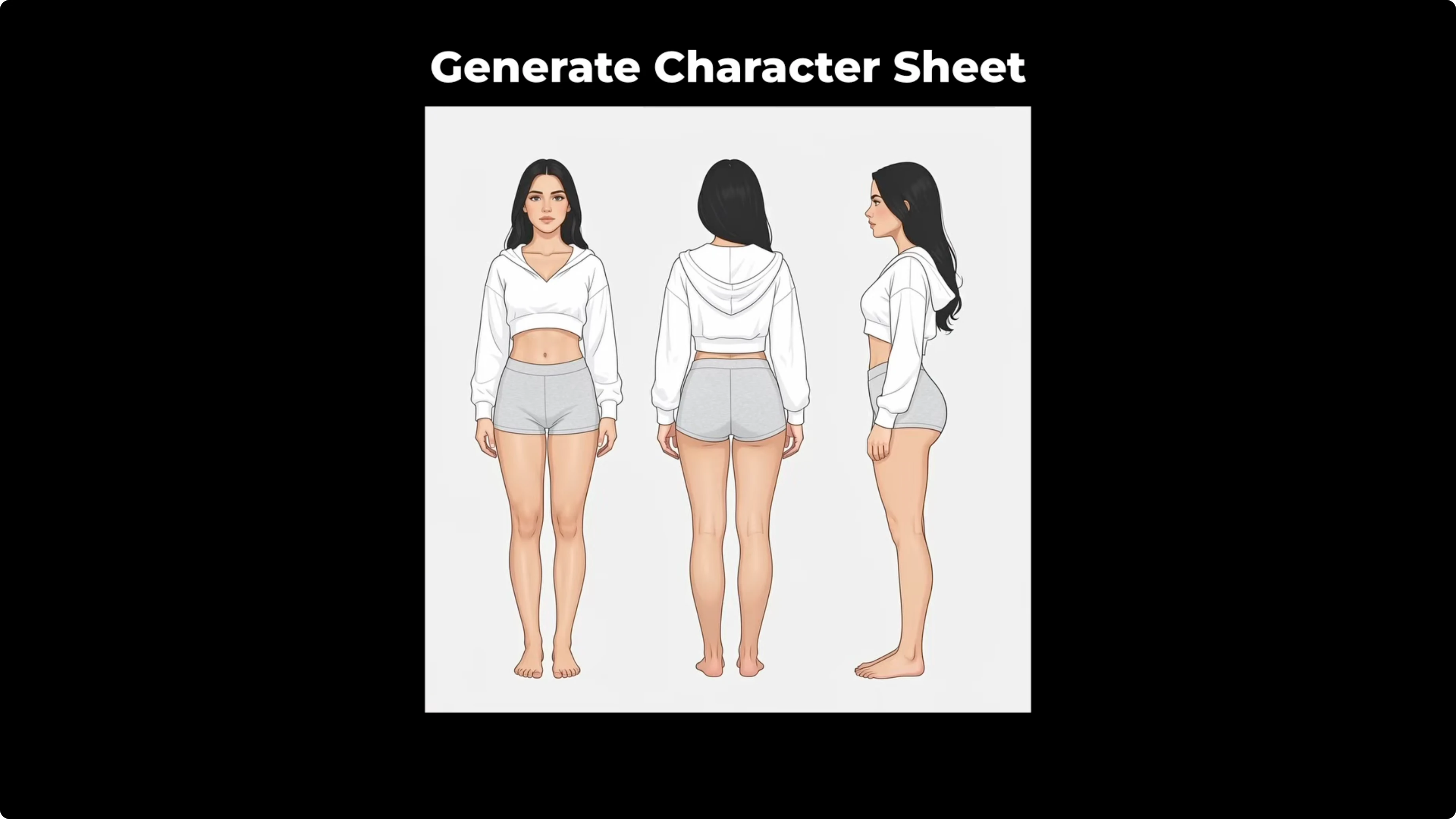 - Positive prompt: generate a character sheet of the woman showing front profile, back profile, and side profile.