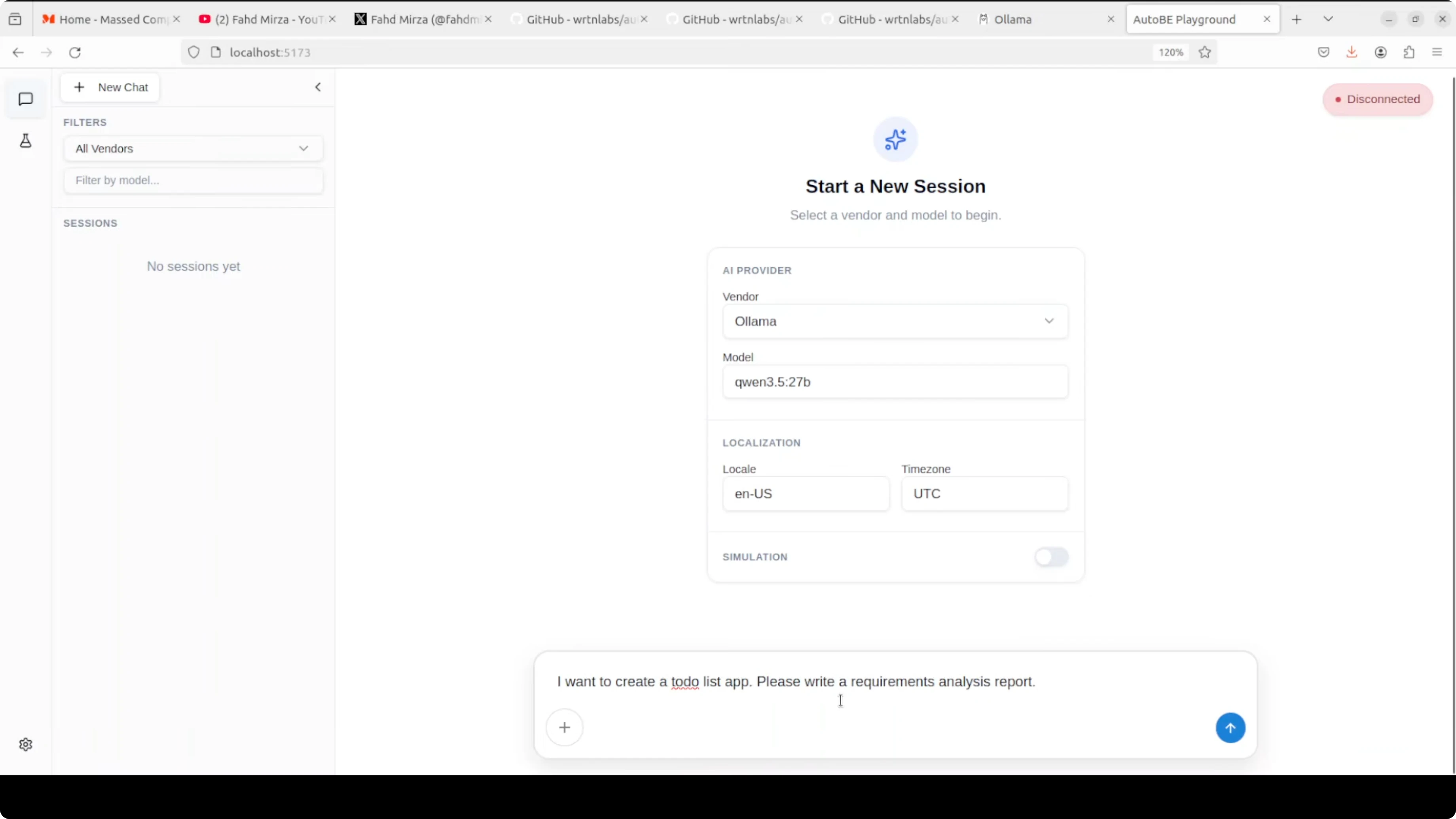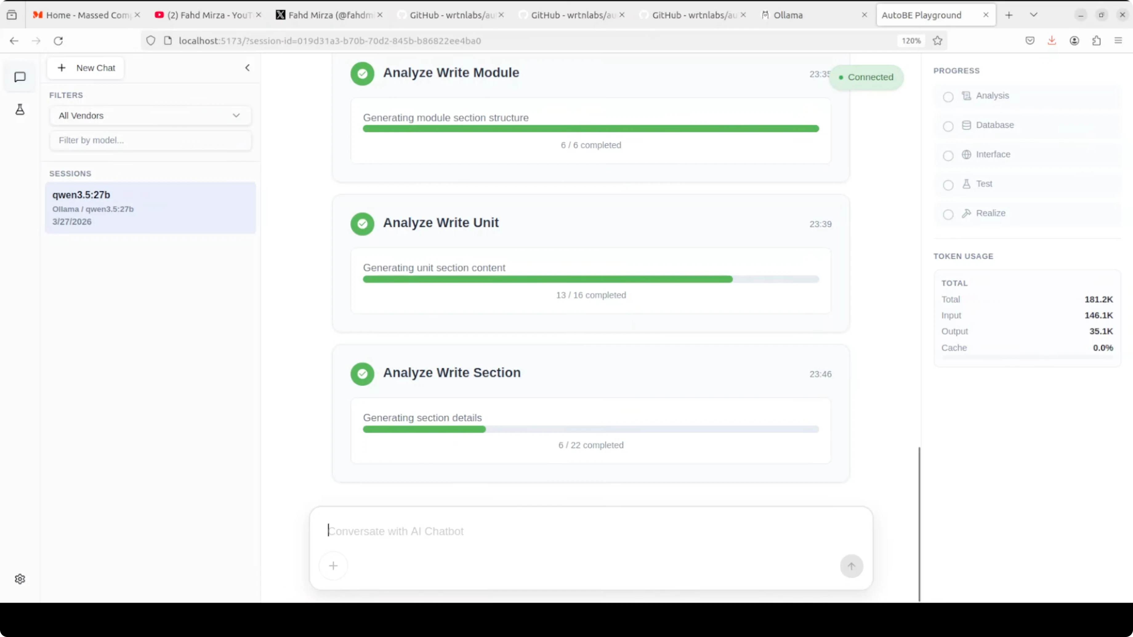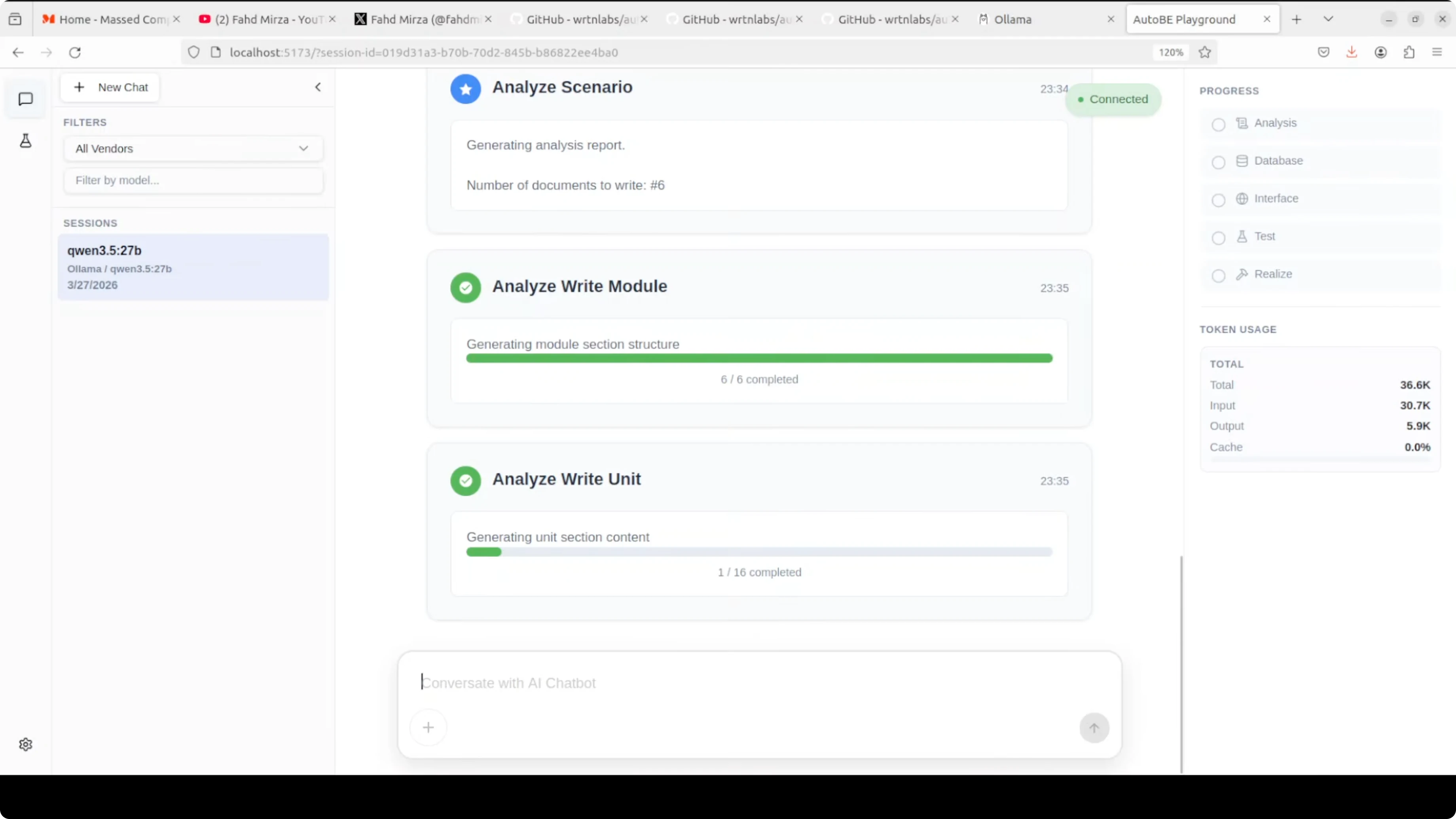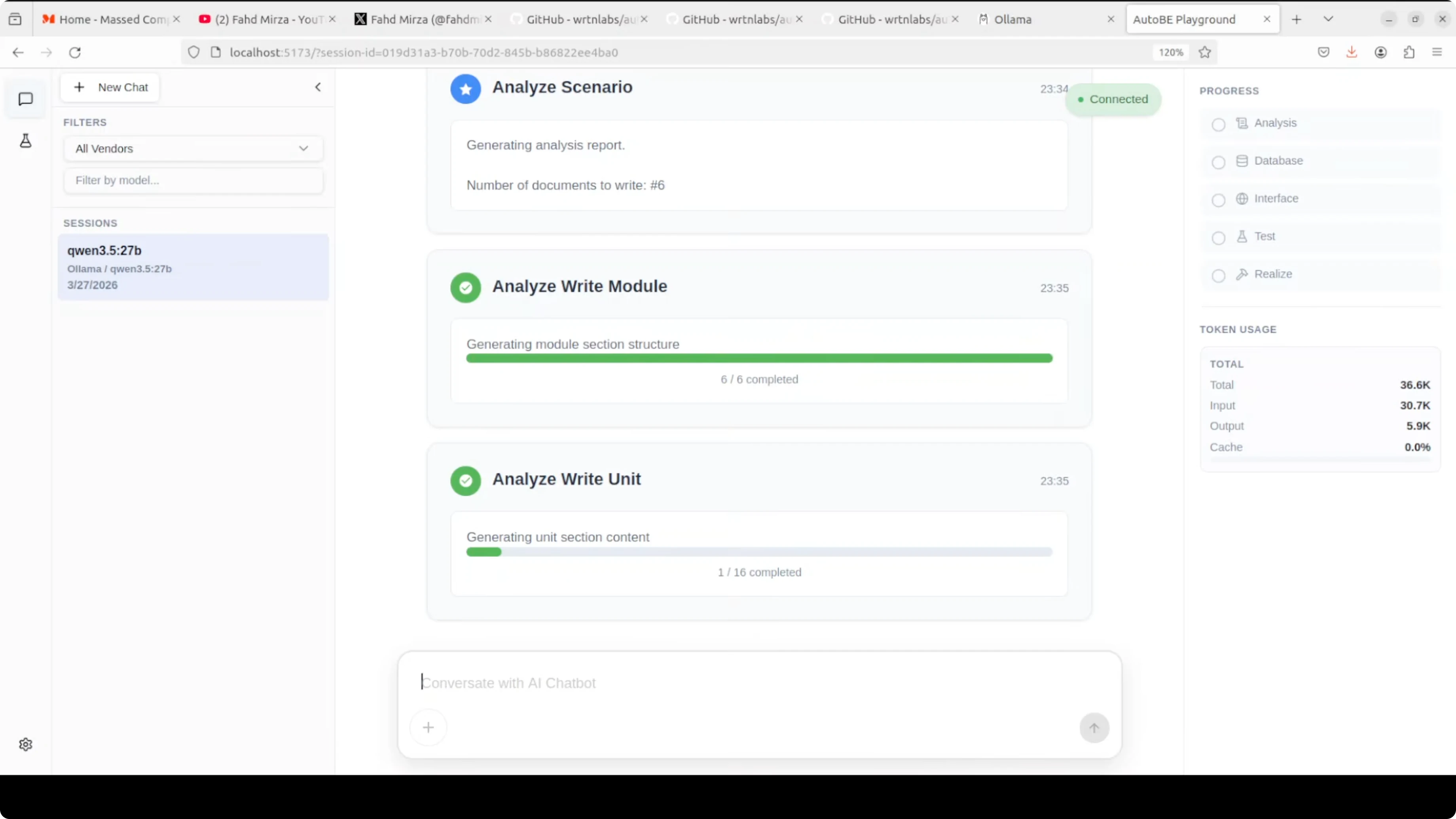 Save the vendor, return to the main screen, and select your Ollama vendor from the dropdown. Enter the model tag exactly as shown by your ollama list command. Start your session and let AutoBE perform analysis, design, and code generation for your backend.