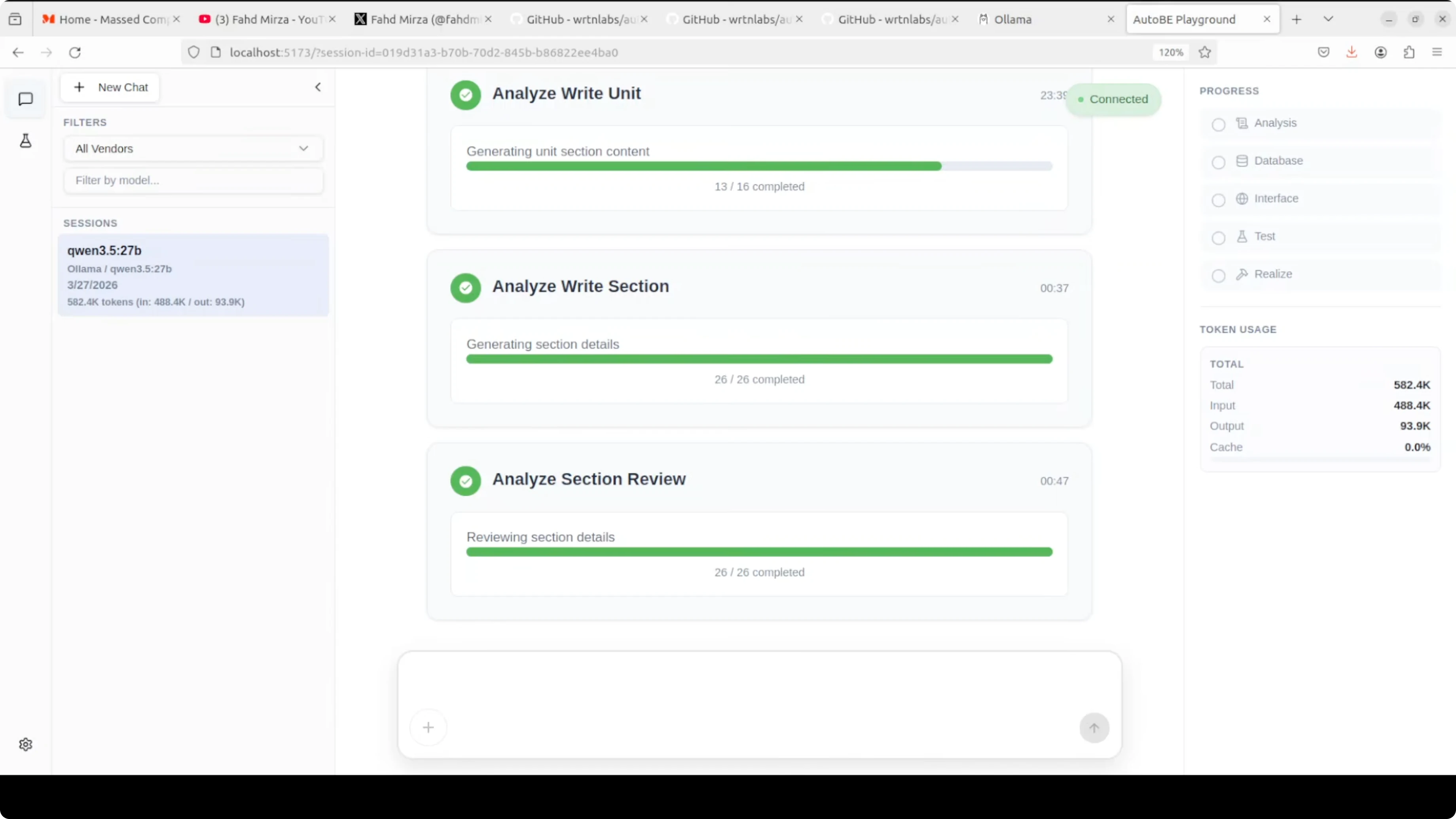 From there it moves to database schema design, interface definitions, test plans, and code realization. The UI shows progress and token usage while it works.