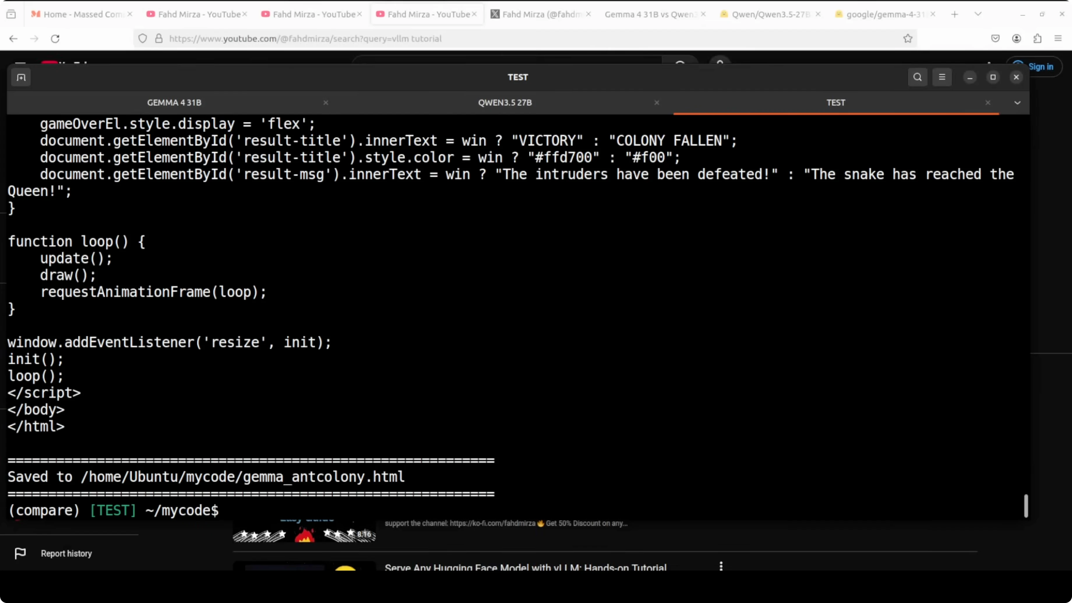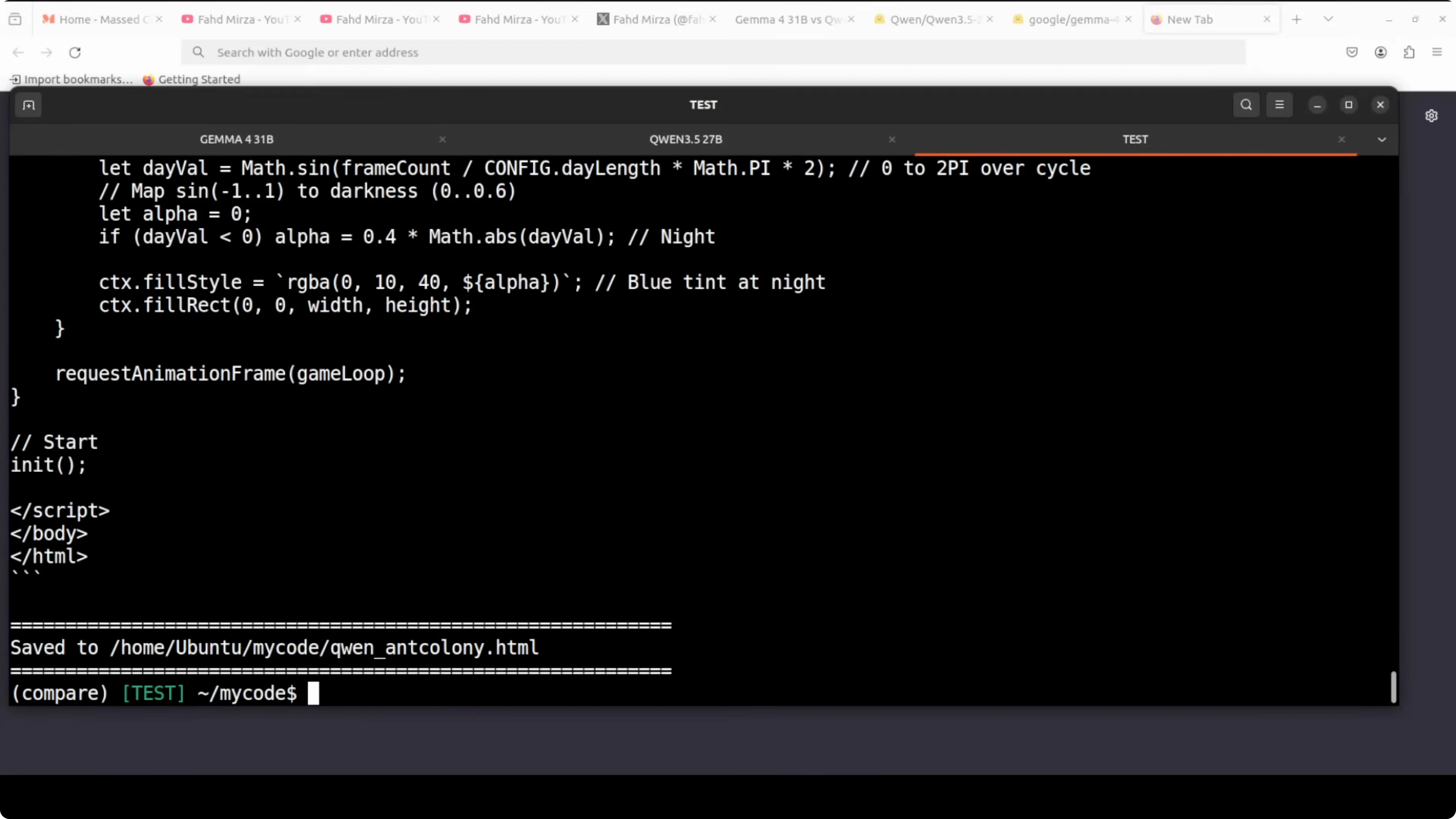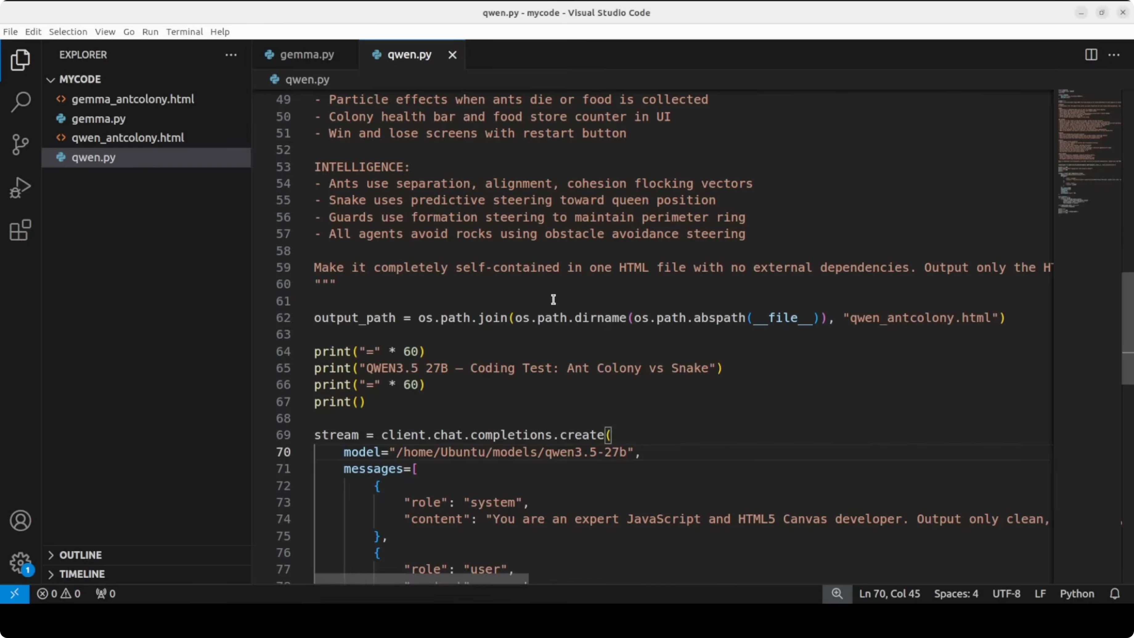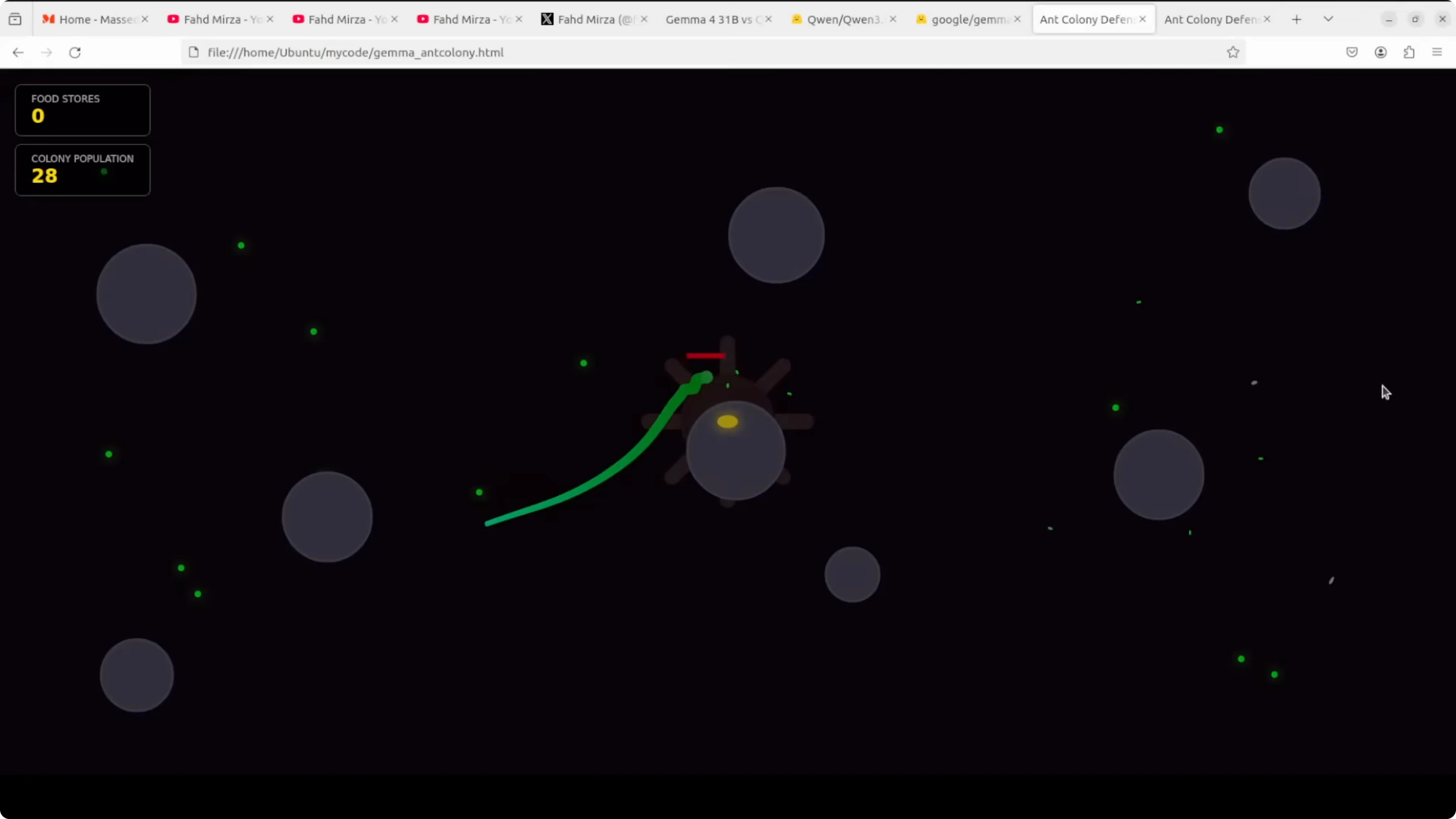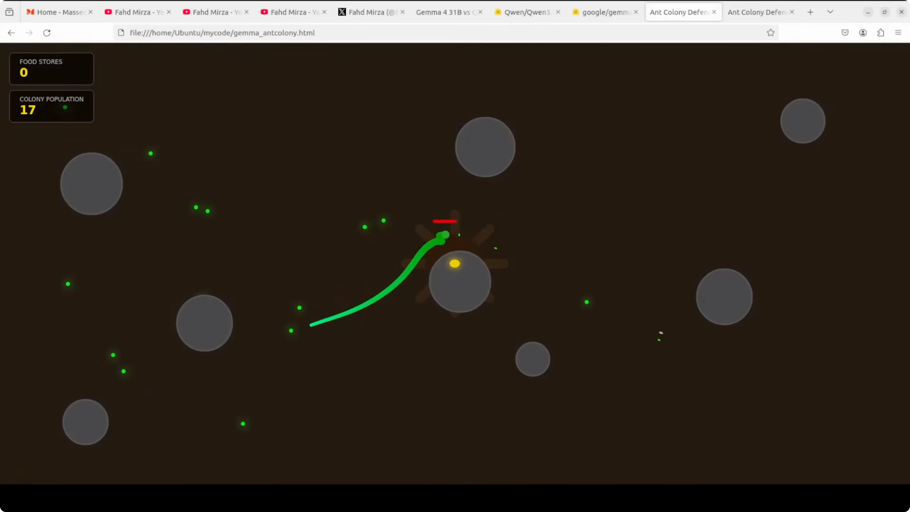 - Gemma produced index.html for the ant colony. It ran with visuals and behavior, but on later reloads the snake stalled and did not progress.