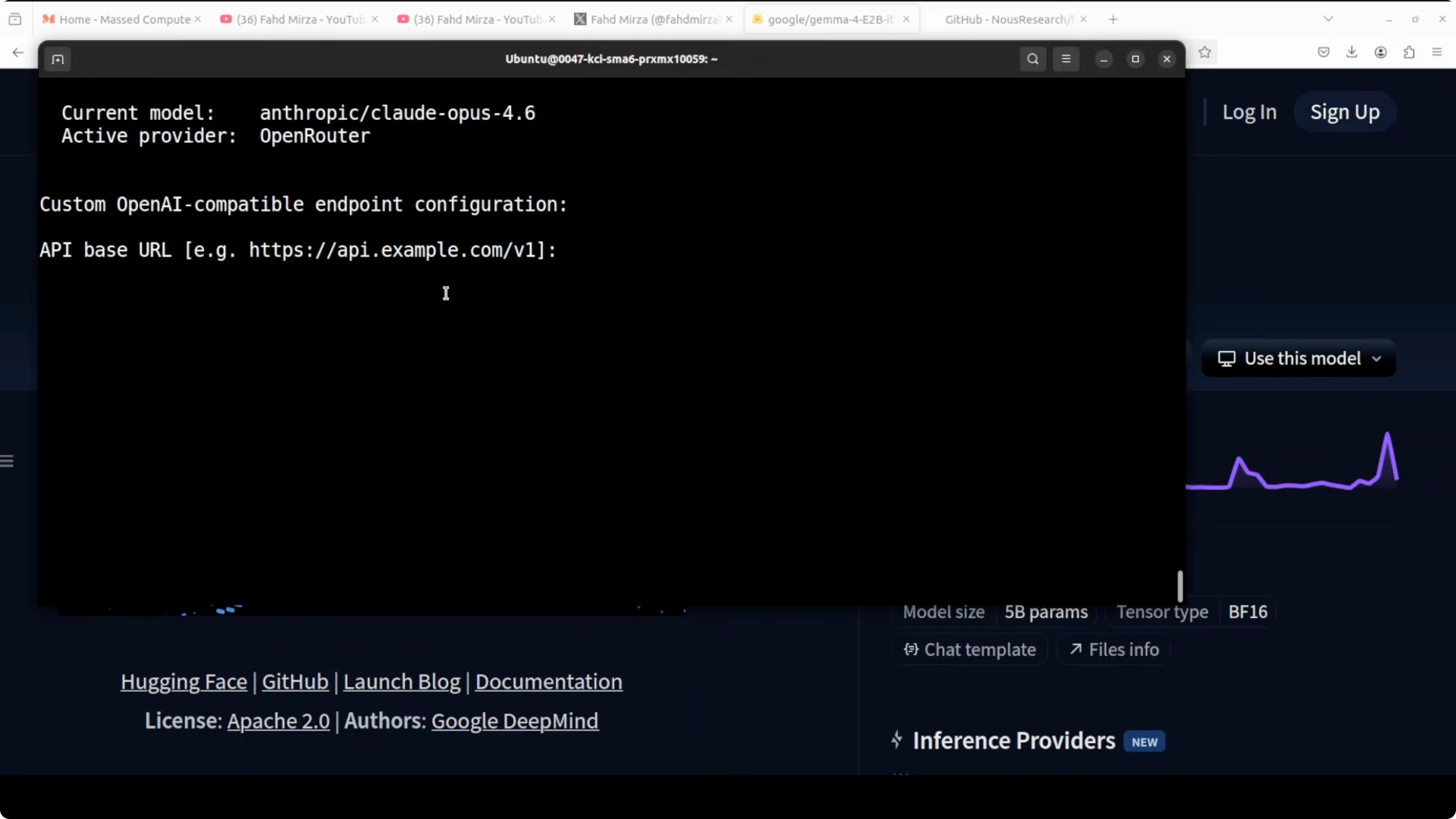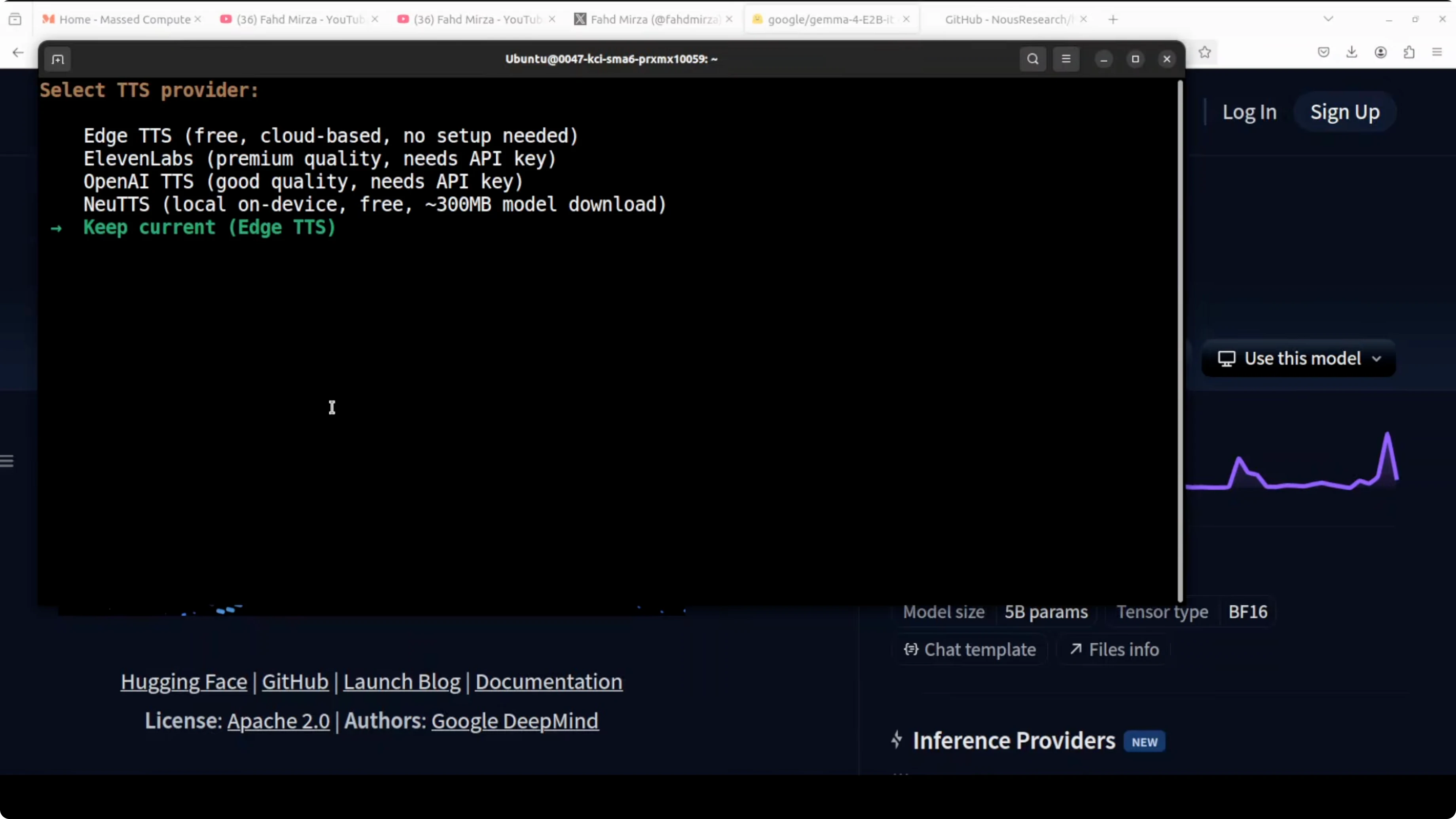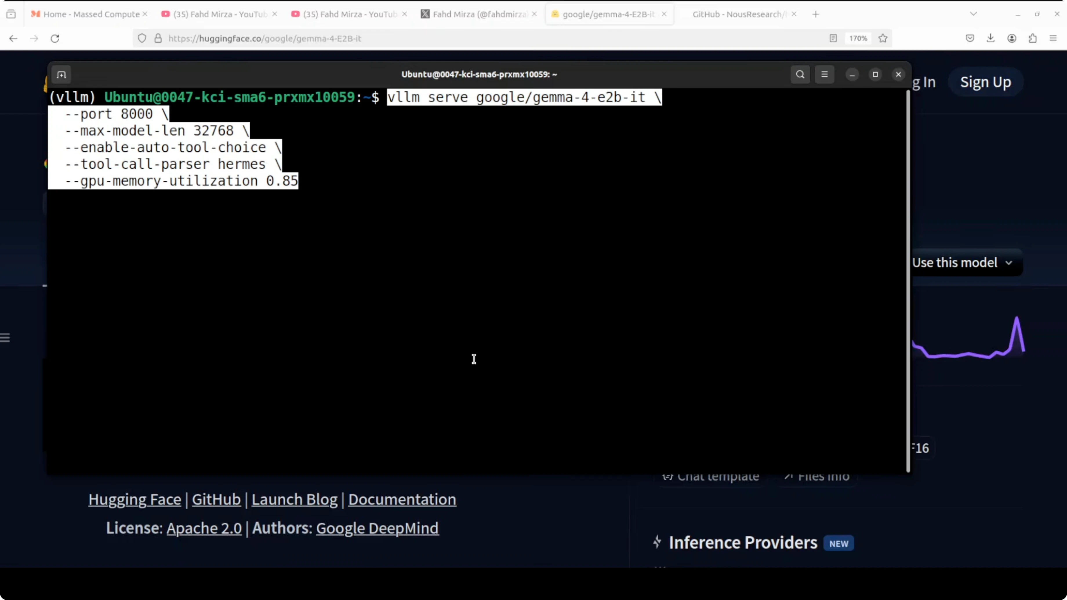 I installed and integrated Gemma 4 E2B from Google with Hermes Agent on Ubuntu, serving the model locally through vLLM. I used an Nvidia RTX 6000 with 48 GB of VRAM. This setup gives me text, vision, and audio support from a small instruction-tuned model running on a single GPU.