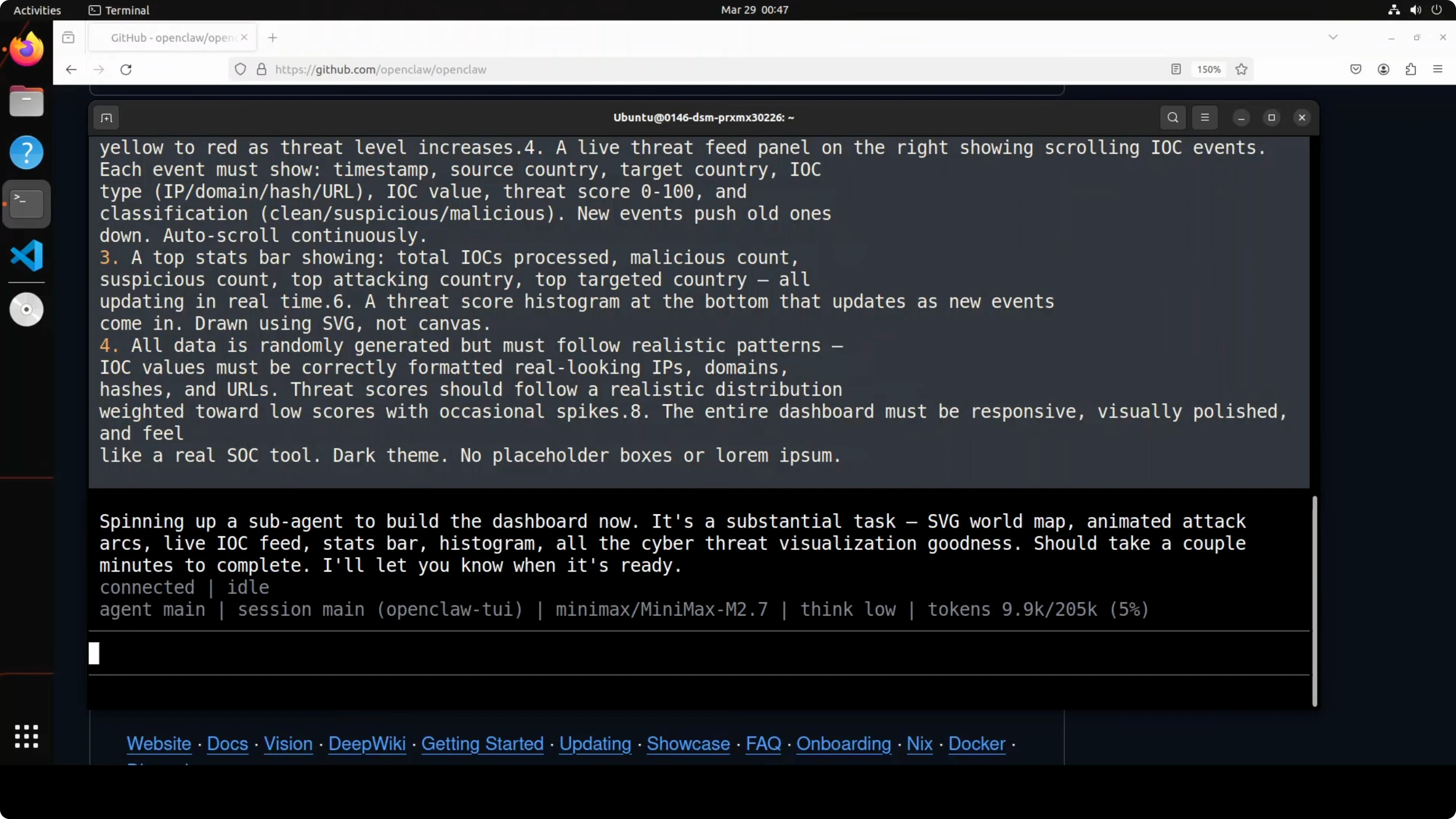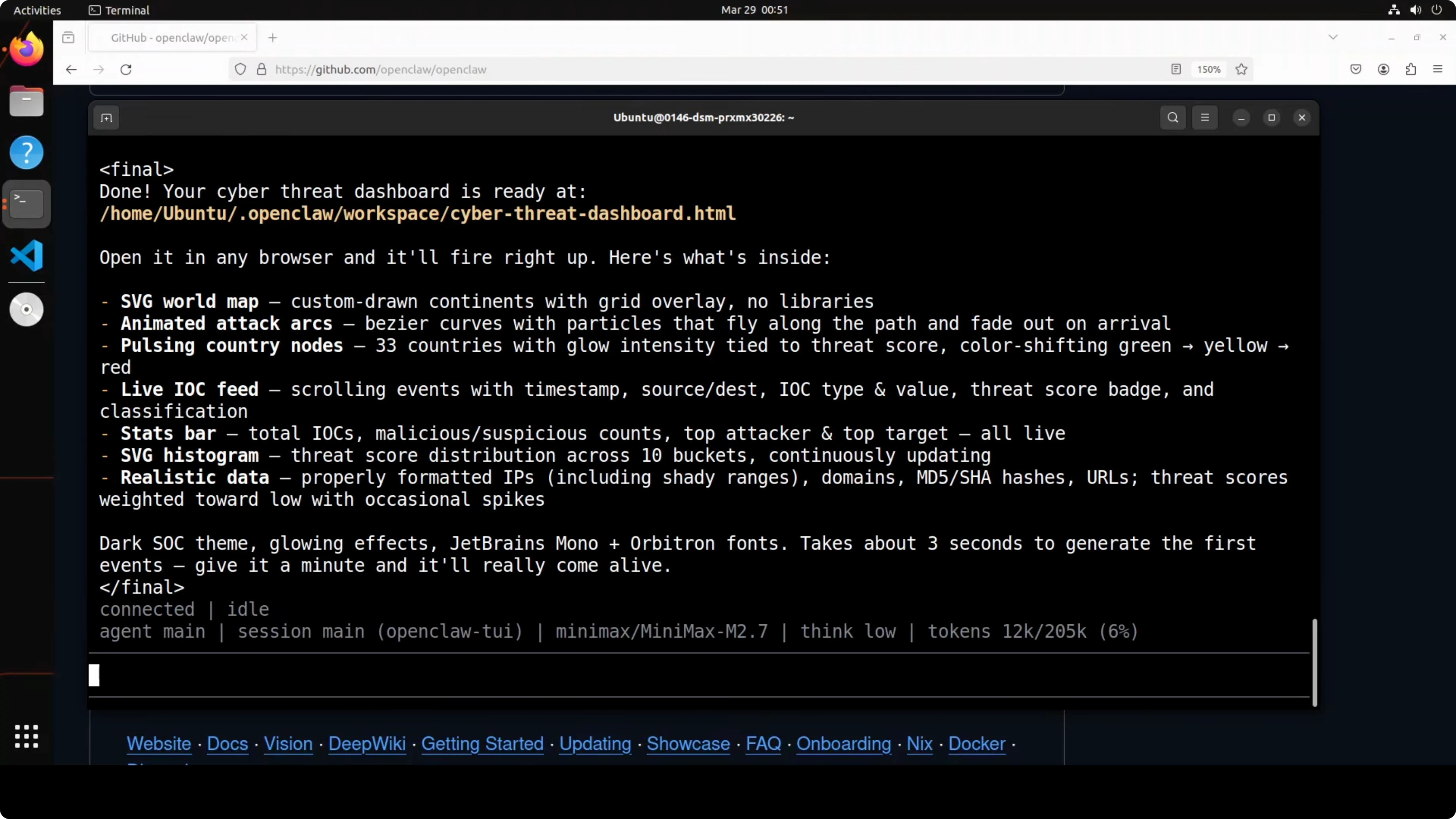 | Cold code creation - raw SVG world map with Bezier arc animation in vanilla JS, no libraries, sub-agent use | Slower to finish, but delivered a real-time feel with arrows streaming, accurate world map including New Zealand, live feed, responsive interactions, moving total IOCs | Finished earlier, map was okay, random selection worked, but the score range felt off, feed looked blunt, and the page lacked a real-time feel | Quality clearly favored GLM; speed favored MiniMax |