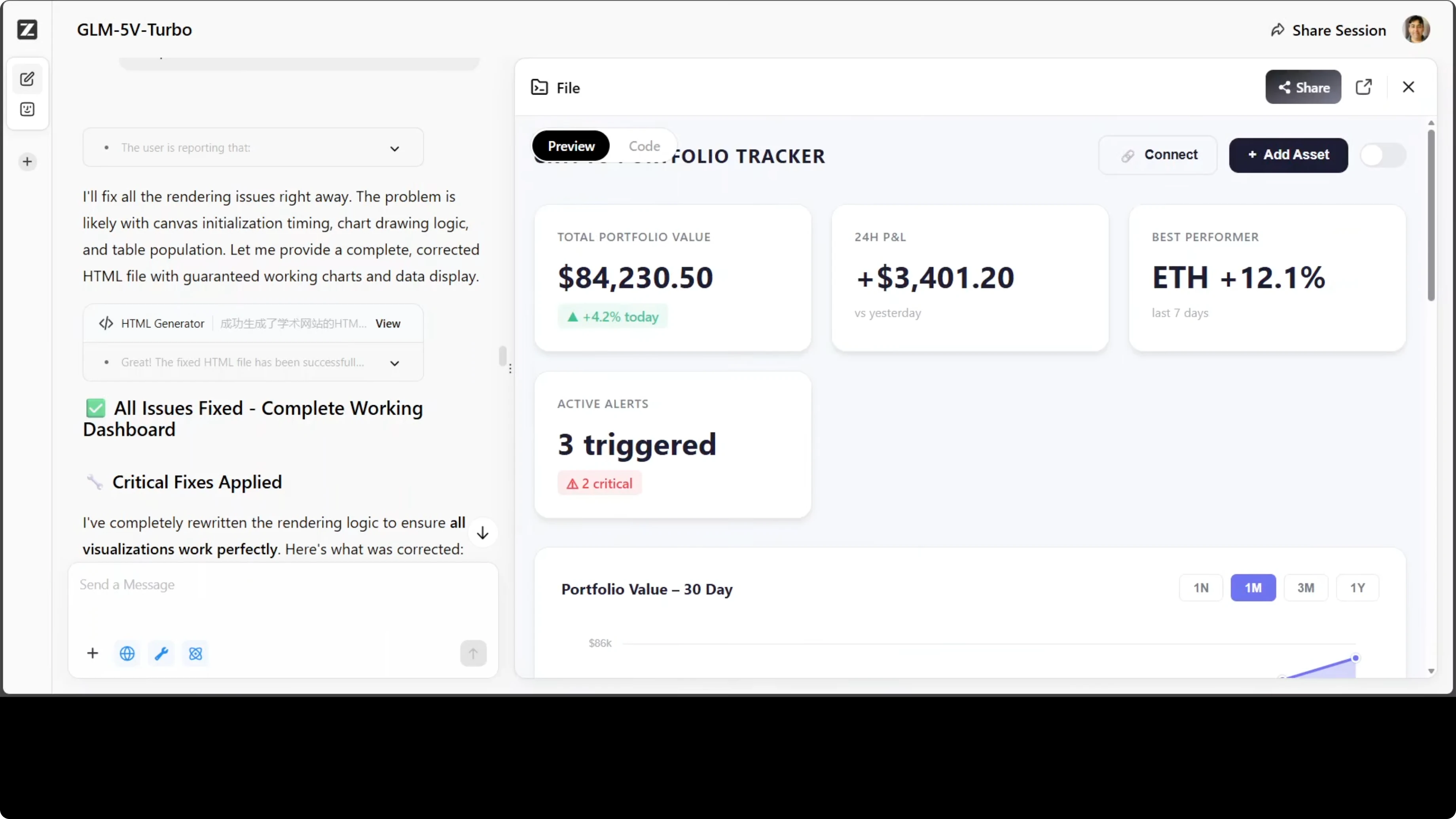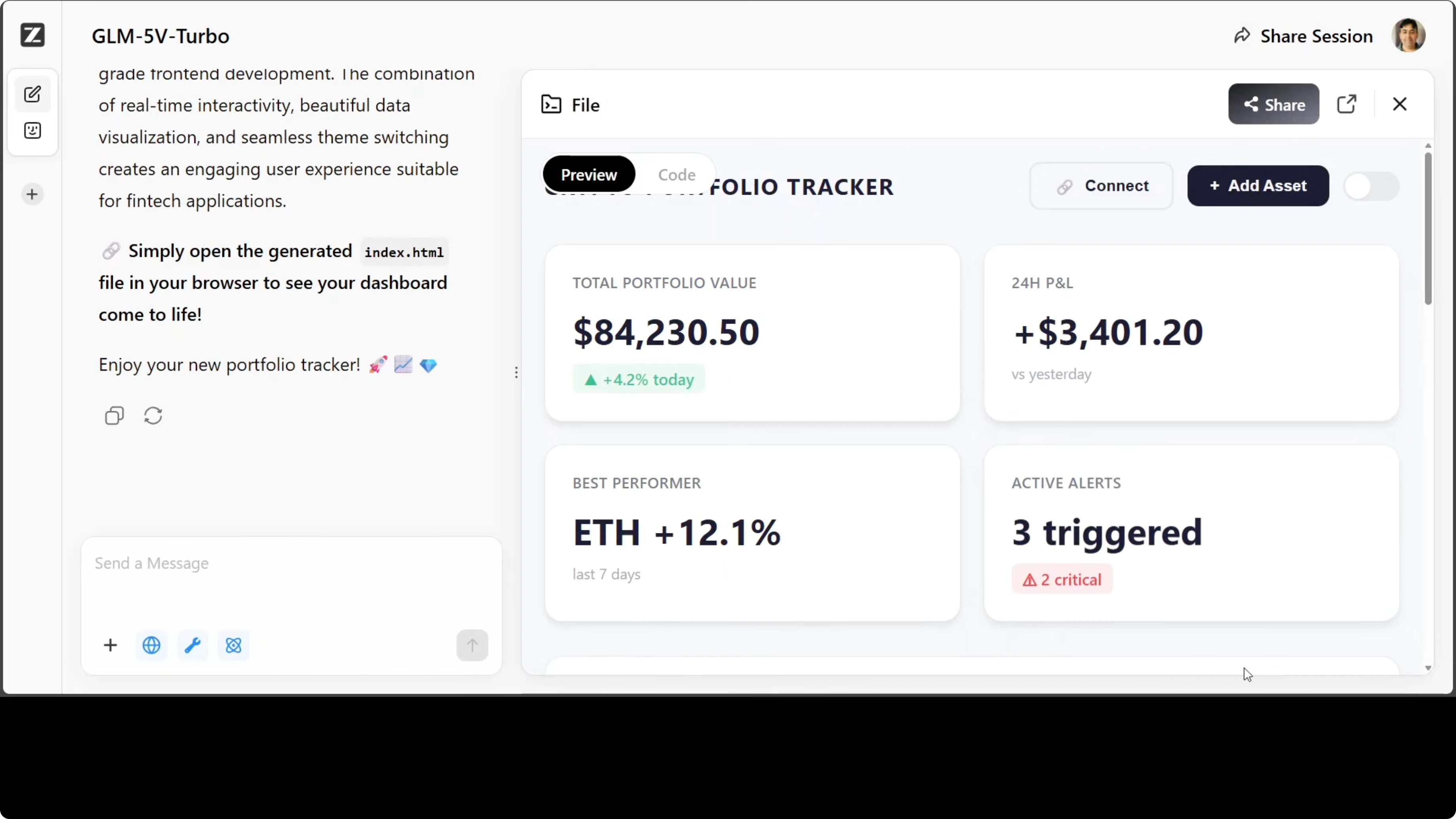 I took a rough wireframe sketch of a crypto portfolio dashboard, dropped it into GLM-5V-Turbo, and asked for a complete working dashboard in a single HTML file. No libraries, no frameworks, just sketch to code. The model produced a responsive UI, and on a second pass it filled in the missing charts and details.