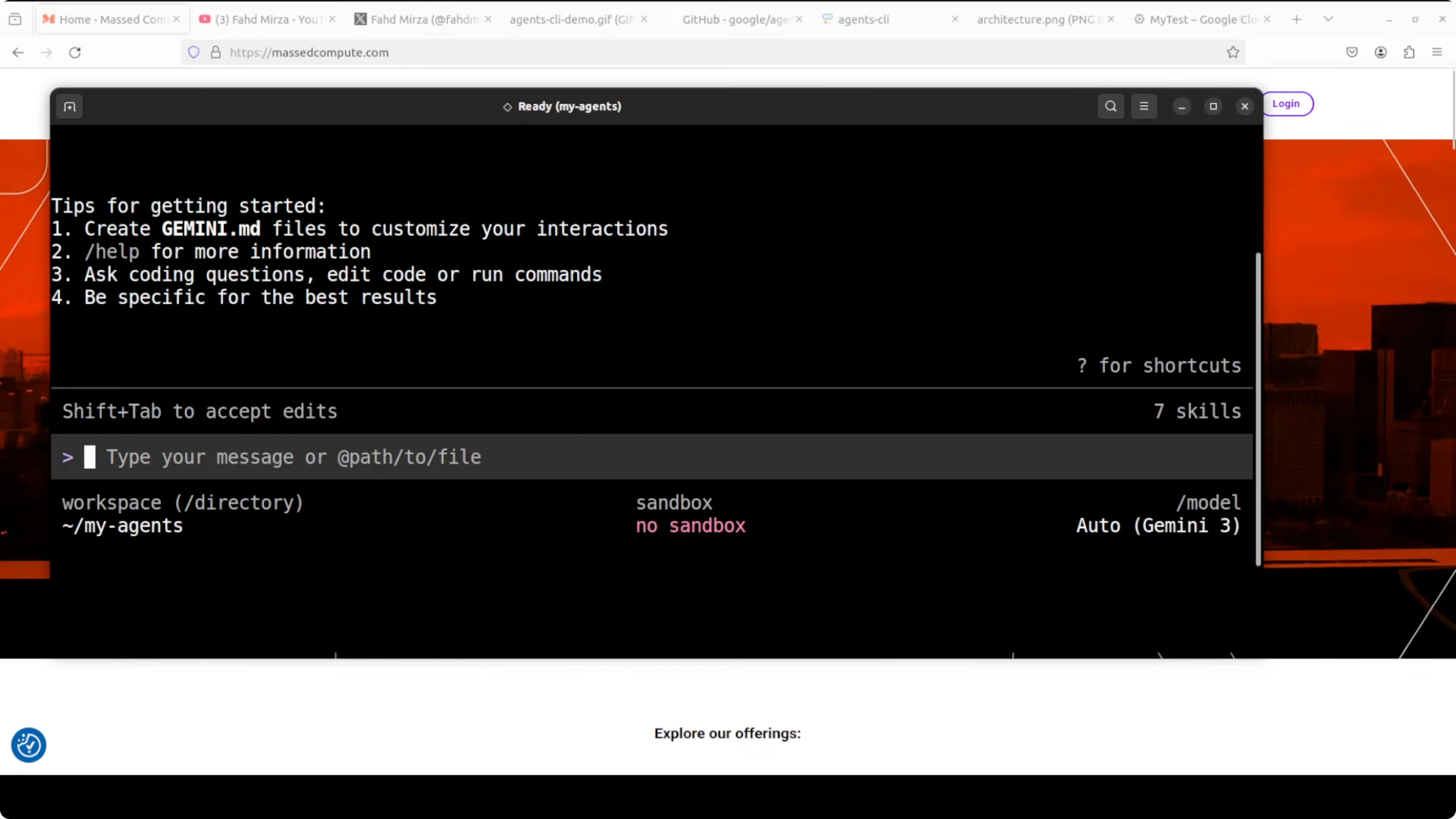 geminiPick the Gemini API key option when prompted. Confirm that Agents-CLI skills are loaded on the right. You should see scaffold, build, eval, deploy, observability, publish, and workflow available.