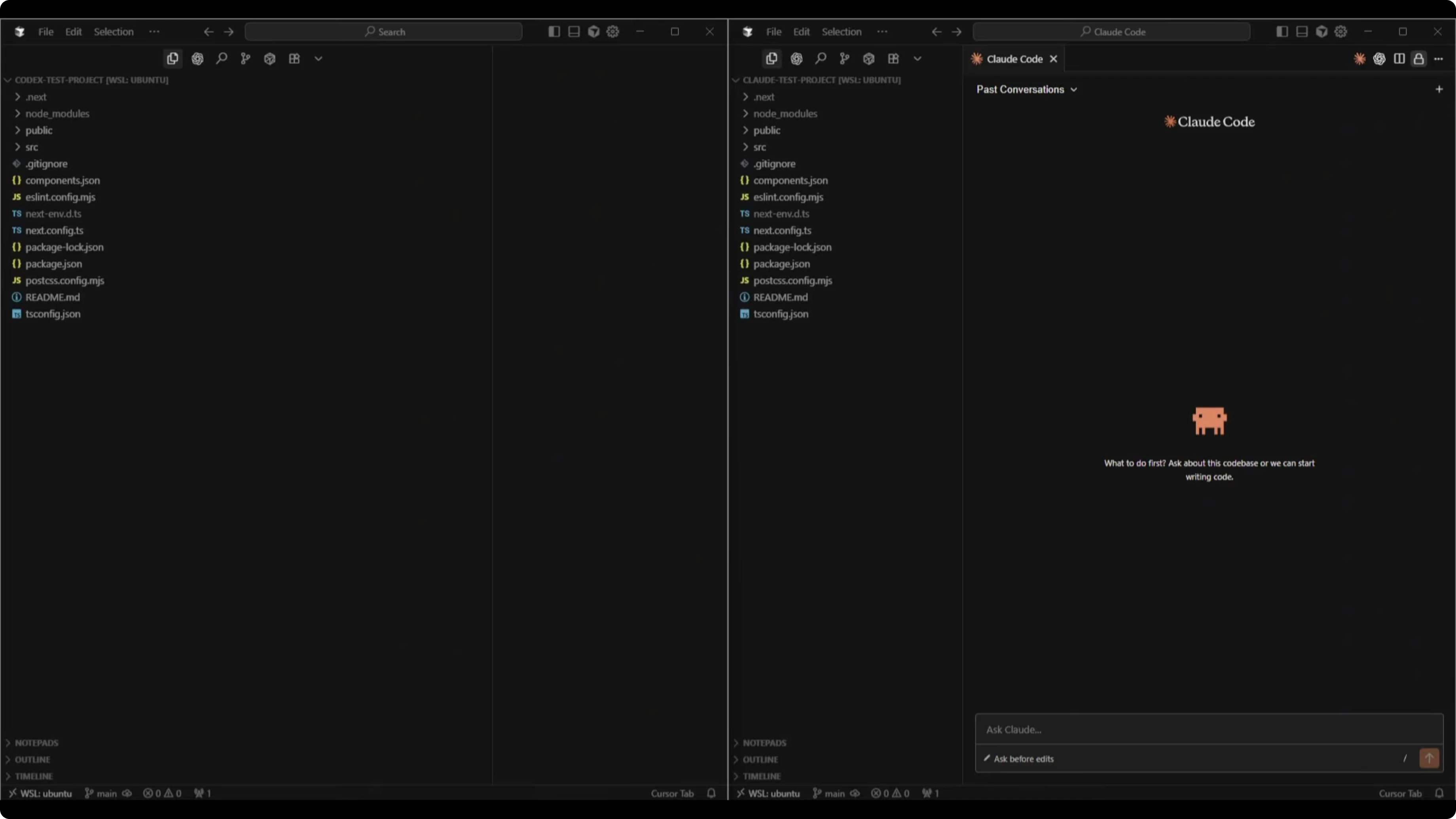 I created two identical Next.js TypeScript Tailwind skeleton projects. One lived in a Codex test project directory and the other in a Claude Code test project directory. Both were clean starts with their respective coding extensions initialized in Cursor.