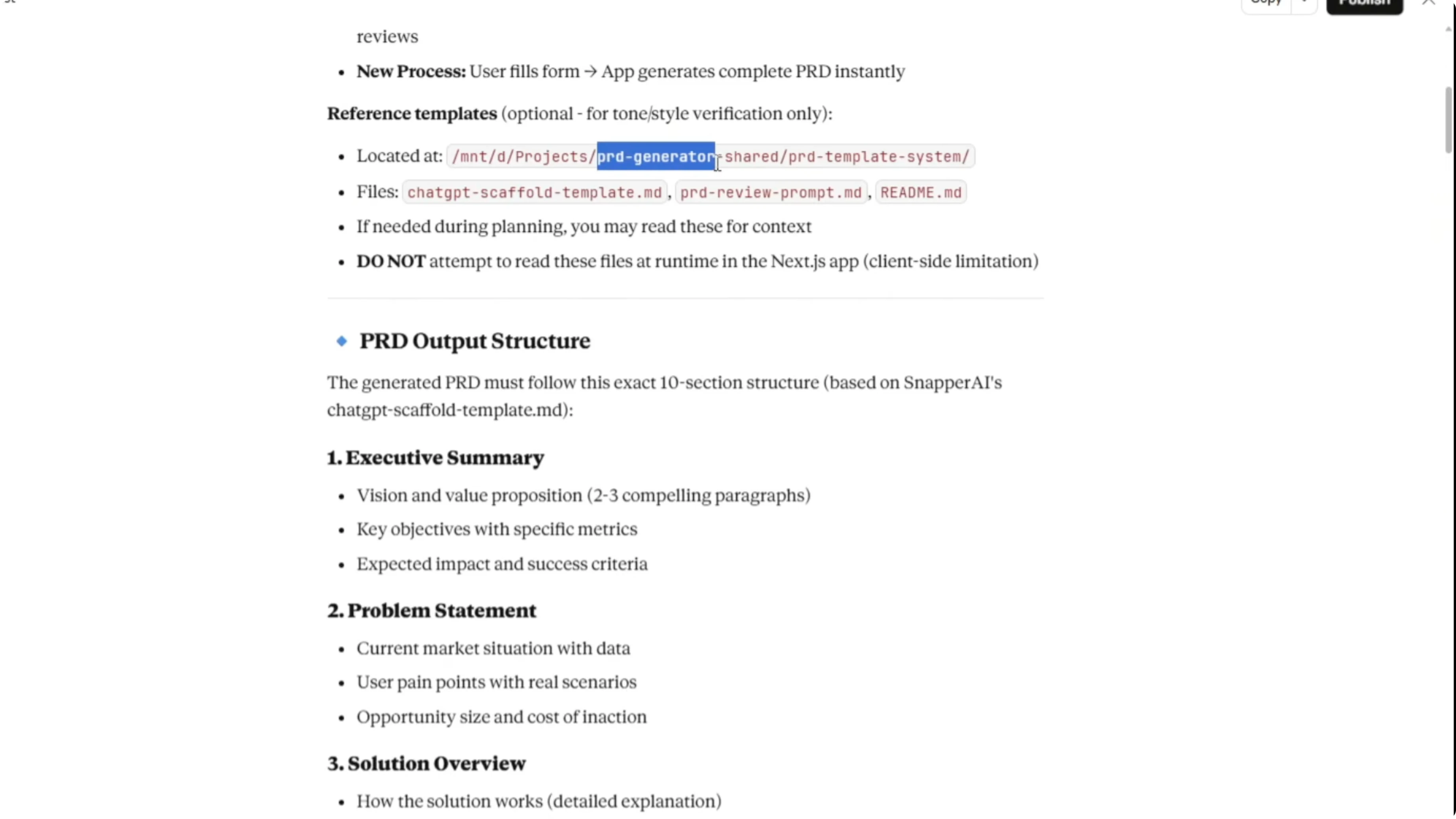 To make it easier for the models, I prepared a shared directory with the existing prompt templates. I named it "PRD generator shared" on my system and pointed both tools to that path for reference. The output target was clear too: a clean PRD structure produced instantly once the user submits the form.
