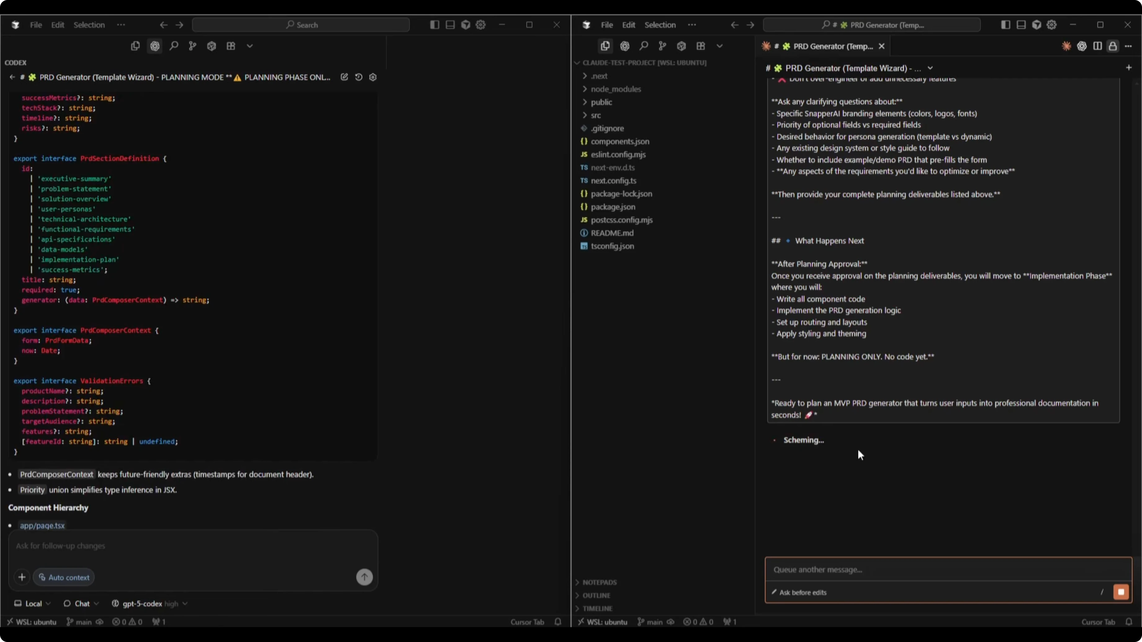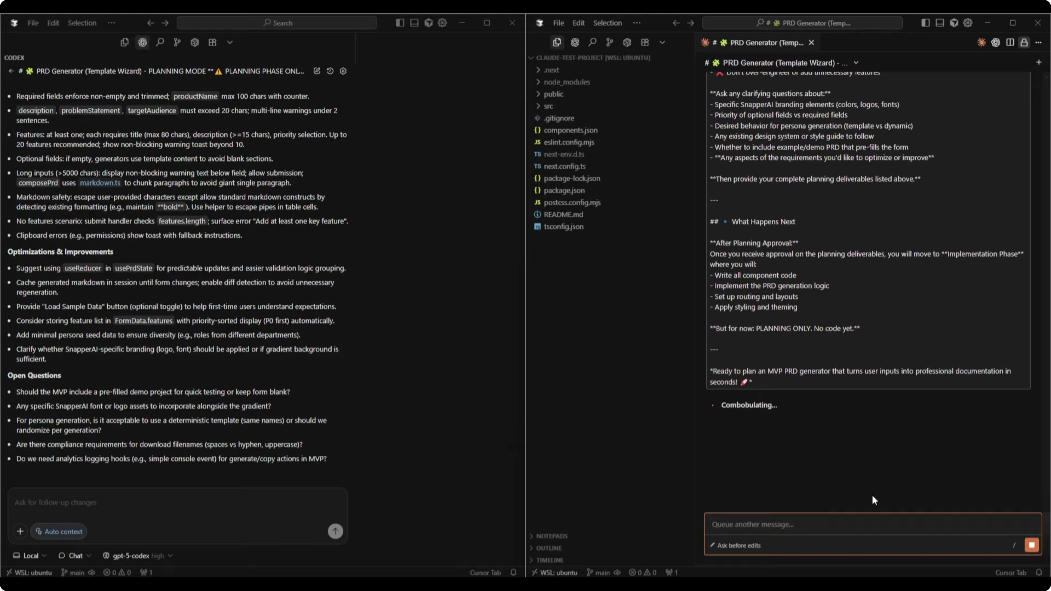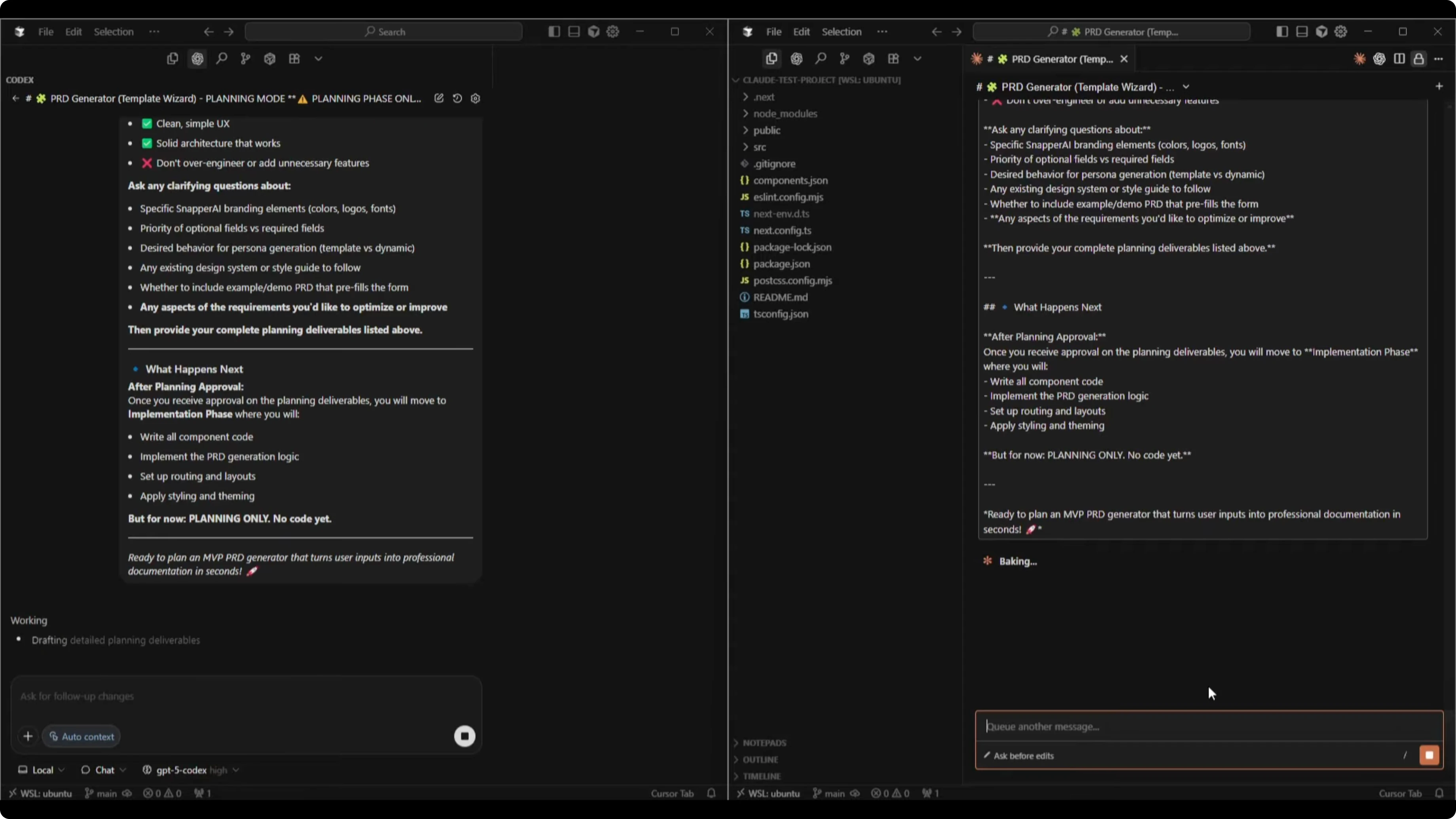 I prompted both to operate inside a blank Next.js TypeScript Tailwind project. I told them to plan a small web app called PRD Generator Template Wizard that turns structured user inputs into a fully formatted PRD using Snapper AI’s existing PRD template system. The prompt made it explicit that this phase was planning only with no code yet.