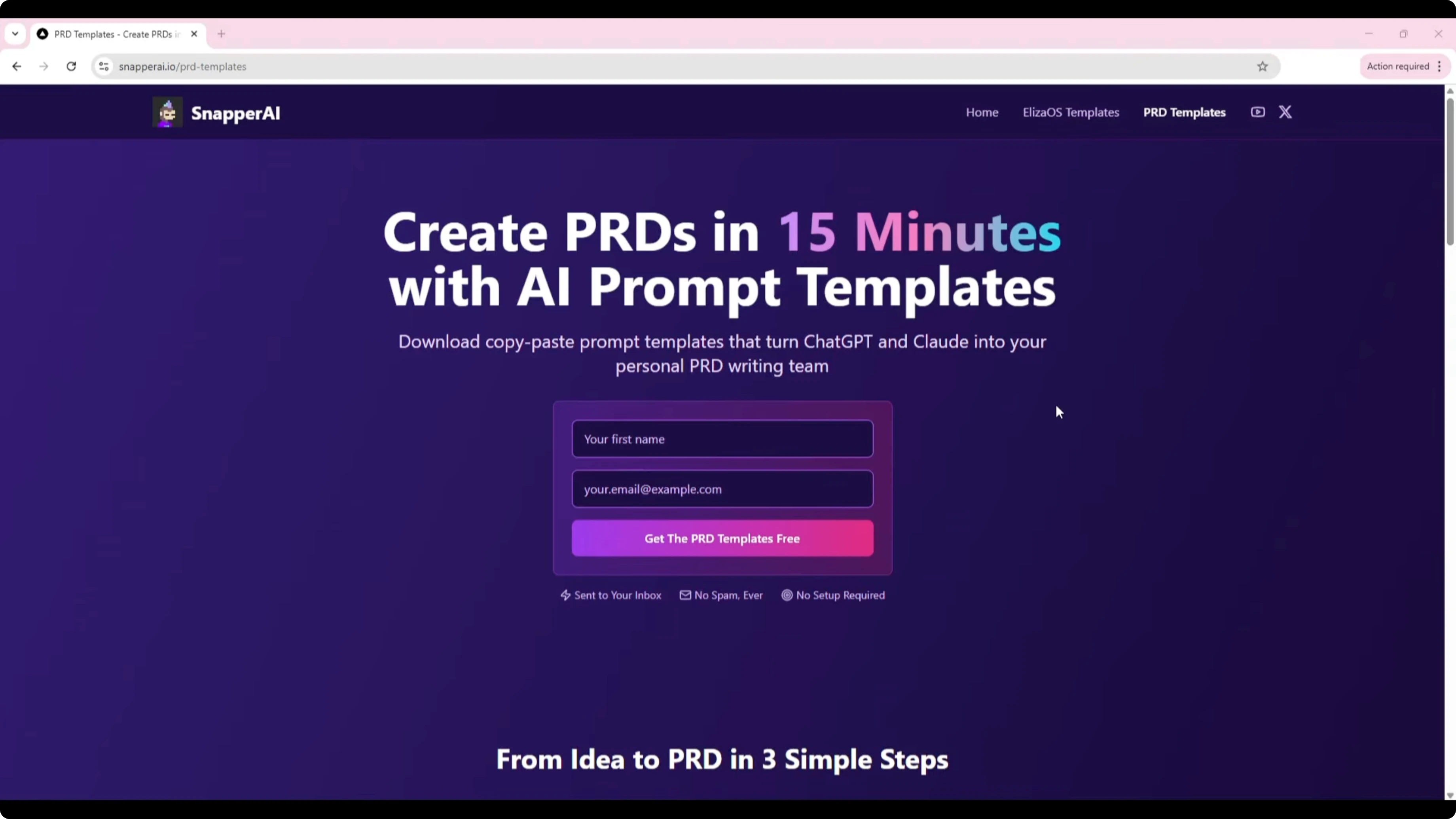 I had a specific app in mind: a PRD Generator Template Wizard. The idea came from my Snapper AI PRD templates page, which people currently use by copy-pasting prompt templates into ChatGPT and Claude. I wanted a simple form-based app that takes structured inputs and outputs a fully formatted PRD, removing all the manual copy-paste work.