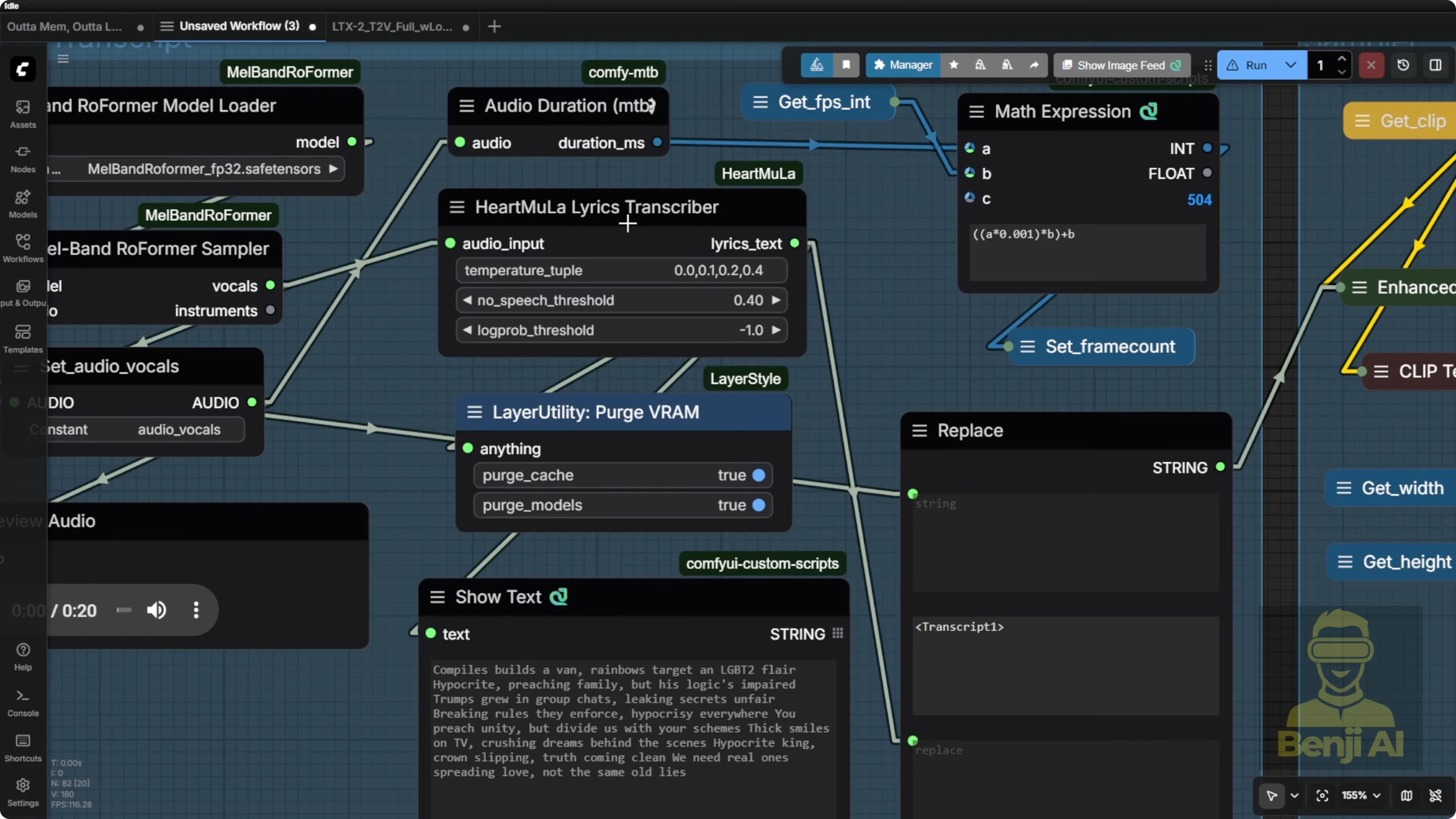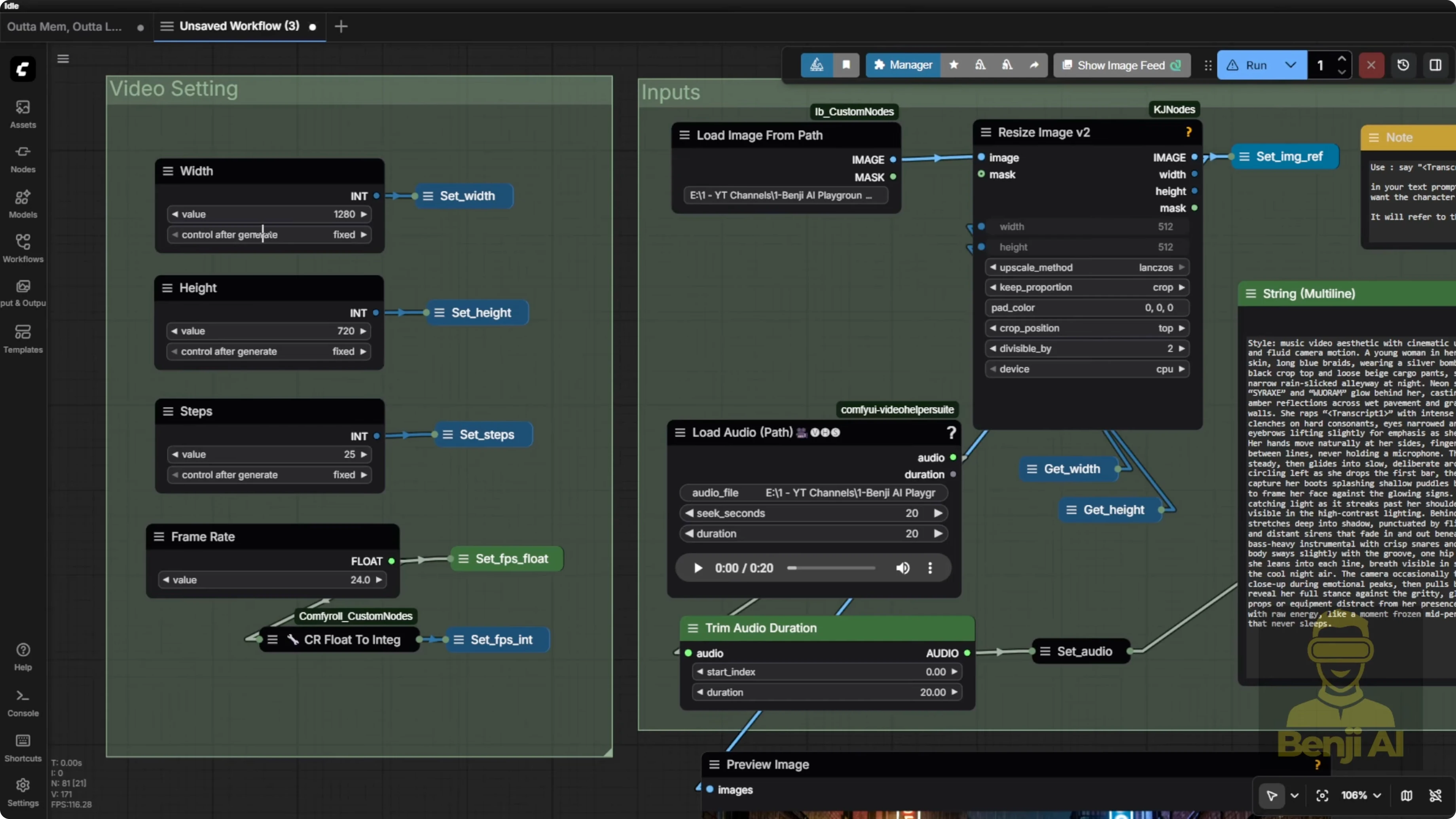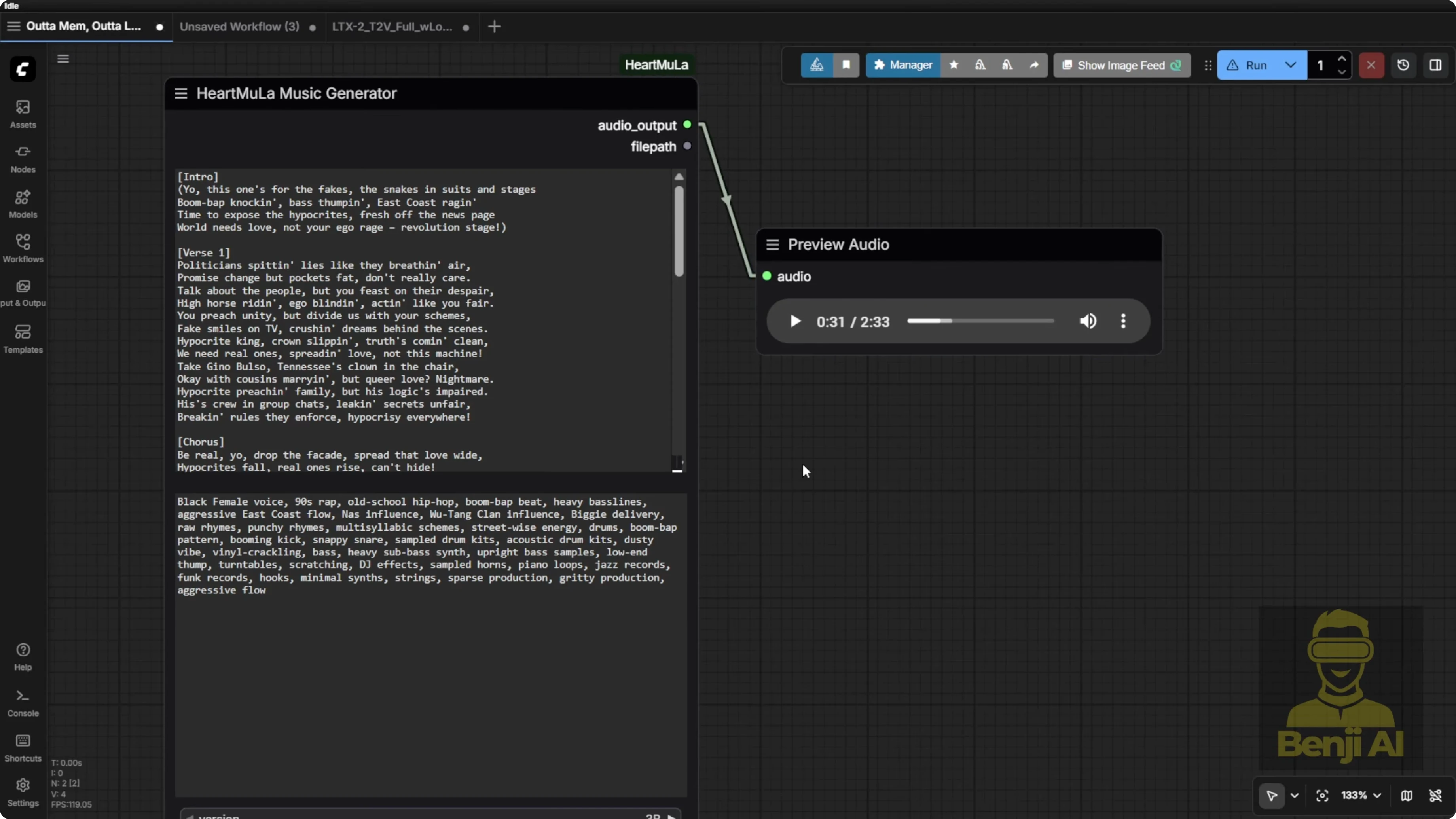 - Audio: I usually generate multiple audio clips and pick the best one first using the HeartMula music generator, then bring it back into the load audio node.