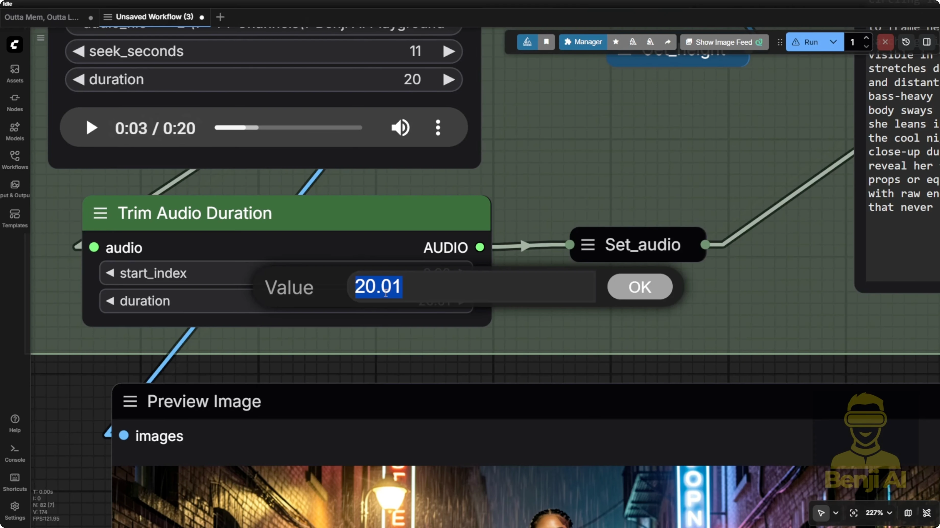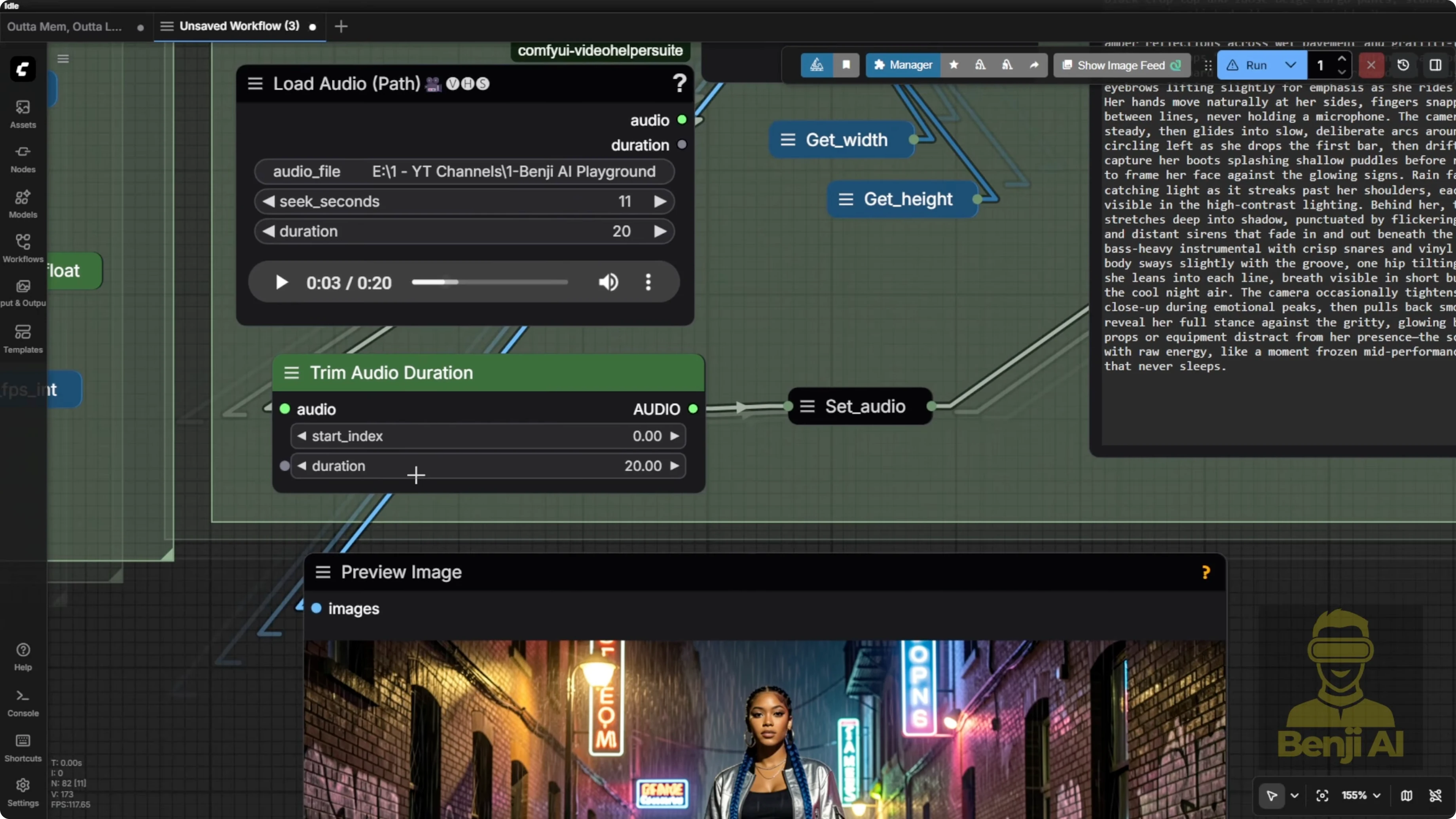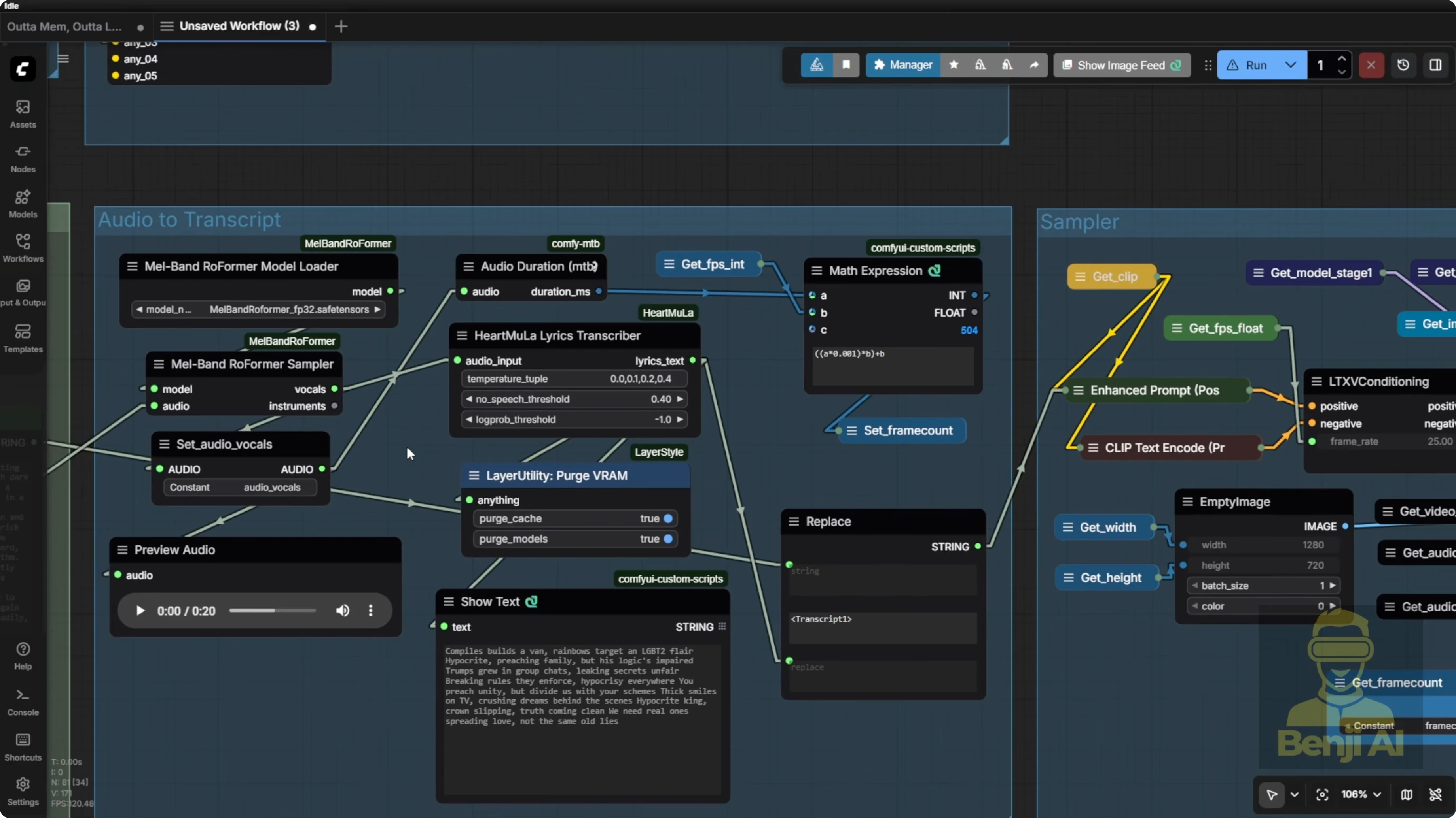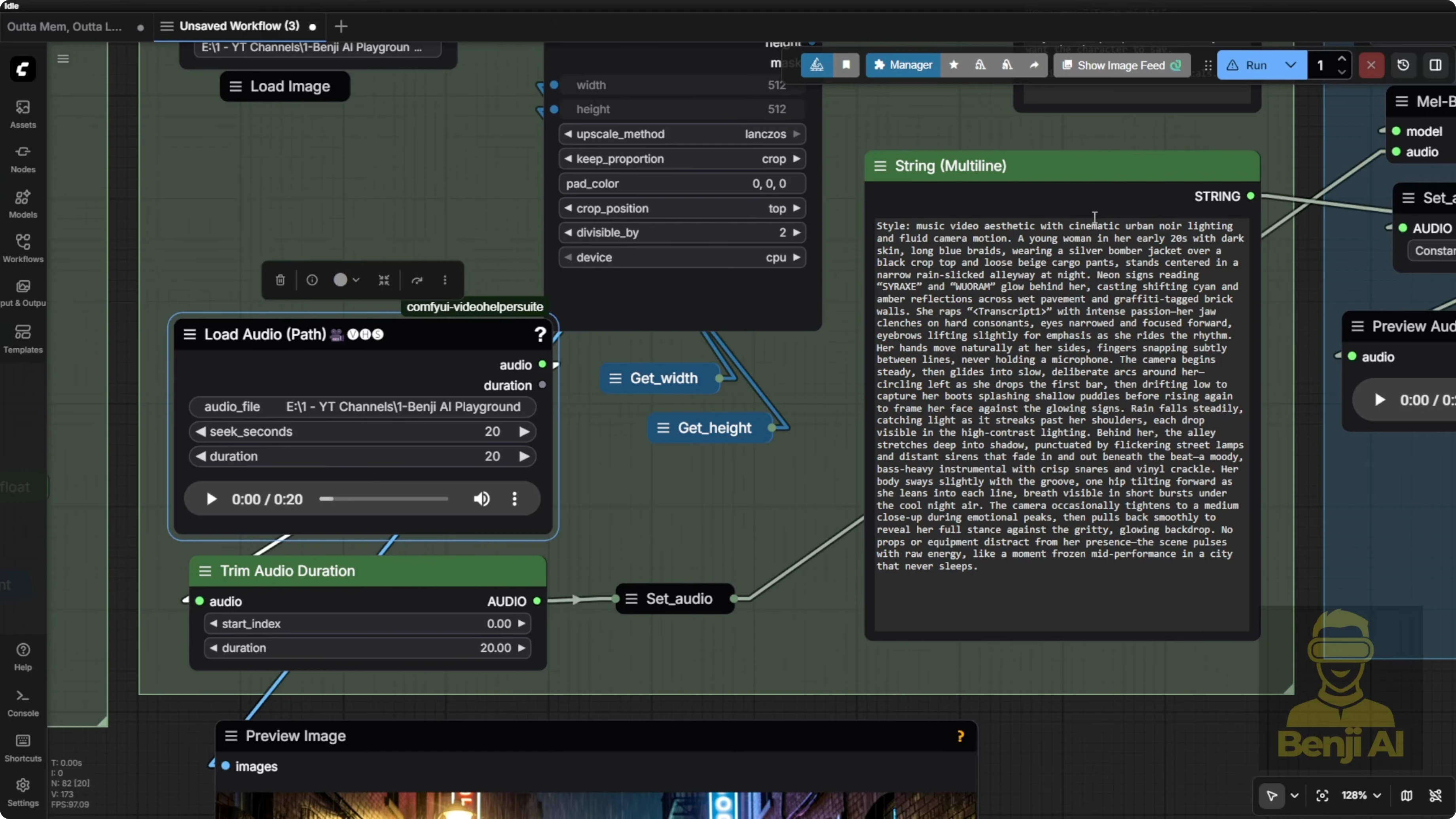 - Audio: I usually generate multiple audio clips and pick the best one first using the HeartMula music generator, then bring it back into the load audio node.