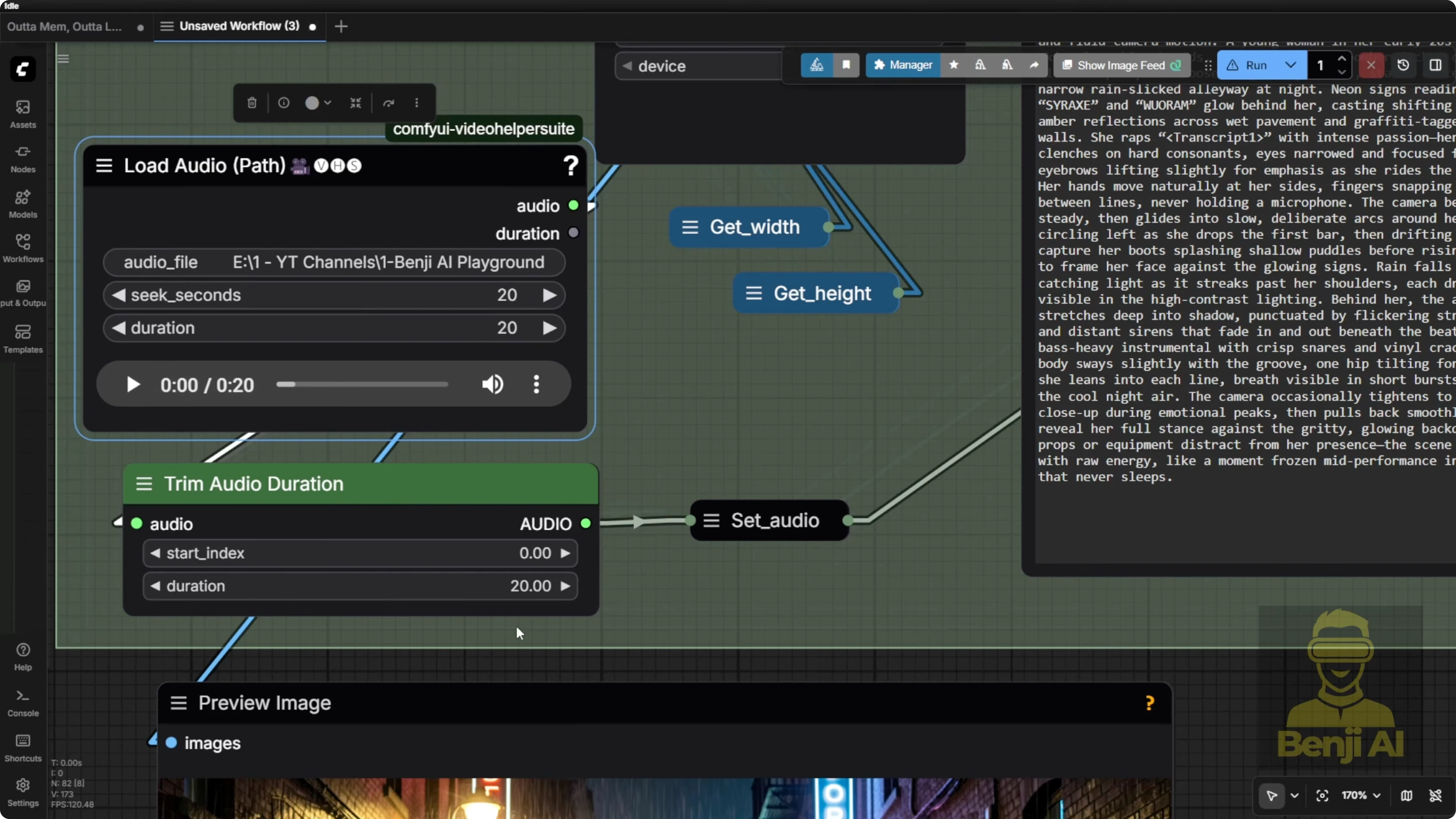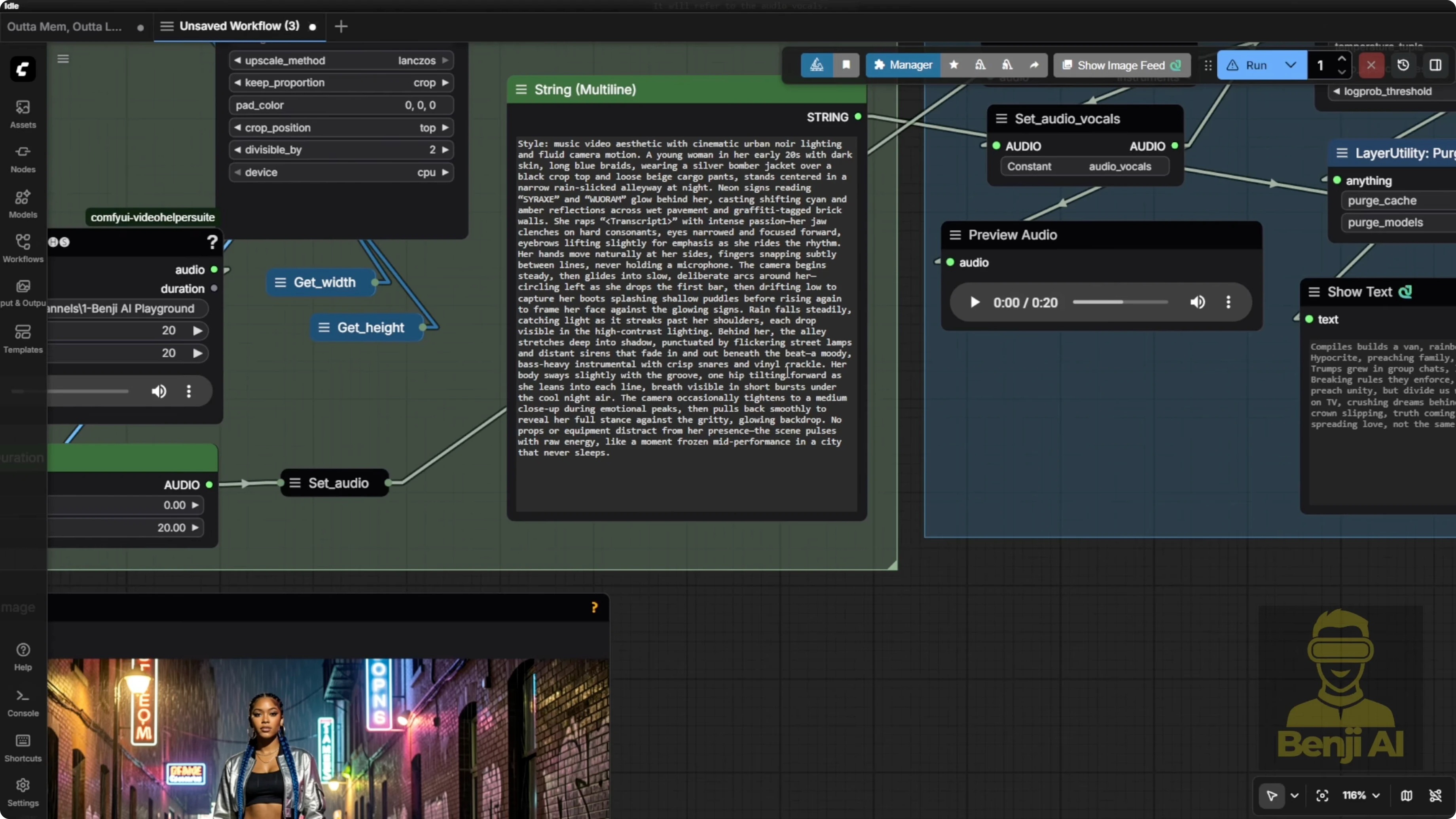 I could connect the music generator directly into this workflow, but you often need to fine-tune your lyrics a few times and try a few generations with different seed numbers or different setting combinations to get something really good out of this AI model. Sometimes it’s hit or miss. Maybe you don’t like the lyrics or you’re not vibing with the vocal voice. Switch up the seed numbers and try again to get a better result.