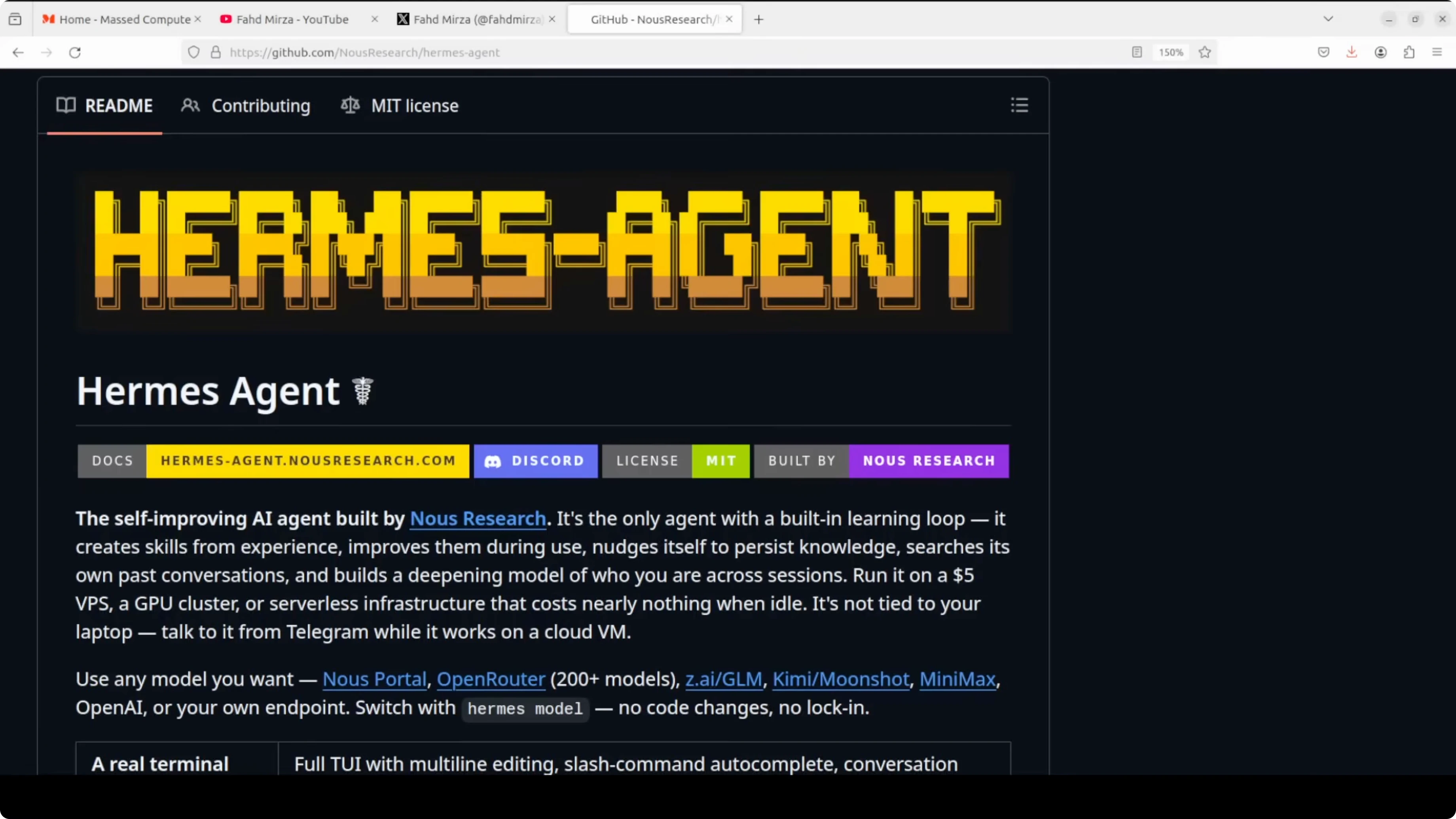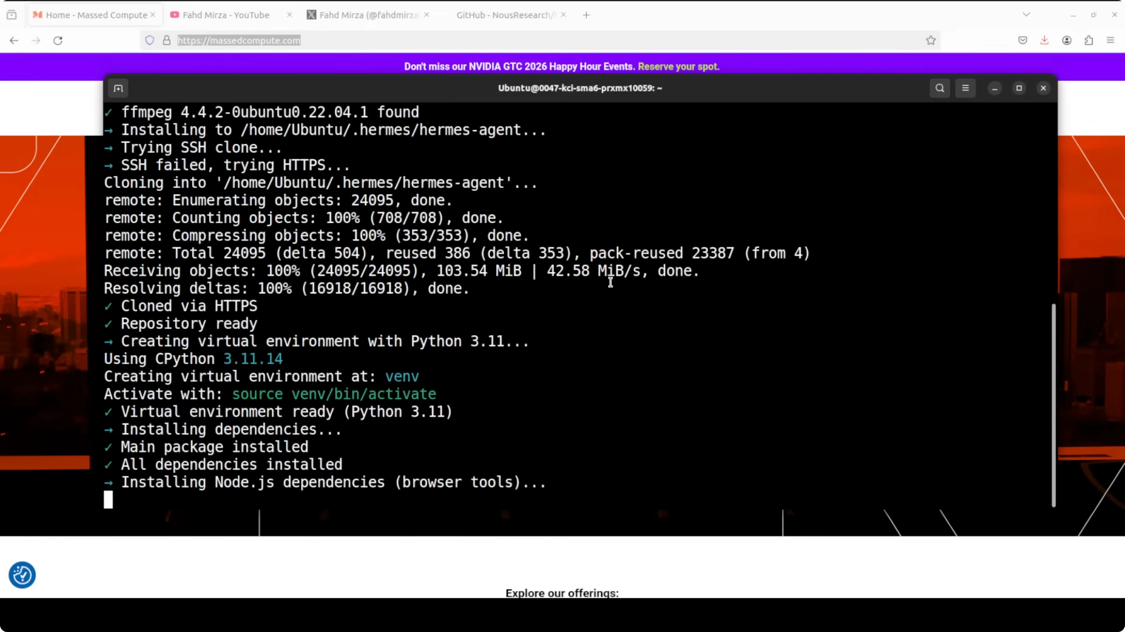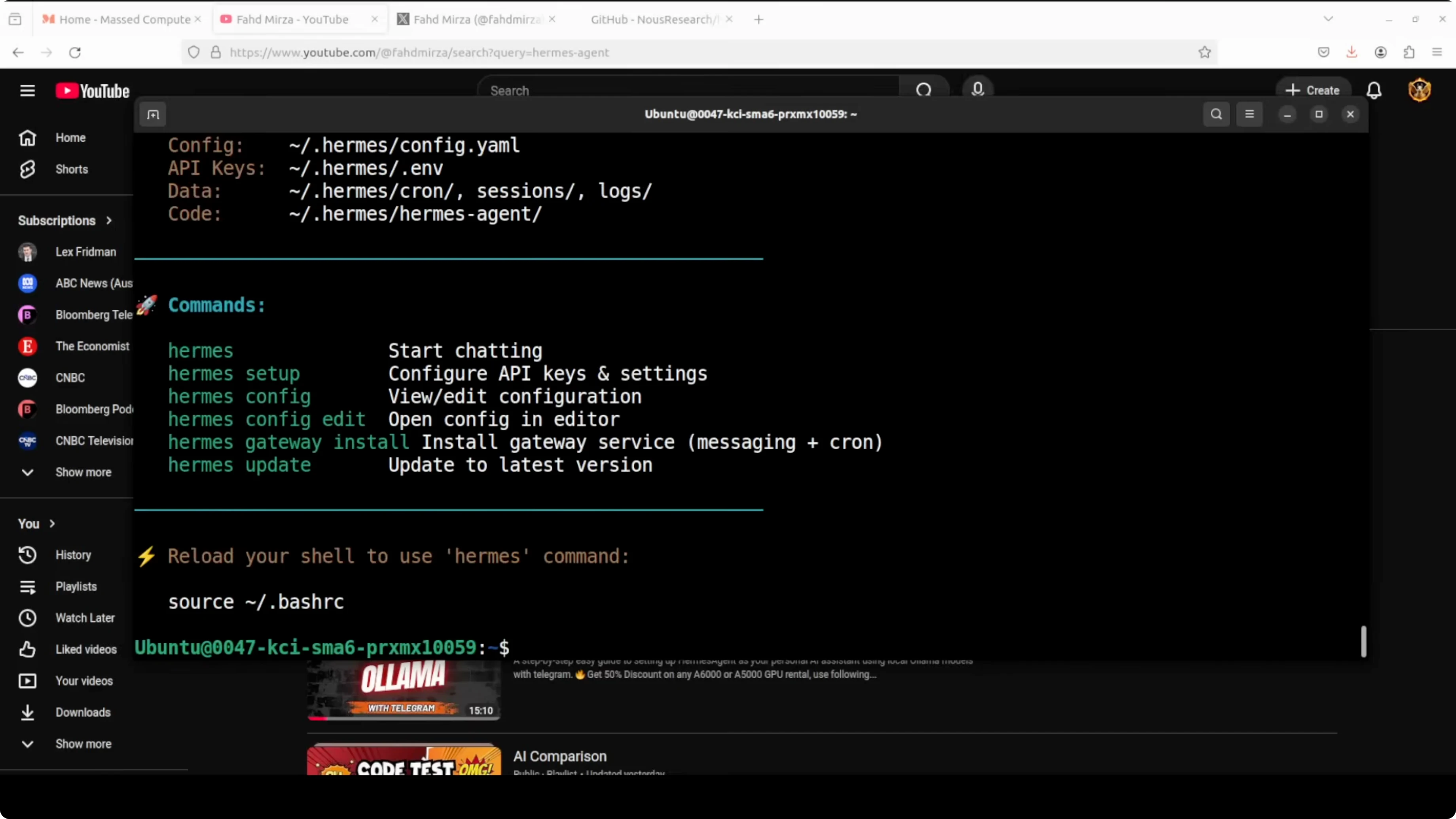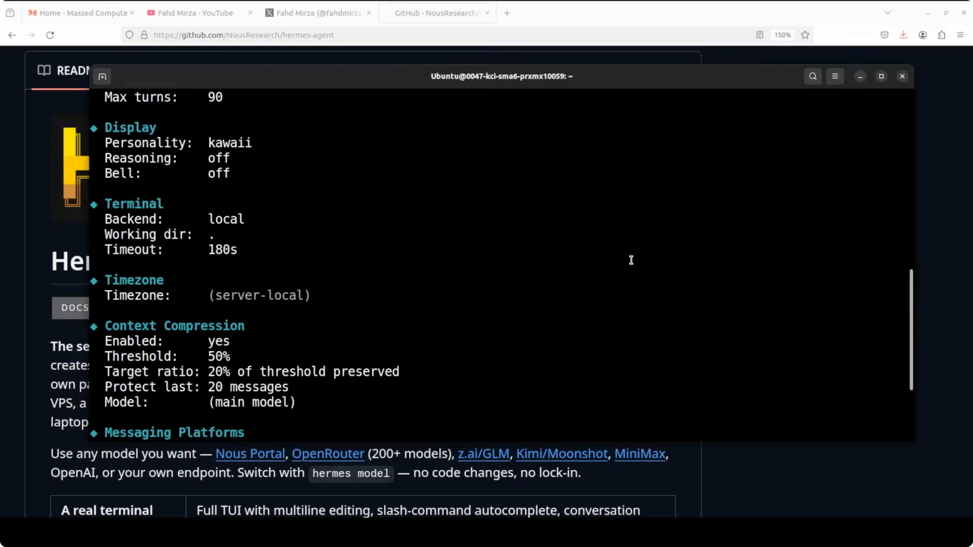 I installed Hermes Agent on Ubuntu. The installer checks prerequisites, but it is a good idea to already have uv, Python 3.11 or newer, and Node.js on your system to speed things up.