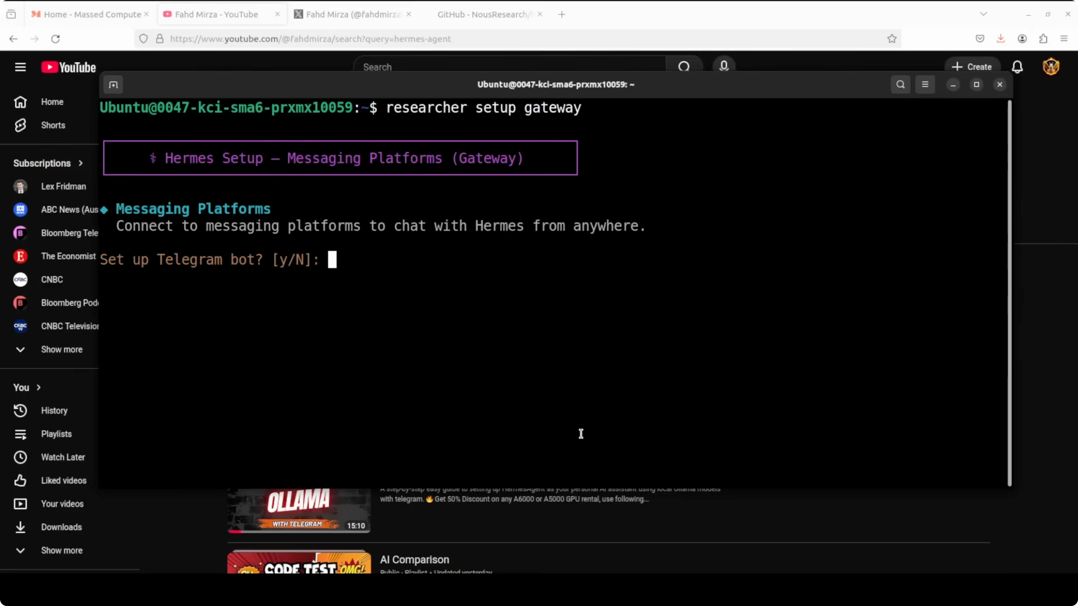 researcher setup gatewayCreate a Telegram bot with BotFather, copy the token, and paste it when prompted. I kept open access during setup, but for production you should restrict to known user IDs. I skipped channel ID and other gateways like Discord, Slack, Matrix, Mattermost, and WhatsApp.