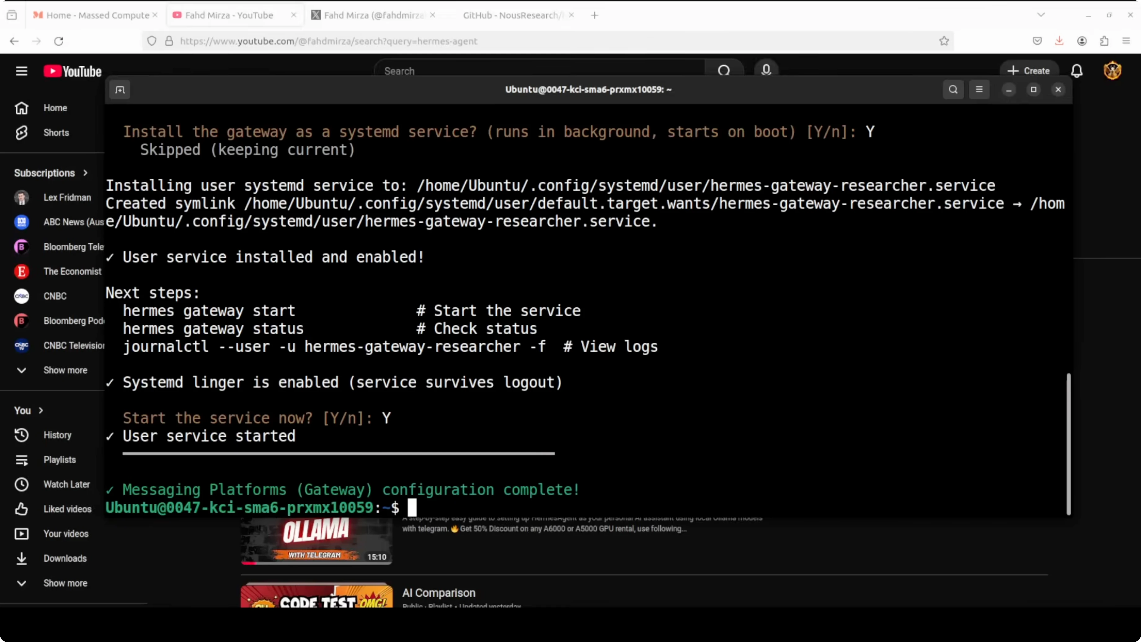 When prompted, install the gateway as a systemd service and start it. Pair the Telegram bot with the researcher profile by generating a pairing code from the bot chat and approving it.